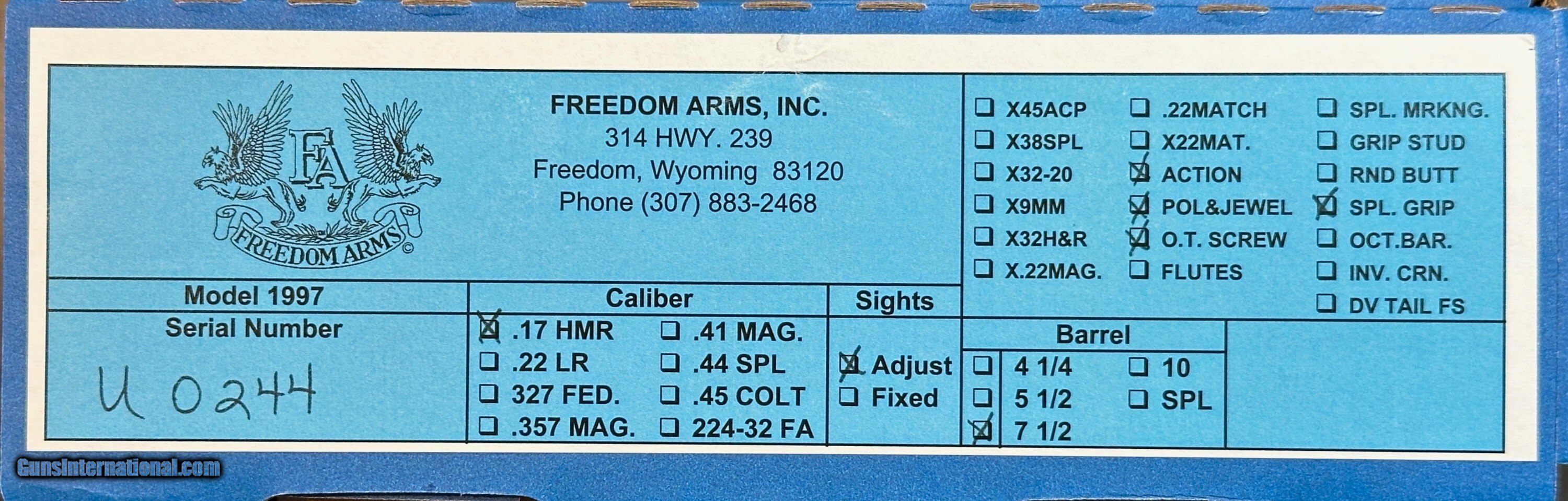 NEW FREEDOM ARMS MODEL 97 PREMIER GRADE 17HMR 7.5" BARREL W/ MANY UPGRADES