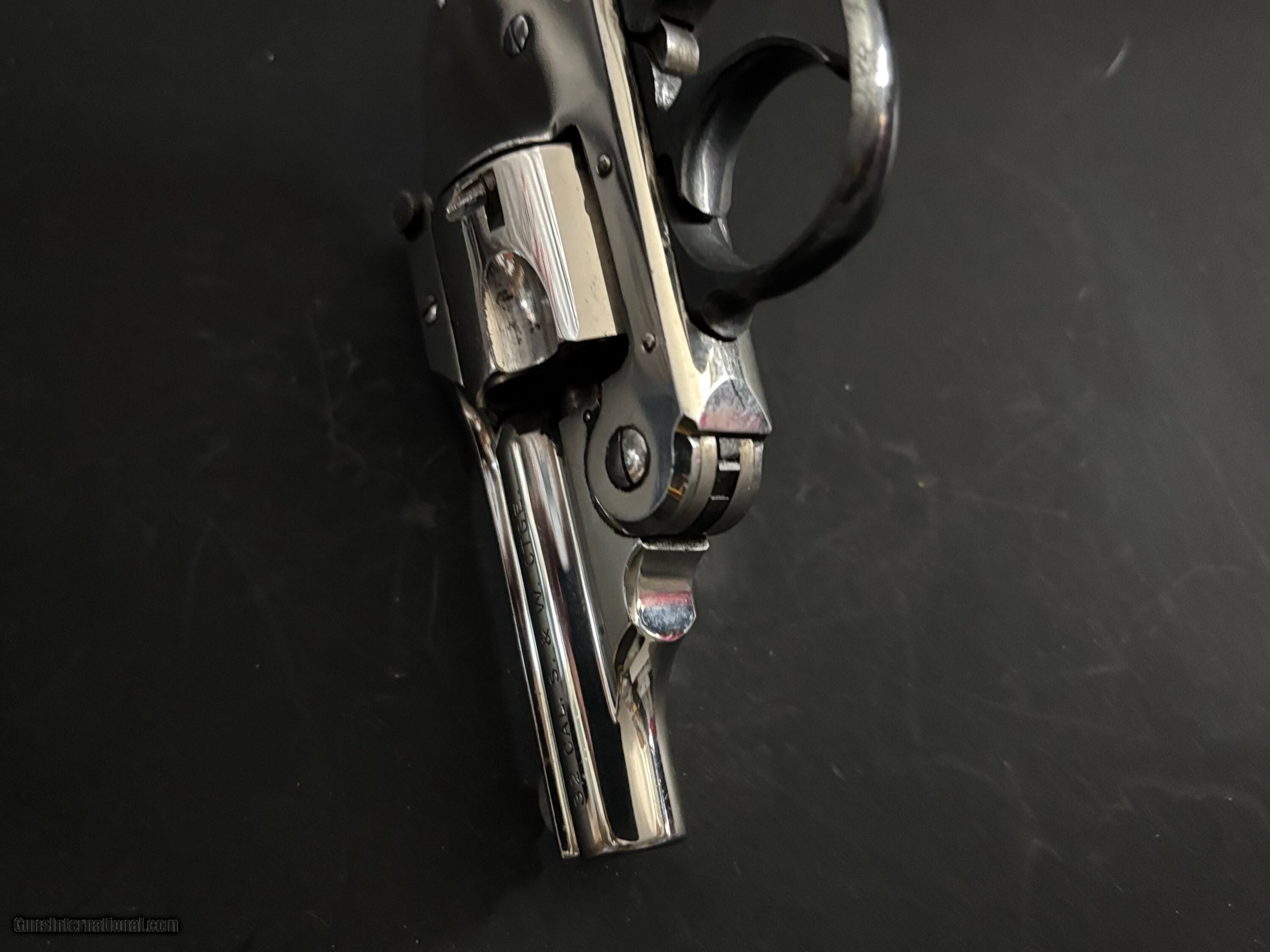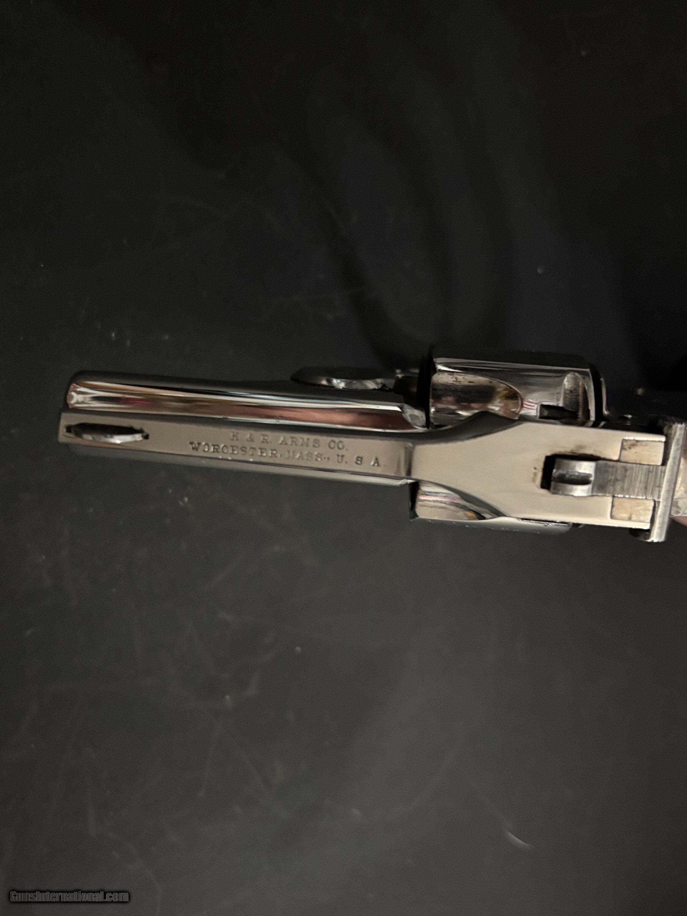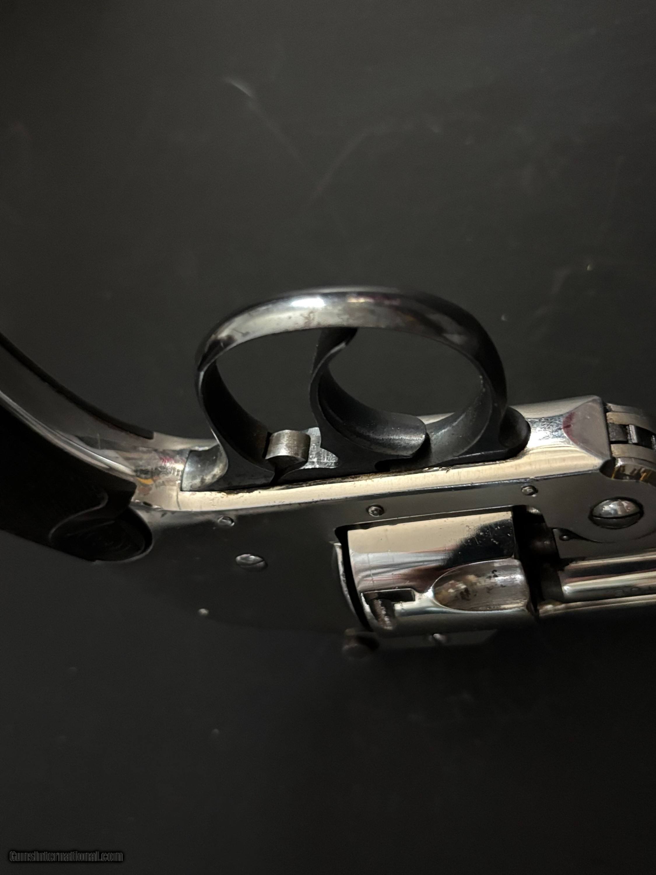Description: “Very super looking, nice condition” Harrington & Richardson small frame Hammerless Double Action Revolver. 2" barrel ( Bicycle model ). C&R OK Looking for a classic piece of American firearms history? If you're looking for an exceptional addition to your Harrington & Richardson or Top Break revolver collection, then this very rare H&R Second model .32 Double Action Top Break Hammerless Revolver might just be what you're looking for. This is a 2nd model , 9th variation, Serial number 194157. Small frame double action revolver Top break 5 shot Nickel finish Matching numbers Double top post barrel latch auto shell ejecting .32 S&W short Smokeless powder Top of Barrel marked: H & R ARMS CoWORCESTER MASS. U.S.A. Left side of barrel: 32 CAL S&W CTGE Condition: 3” raised rib barrel with a very good bright excellent bore showing light oxidation with strong rifling. Front and rear fixed sights. The metal surfaces retain about 99% of the original nickel finish showing scattered handling marks and edge wear. Trigger guard retains most of the original blue and trigger show some case hardened colors. The original hard rubber checkered grips include the H&R fired target logo with a rosette around the screw escutcheons. The grips are in excellent condition showing just light handling marks. All the correct parts, barrel, cylinder, ejector, and frame are serialized to the gun. All barrel markings are clear and legible. Barrel to frame fit is tight and mechanically works excellent with very good timing and lock-up The trigger return spring is broken or missing so you need to use your thumb to reset it. The current condition of the item listed has been described to the best of my ability . Please examine the photos , text thoroughly and make sure to ask any and all questions prior to . This firearm is an excellent looking example of a rare and historically significant firearm from the late 19 century and would make an exceptional addition to any collection. Don't miss your chance to own a piece of history – Whether you're a firearms collector, a history buff, or just looking for a unique piece to add to your gun collection, this H&R top break revolver is sure to impress.