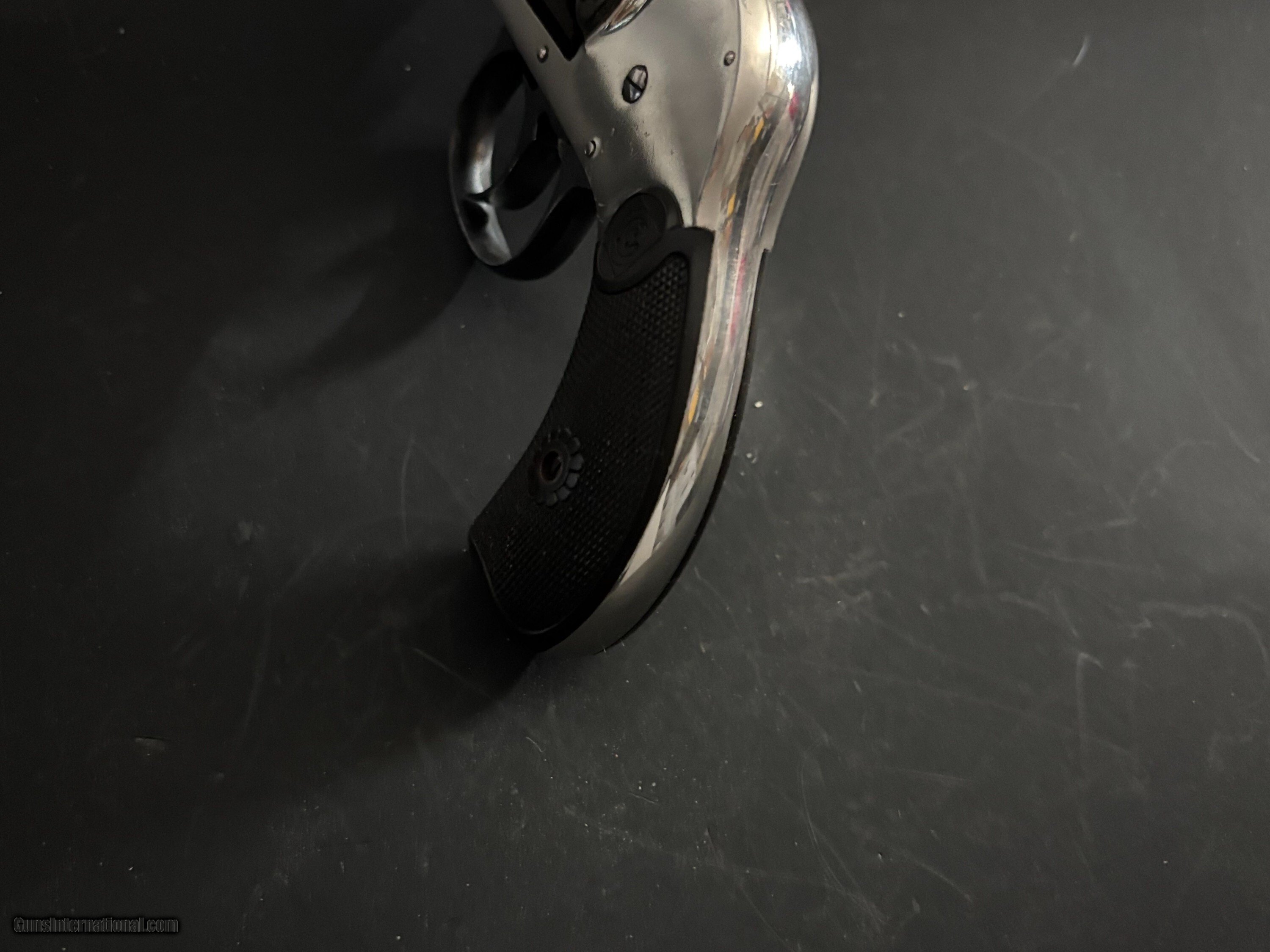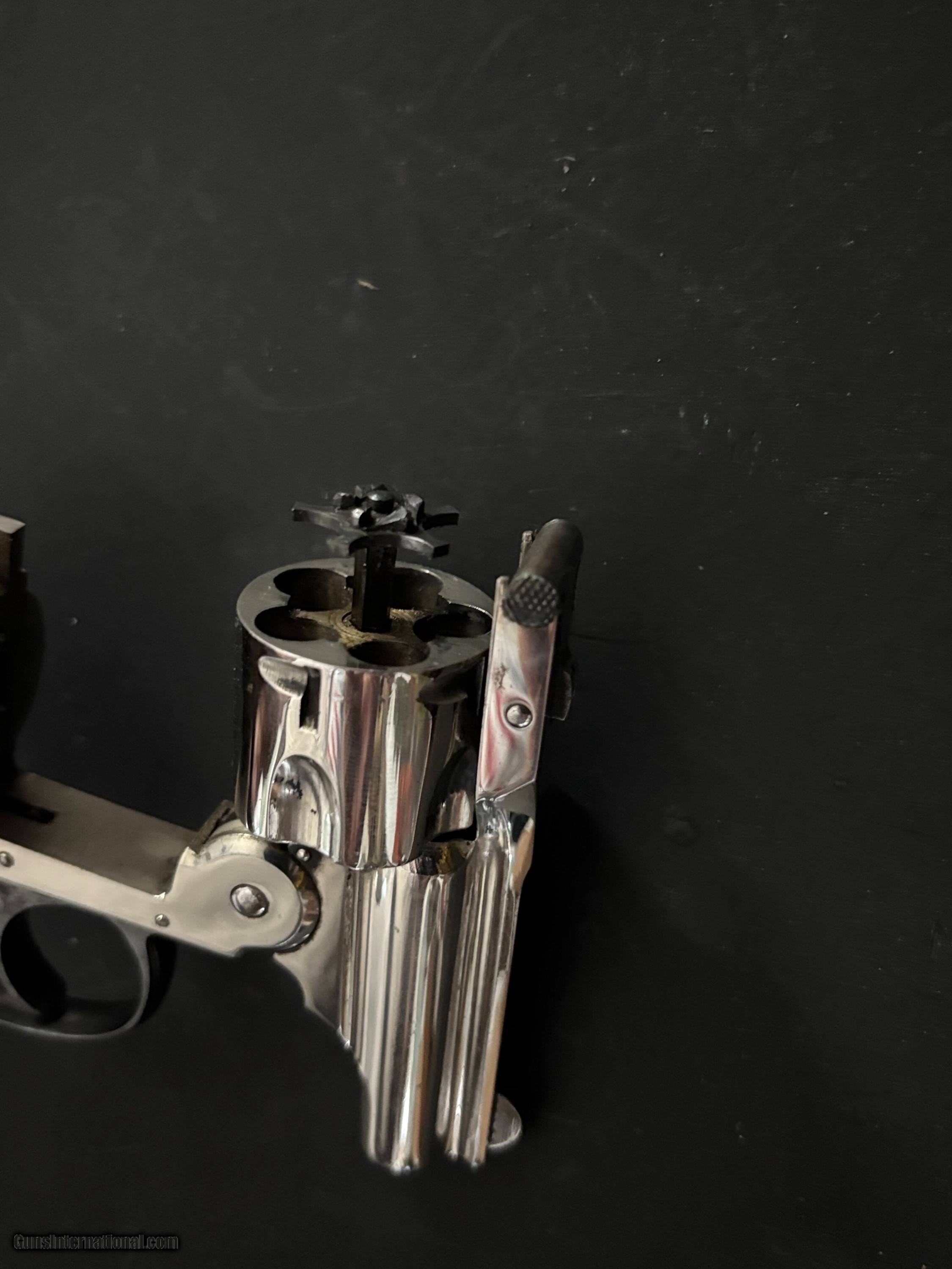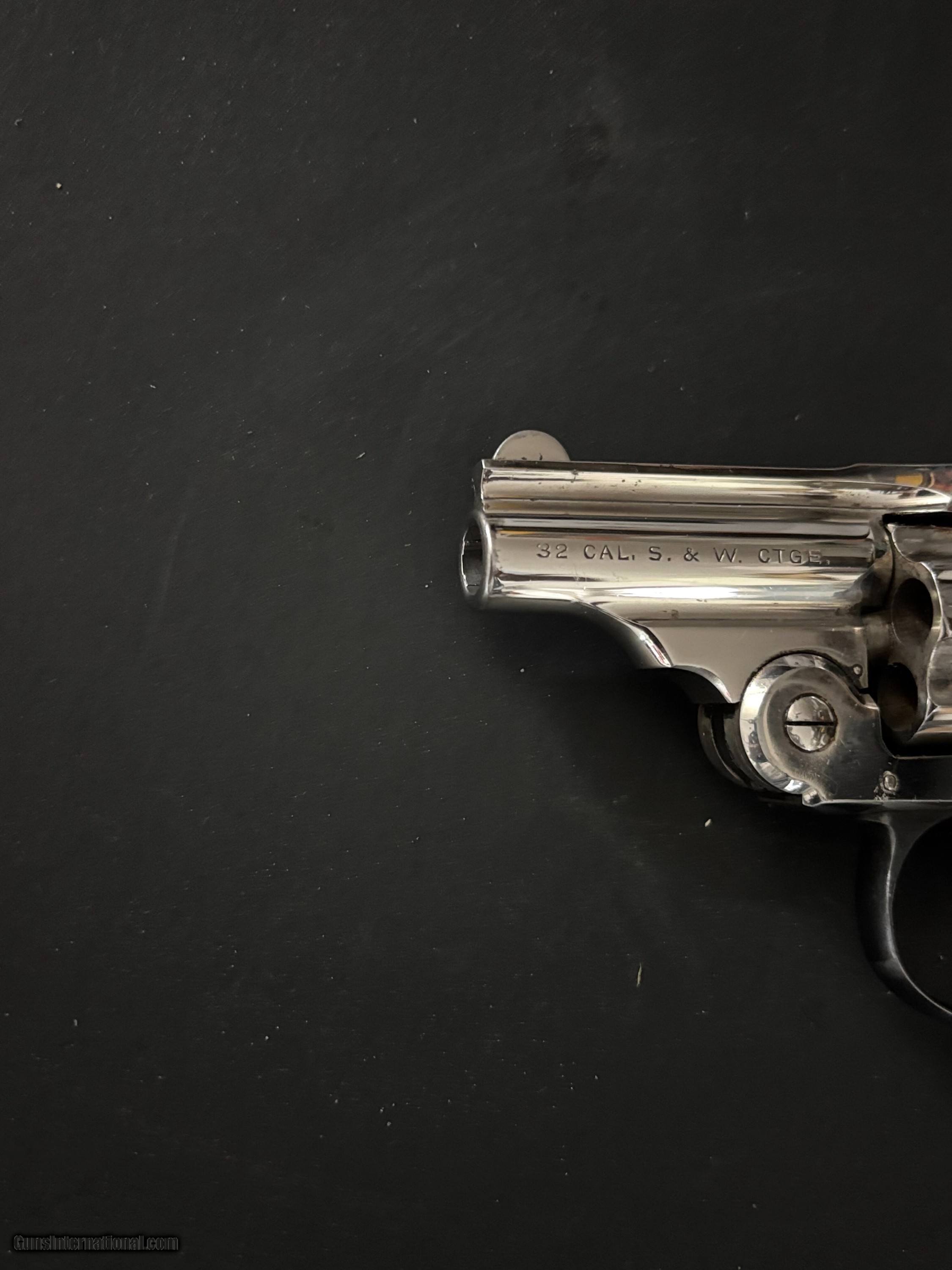 Description: “Very super looking, nice condition” Harrington & Richardson small frame Hammerless Double Action Revolver. 2" barrel ( Bicycle model ). C&R OK Looking for a classic piece of American firearms history? If you're looking for an exceptional addition to your Harrington & Richardson or Top Break revolver collection, then this very rare H&R Second model .32 Double Action Top Break Hammerless Revolver might just be what you're looking for. This is a 2nd model , 9th variation, Serial number 194157. Small frame double action revolver Top break 5 shot Nickel finish Matching numbers Double top post barrel latch auto shell ejecting .32 S&W short Smokeless powder Top of Barrel marked: H & R ARMS CoWORCESTER MASS. U.S.A. Left side of barrel: 32 CAL S&W CTGE Condition: 3” raised rib barrel with a very good bright excellent bore showing light oxidation with strong rifling. Front and rear fixed sights. The metal surfaces retain about 99% of the original nickel finish showing scattered handling marks and edge wear. Trigger guard retains most of the original blue and trigger show some case hardened colors. The original hard rubber checkered grips include the H&R fired target logo with a rosette around the screw escutcheons. The grips are in excellent condition showing just light handling marks. All the correct parts, barrel, cylinder, ejector, and frame are serialized to the gun. All barrel markings are clear and legible. Barrel to frame fit is tight and mechanically works excellent with very good timing and lock-up The trigger return spring is broken or missing so you need to use your thumb to reset it. The current condition of the item listed has been described to the best of my ability . Please examine the photos , text thoroughly and make sure to ask any and all questions prior to . This firearm is an excellent looking example of a rare and historically significant firearm from the late 19 century and would make an exceptional addition to any collection. Don't miss your chance to own a piece of history – Whether you're a firearms collector, a history buff, or just looking for a unique piece to add to your gun collection, this H&R top break revolver is sure to impress.