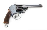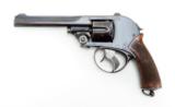 Kynoch Type 2 .476 caliber revolver. Schlund patent. Bore is fair. Action works perfectly. Double trigger. Lower trigger cocks the gun. Upper trigger fires it. Grips are very good. Gun in rare with approximately 100-200 made. Very good overall condition.