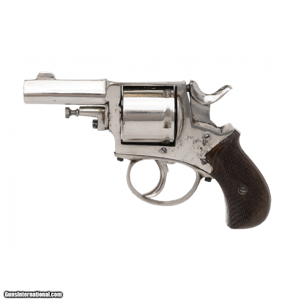 Belgian copy of a British Bull Dog revolver. Double action functions properly. Approximately 97% nickel finish. Cylinder has Belgian proofs.