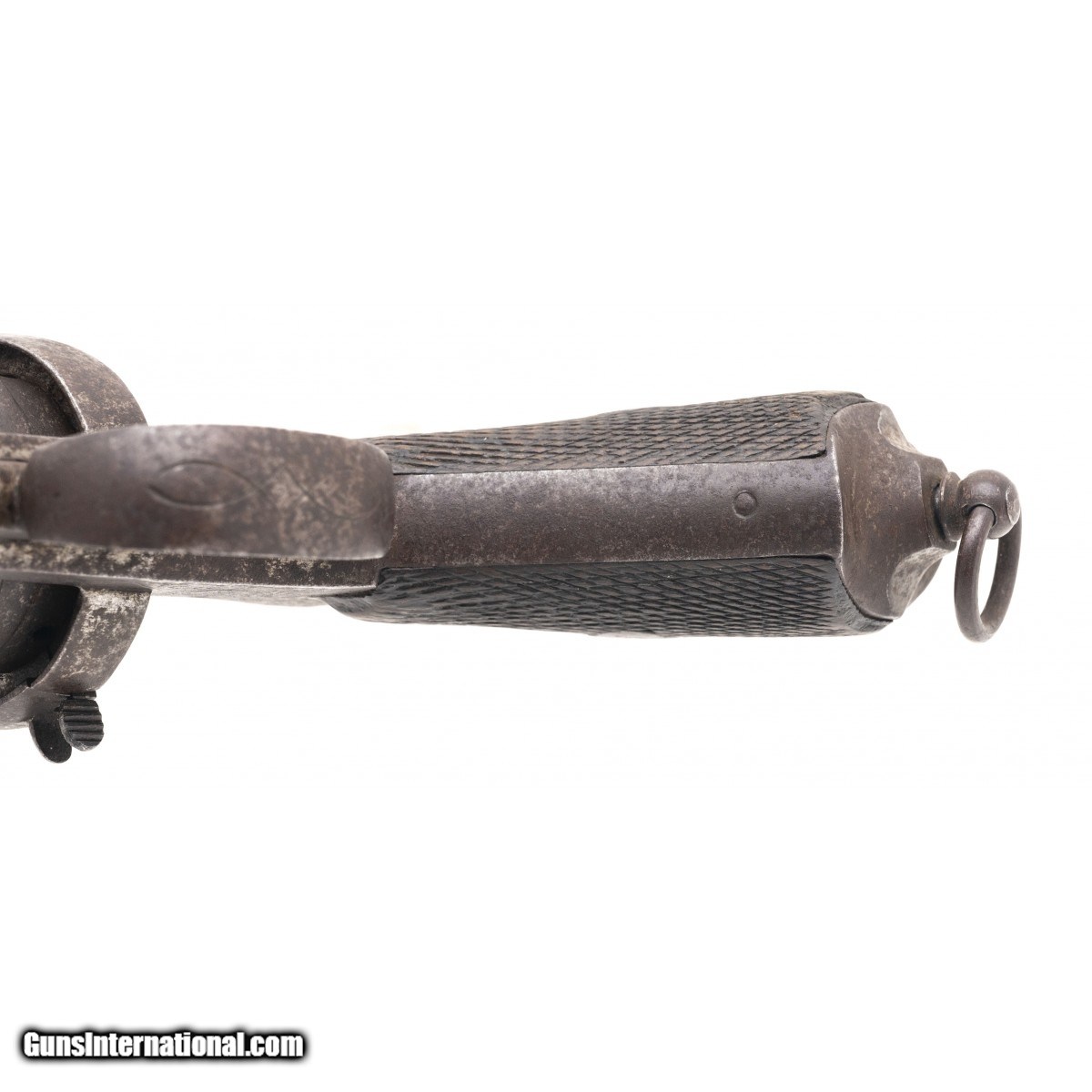 Description: " Serial No. 16647, circa 1860's, 12mm, 5.5"" round barrel. Metal is a dark brown patina with surface oxidation noted throughout. Bore has pitting, frosting visible in grooves. Rifling remains strong. Brown checkered grips are dark with handling and usage wear noted. Action functions but trigger needs to be reset manually for DA to work. CONSIGNMENT SOLD Antique: Yes |