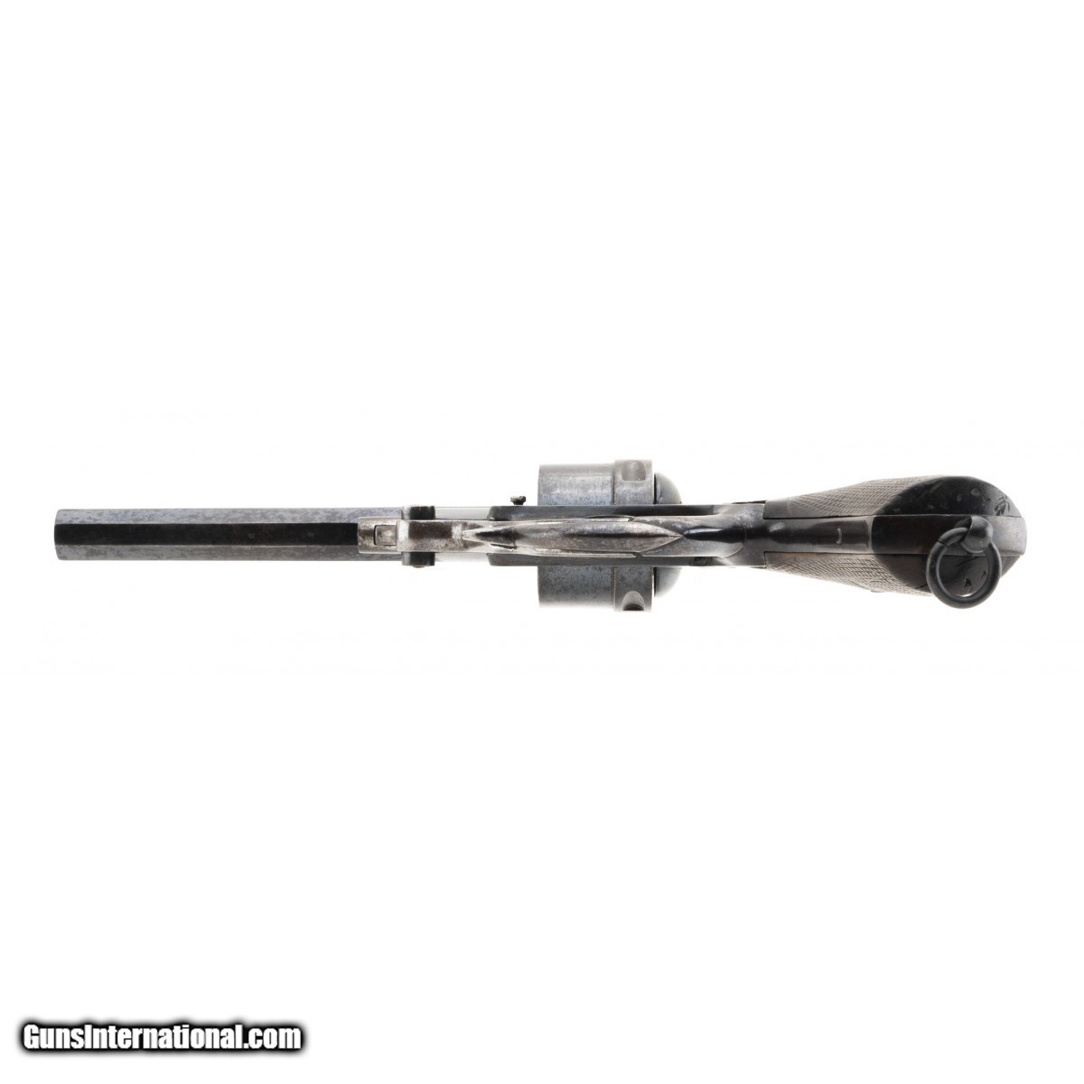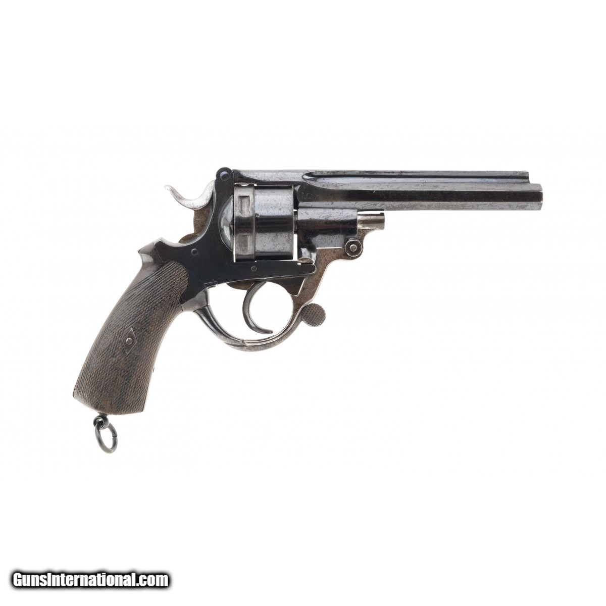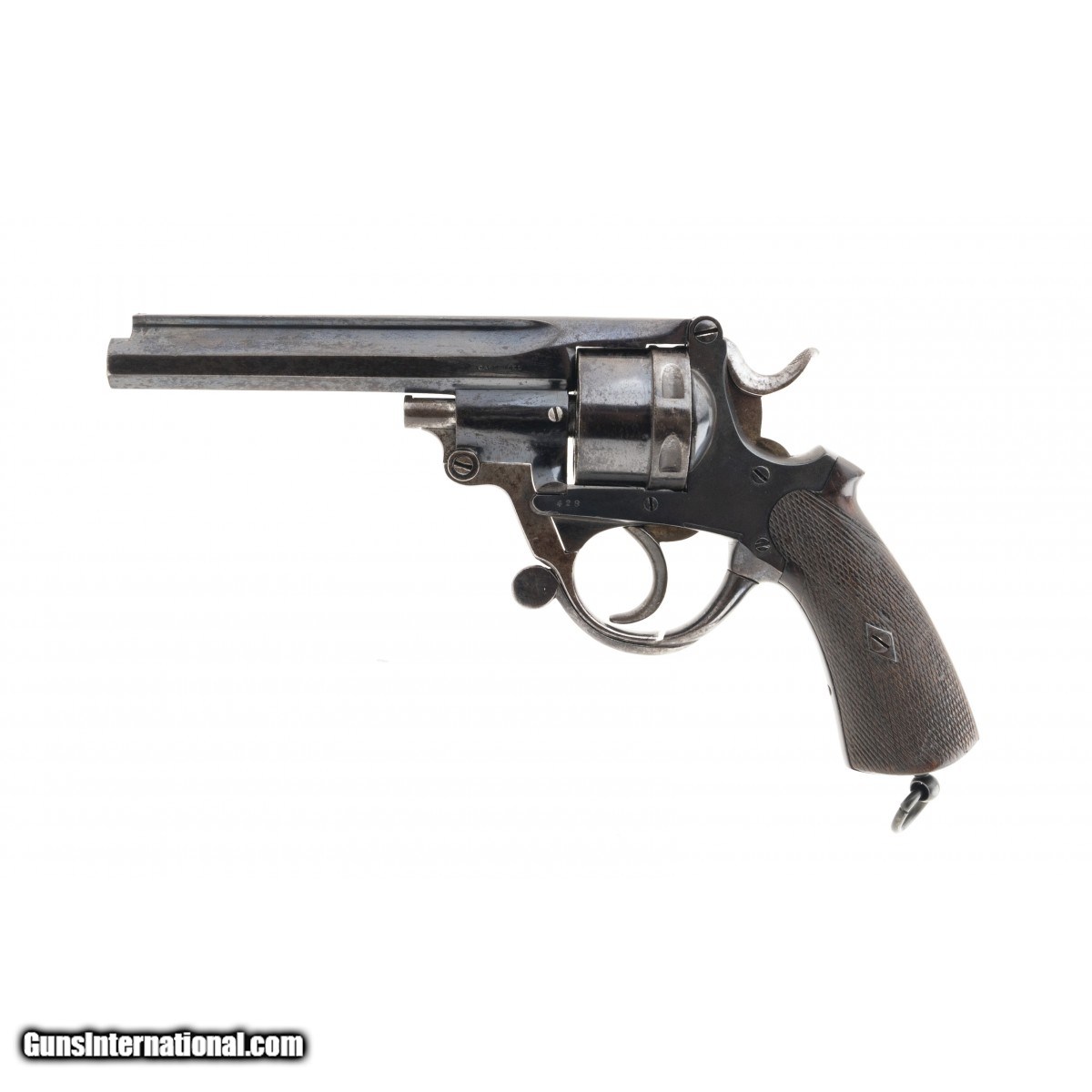 This is a model 1870 designed by Fagnus & CIE Belgium. These revolvers are often mistaken for a Galand revolver. The lever below the trigger guard swivels to the side and the front bow of the trigger guard pivots forward allowing the hinged barrel and cylinder to swing up and back for loading the front bow of the trigger guard can then be pushed forward to allow the cylinder ejector to push out thus ejecting the spent casing. This very unusual revolver works perfectly in single or double action. The barrel is 5.75"" and has a slim rib with a narrow channel. The grips have some wear and are not cracked or repaired. The bottom of the butt has a stud with lanyard ring, suggesting possible police or military use. Barrel is marked in small lettering ""Cast Steel"". Serial number is 428 but this is the only example we have seen in 60 years!