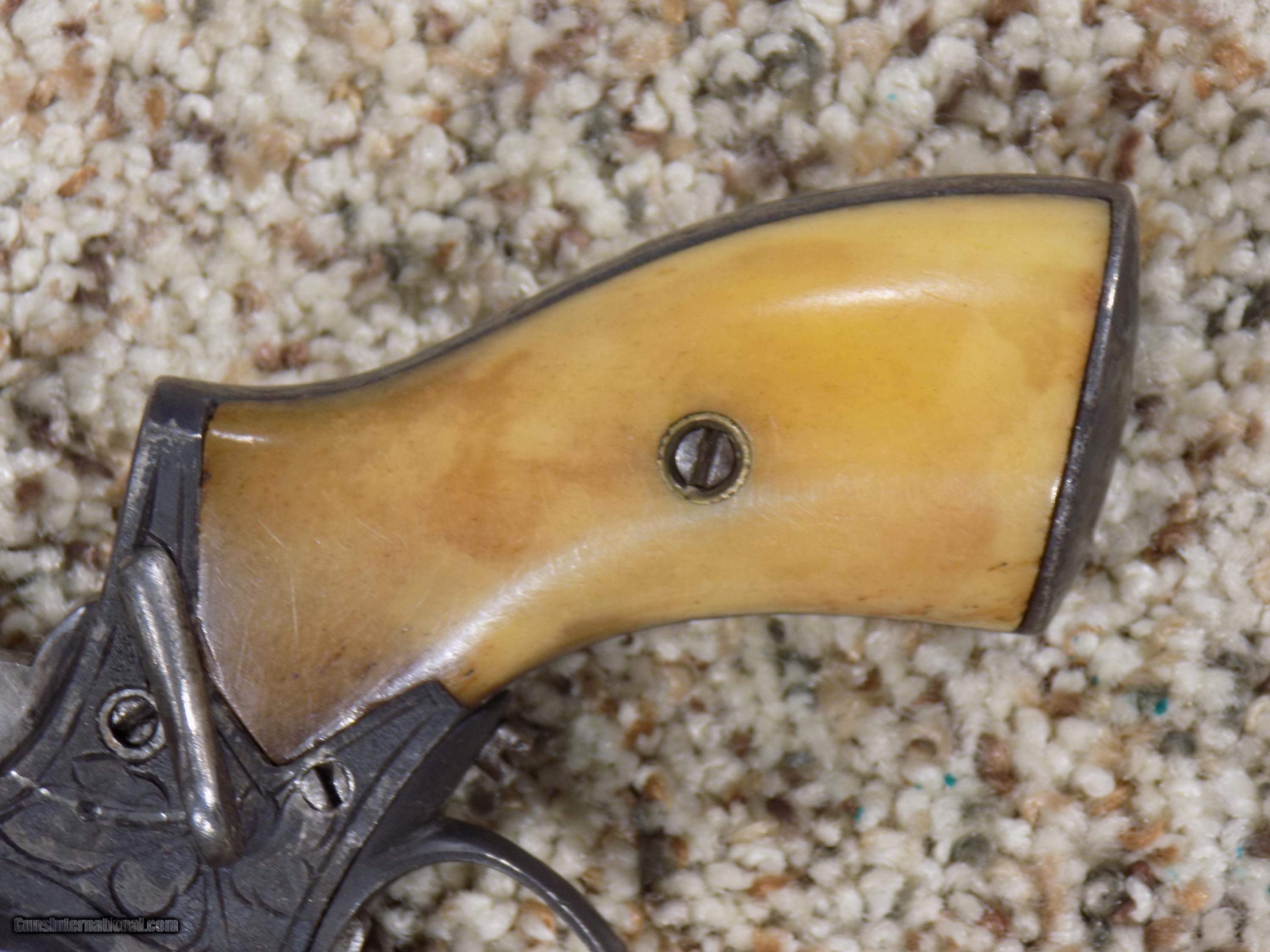 Description: #525AP BELGIAN ENGRAVED 32 CAL. SIX SHOT REVOLVER, SN 20XX, bone grips in VG condition, everything engraved except the bbl., nickel finish is mostly gone, turning dark brown patina, pea size chip missing out of top of right grip, works most of the time, lanyard ring is missing. $250 SOLD Antique: Yes |
