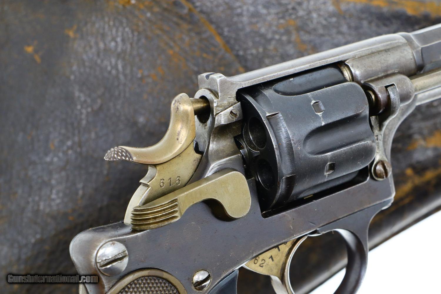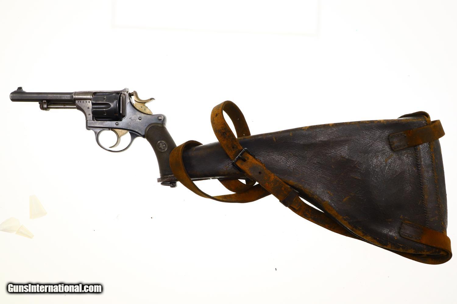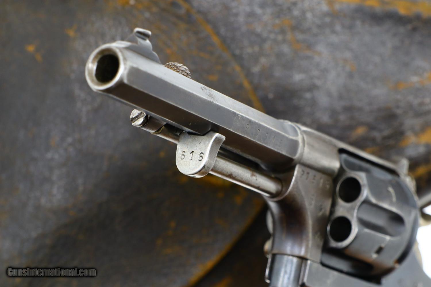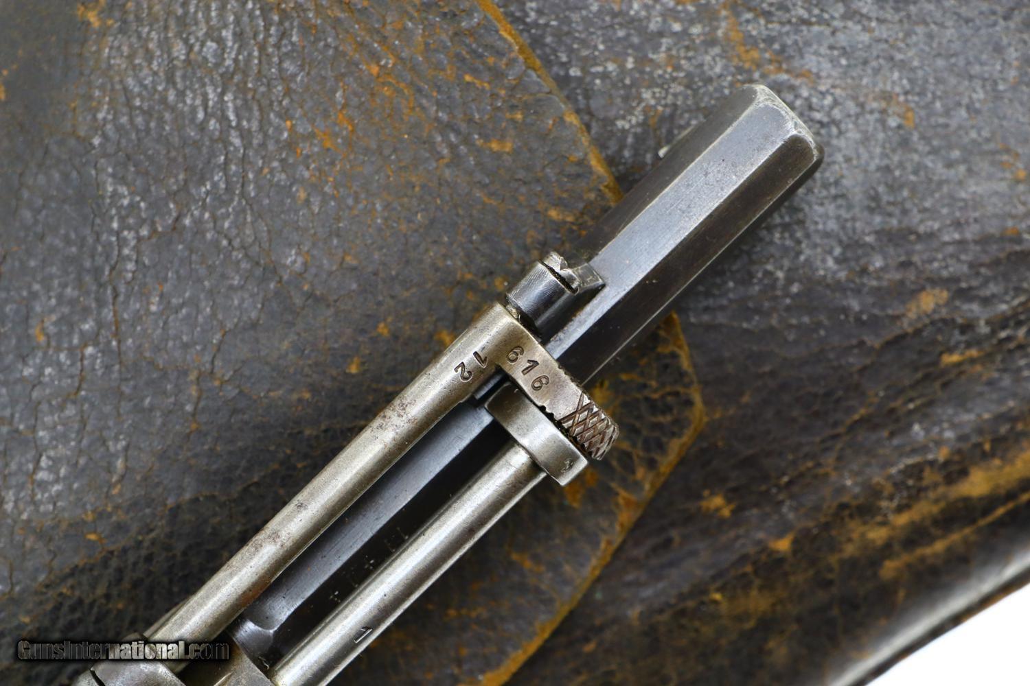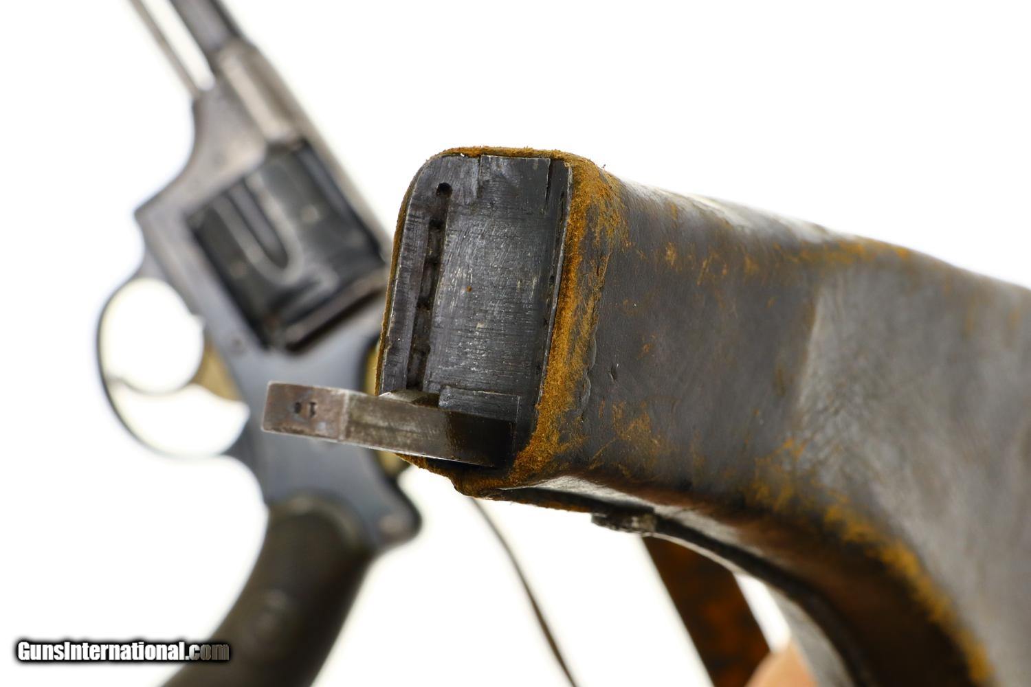 Description: Swiss Bern 1882 Commercial Revolver with stock, caliber 7.5mm. Major and minor components are externally matching, except the loading gate that is unnumbered, likely a replacement. Correct hard rubber grips, rotatable lanyard ring. Original Bern-manufactured shoulder stock that is "perfect" fit. Synopsis: Bern, Swiss 1882, Commercial Revolver, Stocked, Antique Condition: VG with original rust blue, faded and with sharp edge wear and oxidative speckling as one might expect from a firearm that has seen moderate use. Crisp grips with a few small areas of blunted checkering, right panel, but no splits or cracks. All cylinders lock up properly. Bright bore with sharp rifling. Comparable condition shoulder stock with tightly fitting lug that secures properly. Leather oil stained, with considerable crazing as photographed, one of shoulderstraps with small tear at holster insertion. A VG example of an early, classic, Swiss commercial 1882 revolver, rare with original shoulder stock, and even better that the rig is an antique! ~~Insured shipping fee of $75; most packages shipped using FedEx 2nd Day.~~ SOLD Manufacturer: Bern Serial Number: P7616 Caliber Info: 7.5mm |
