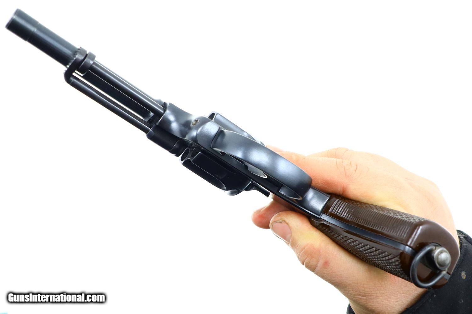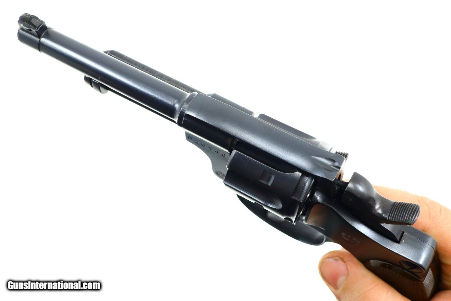 Description: Standard configuration 1929 Commercial revolver, many issued to the Zoll (border patrol) with 4.5” barrel having a drift adjustable front sight and a fixed rear sight. “W/F” logo on left frame in front of trigger guard. Prominent cross in shield just above the grip. Full serial number on left side of frame, the last three digits repeated on the barrel, cylinder, hammer, trigger, axle pin, and loading gate. Salt blue finish, all matching parts including the cylinder, cylinder pin, hammer and loading gate. Checkered brown grips. Lanyard ring present. Synopsis: Swiss Bern 1929 Commercial revolver, brown grip, one of very few revolvers manufactured for commercial sale. Condition: Excellent, 98+% original salt blue with minimal holster wear. Mirror bore. Perfect manual mechanics, each cylinder indexing properly with tight lock-up. ~~Insured shipping fee of $45; most packages shipped using FedEx 2nd Day.~~ SOLD Manufacturer: Bern Serial Number: P26146 Caliber Info: 7.5 mm |
