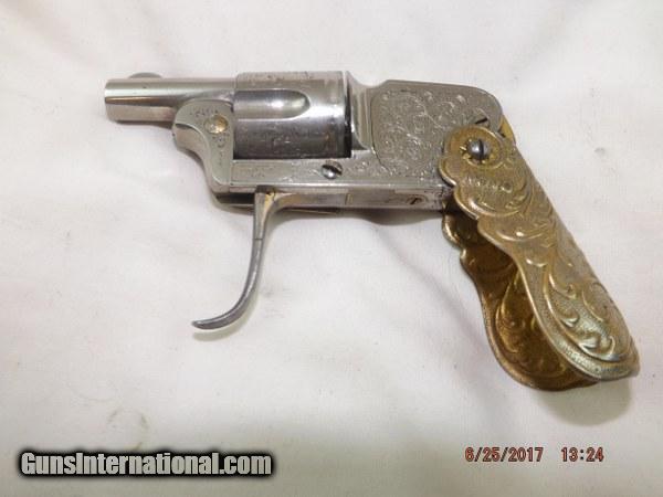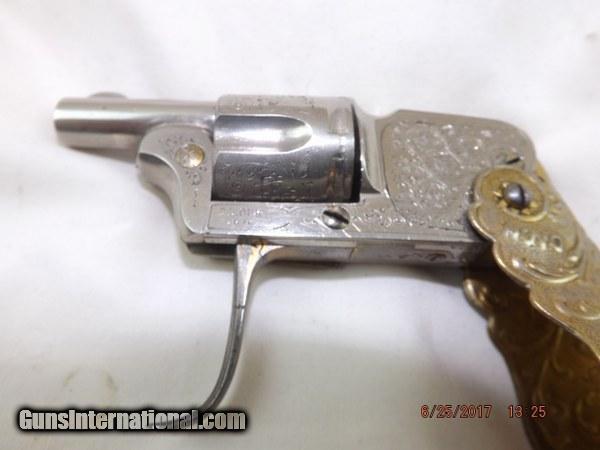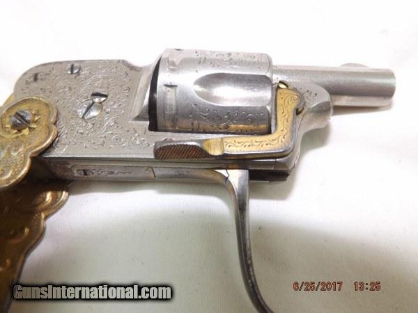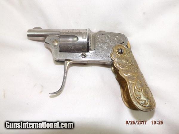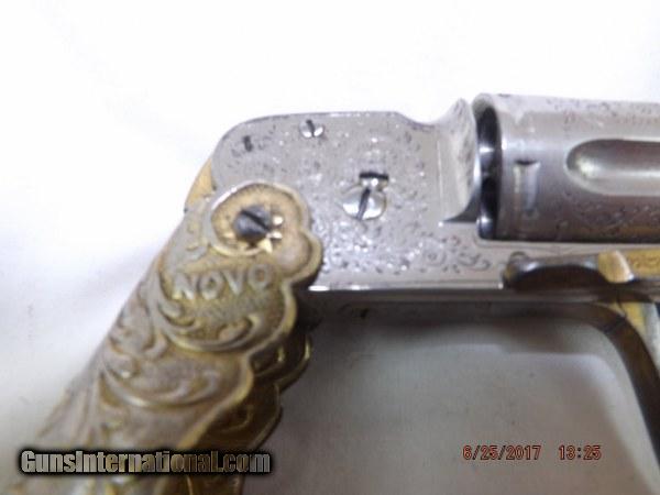 Description: Scarce and Unique Belgian Novo Folding-Grip Pocket Revolver by D.D. Oury chambered in 6.35 mm. 1 1/8-inch barrel. 5-shot cylinder. Factory engraved Nickel finish with gold plated folding grip, folding trigger, assembly lever, and grip release. Grip is marked "NOVO". Left side of frame marked: D.D. Oury. The grip can be folded covering the pistol and the trigger can be folded. After turning the lever on the right side it is possible to pull the cylinder for loading. This tiny guy is in excellent condition and extremely rare. SOLD Curio/Relic: Yes |