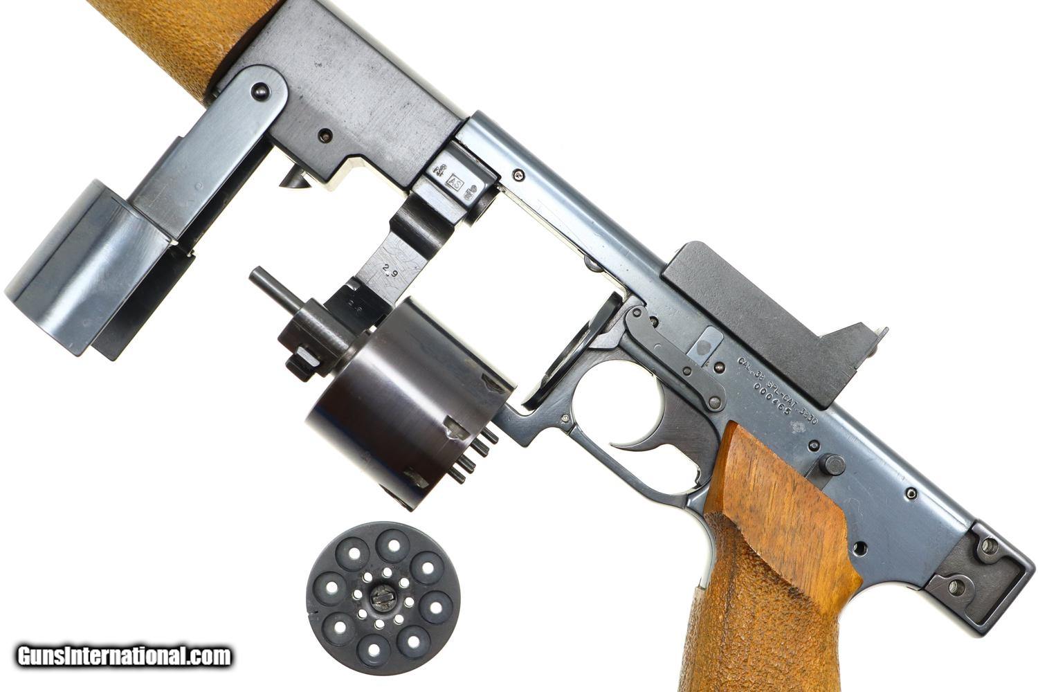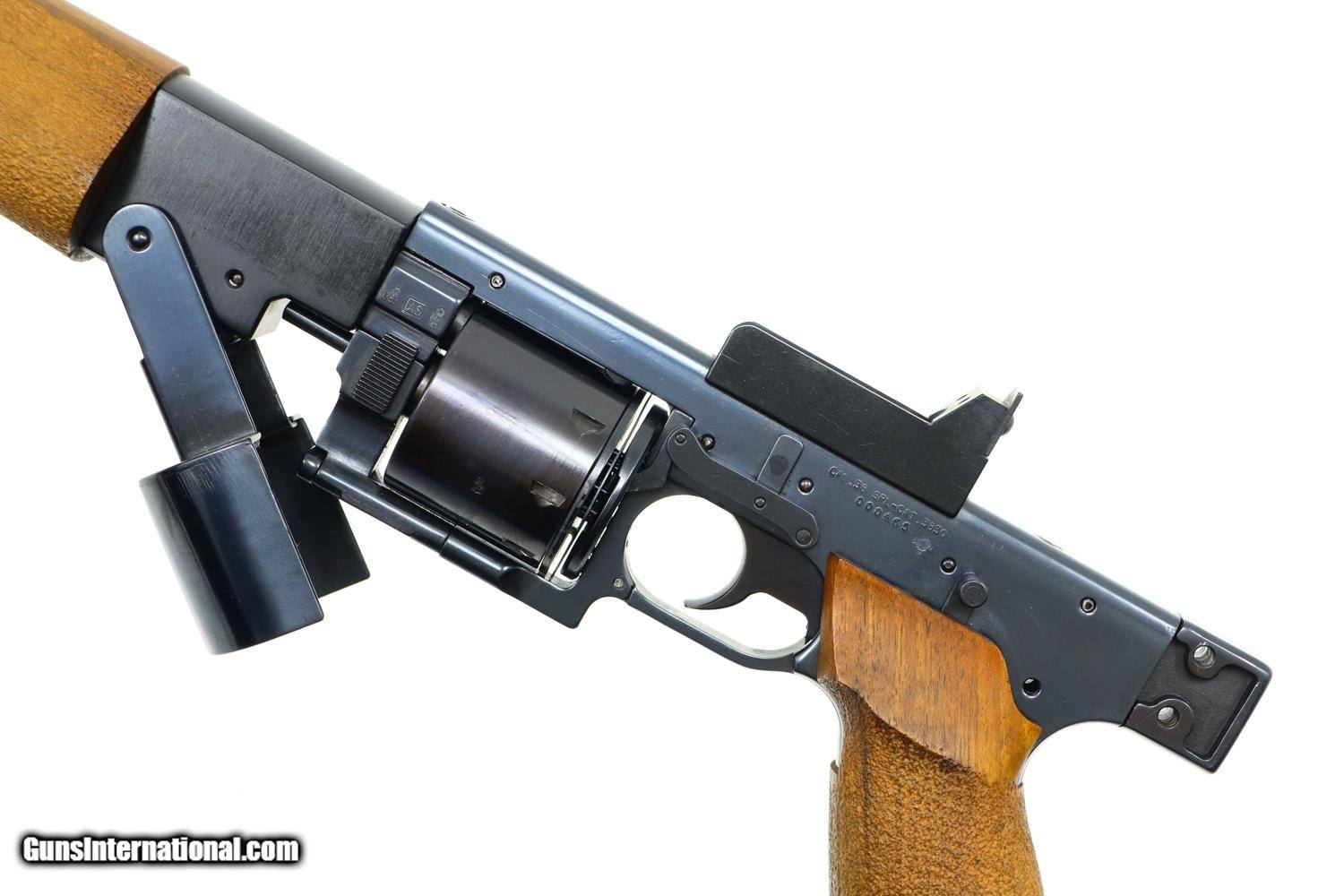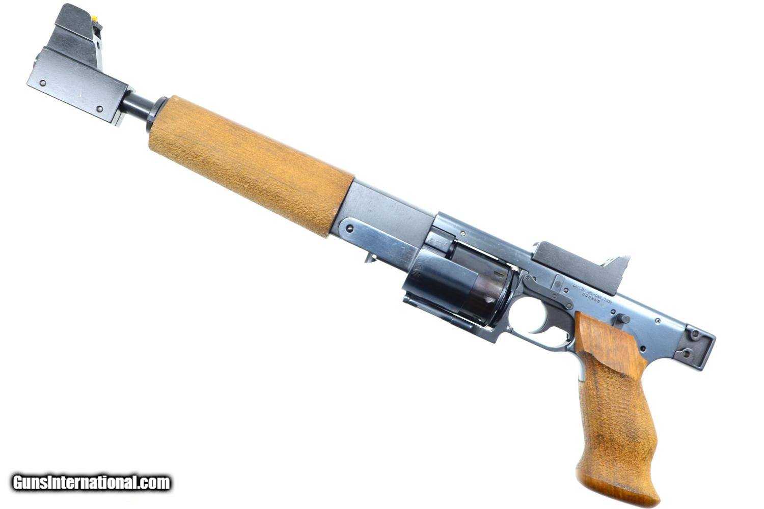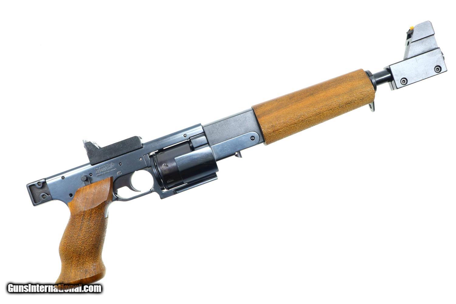 Description: Synopsis: Mateba, MTR-8, Italian Revolver, .38 special, 465, I-783 Description: Phenomenal Mateba MTR-8 Revolver, scarcer than the 6-Unica, with 11-7/8” barrel, speed loading disc, etc. Standard configuration with separable front sight that elevates a translucent red post with serrated knob. Windage adjustable rear sight blade secured with two Allen head screws. SA/DA mechanism with cocking lever for SA above left side of grip. Plunger retained cylinder shroud that rotates down to access the cylinder release lever. Speed loading disc separates to insert loaded cartridges then locks in place before positioning on cylinder pins. Walnut forend behind rotatable swivel and single piece grip with textured surfaces. Condition: Crisp 99% original finish, with a few handling marks. Comparable condition wood furniture, with a shallow impression at bottom of grip. Mirror bore. Perfect manual mechanics. A REALLY crazy looking and futuristic revolver….. Only from Mateba! ~~Insured shipping fee of $155; most packages shipped using FedEx 2nd Day.~~ SOLD Manufacturer: Mateba Serial Number: 465 Caliber Info: .38 Special |