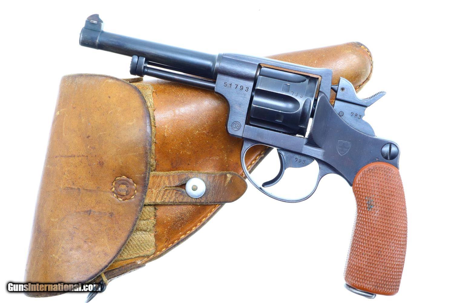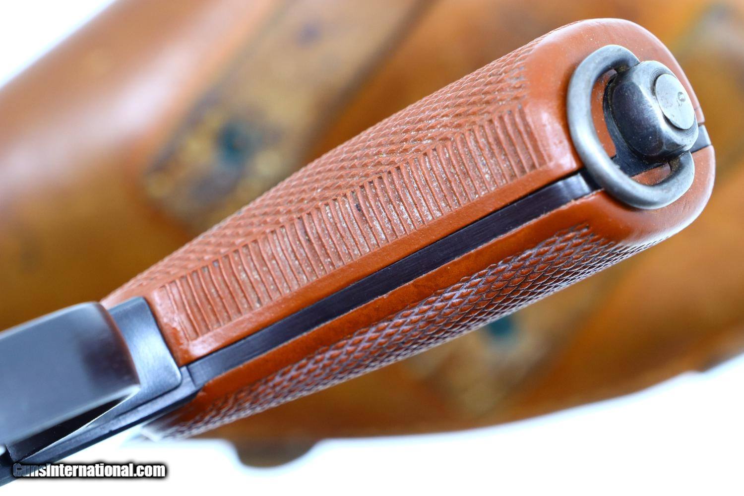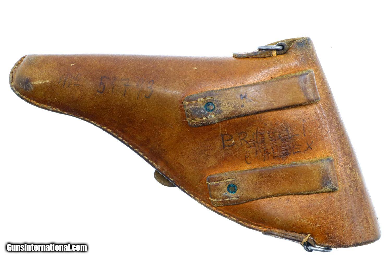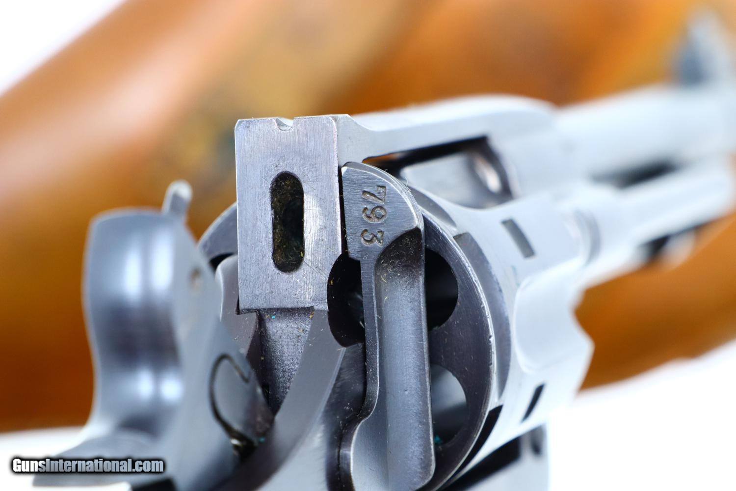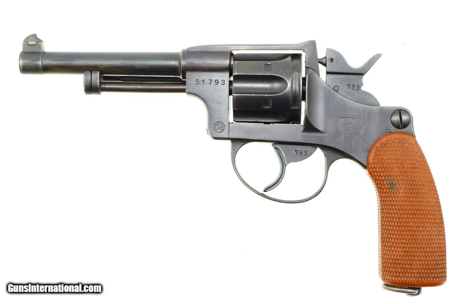 Description: Synopsis: Swiss Bern 1929 red grip military revolver with holster. Description: Standard configuration 1929 Swiss Military revolver with 4.5” barrel having a drift adjustable front sight and a fixed rear sight. 'W/F' logo on left frame in front of trigger guard. Prominent cross in shield just above the grip. “P” on front of trigger guard. Salt blue finish with all matching parts including the cylinder, cylinder pin, hammer, trigger, loading gate. Checkered canevasit red grips. Lanyard ring present. Complete with earlier era leather holster, canvas cartridge loops, dual belt loops, dated '17'. Condition: EXC original salt blue with sharp edge wear and fading as one might expect from a military pistol having seen light use. Comparable condition grips. All cylinders index properly with tight lockup on trigger pull. Mirror bore. Perfect manual mechanics. VG leather holster showing no repairs and dated 1917. A very nice Swiss Military 1929 revolver, all matching complete with earlier era but dimentionally correct holster. ~~Insured shipping fee of $45; most packages shipped using FedEx 2nd Day.~~ SOLD Curio/Relic: Yes Manufacturer: Bern Serial Number: 51793 Caliber Info: 7.5mm |