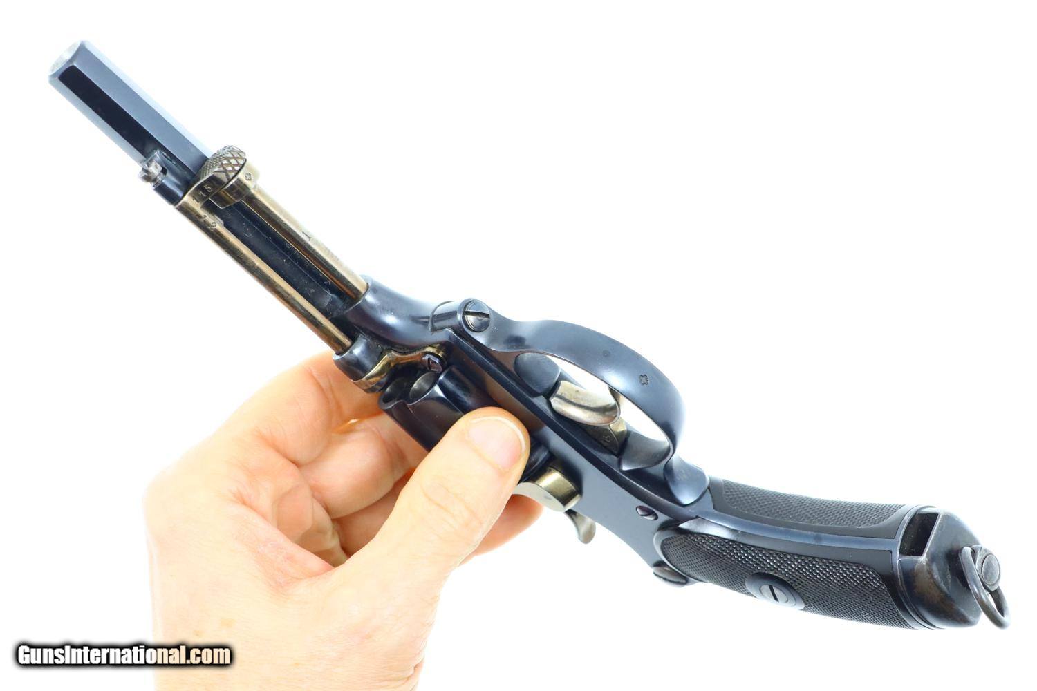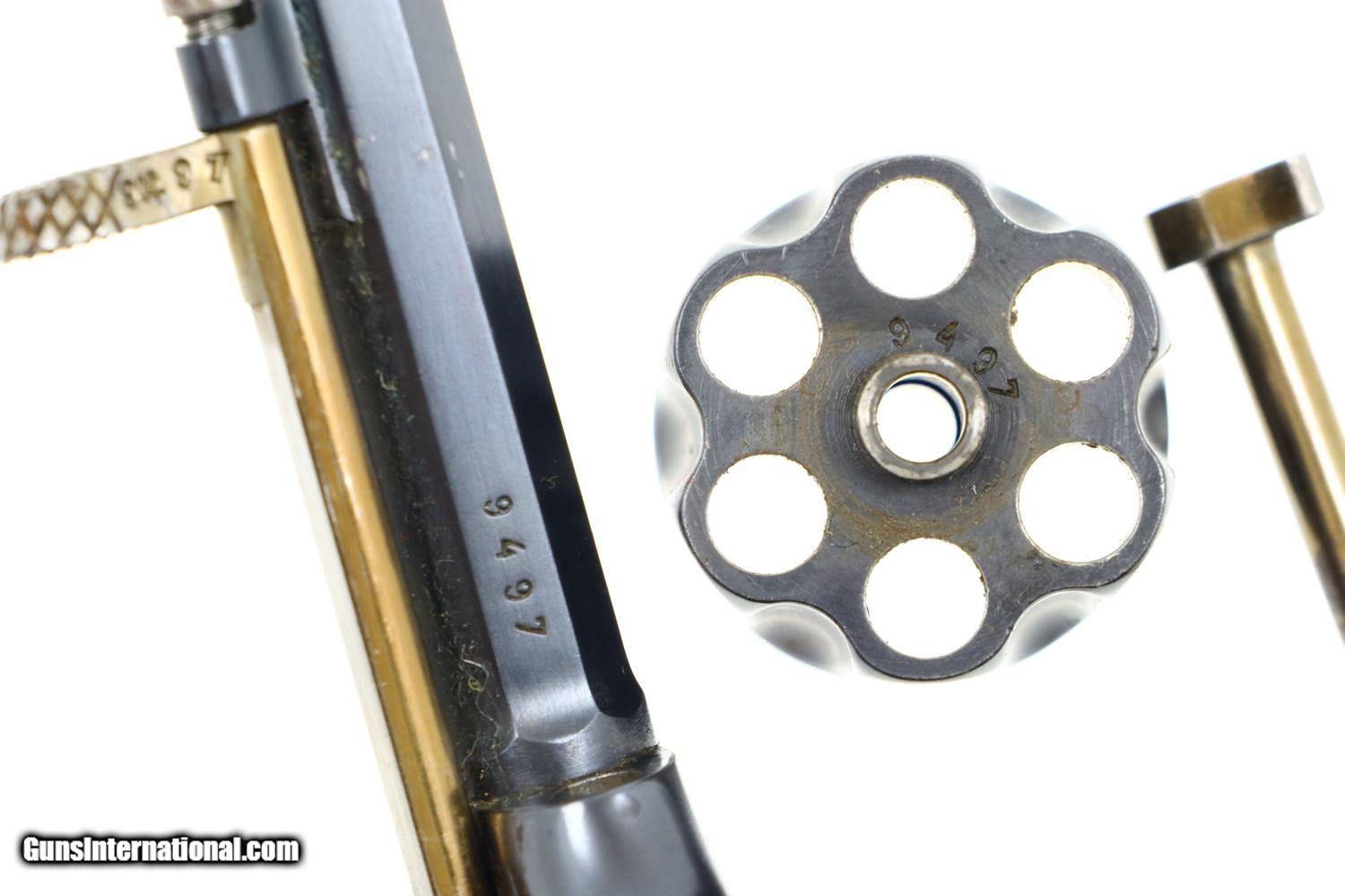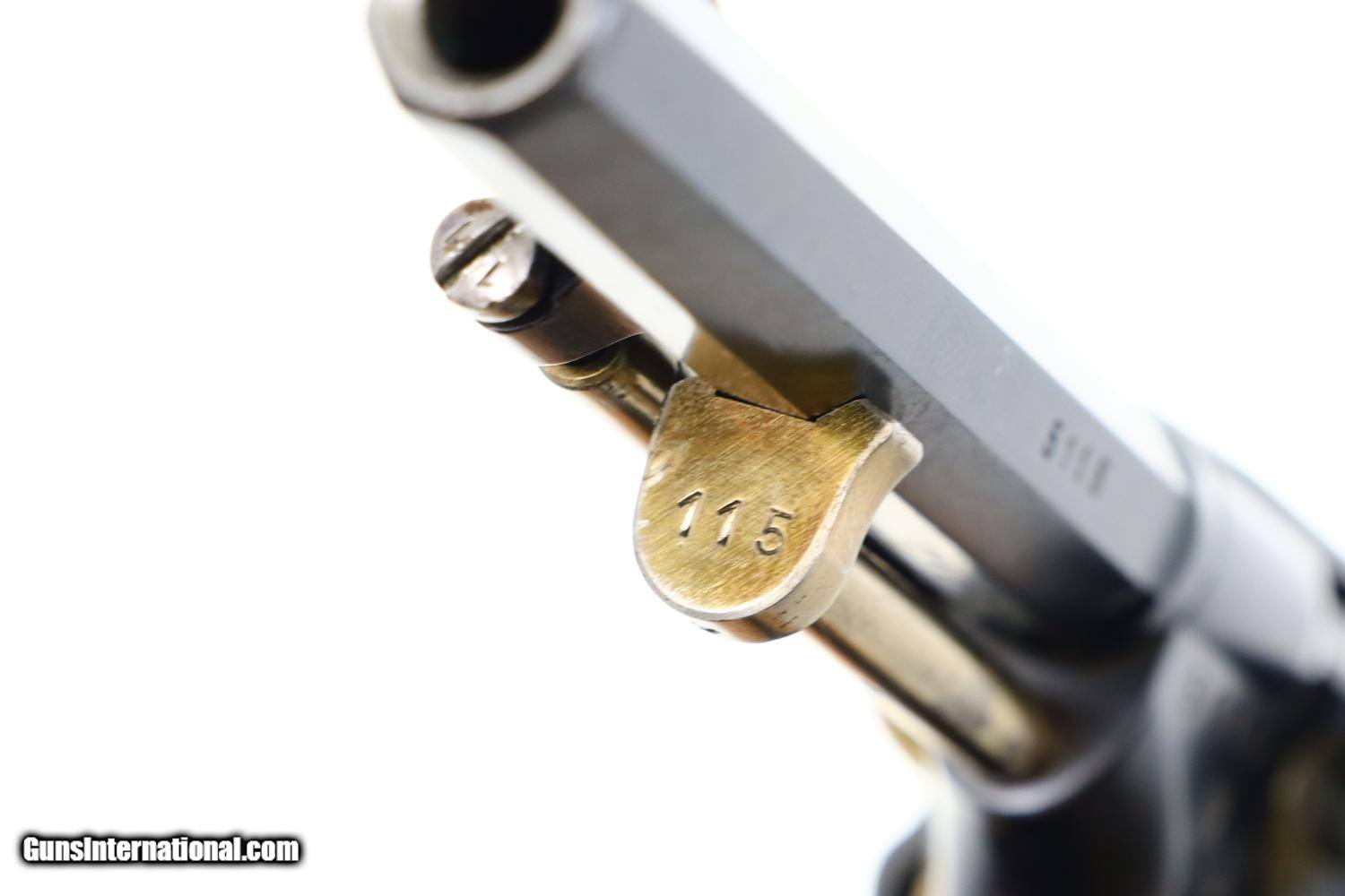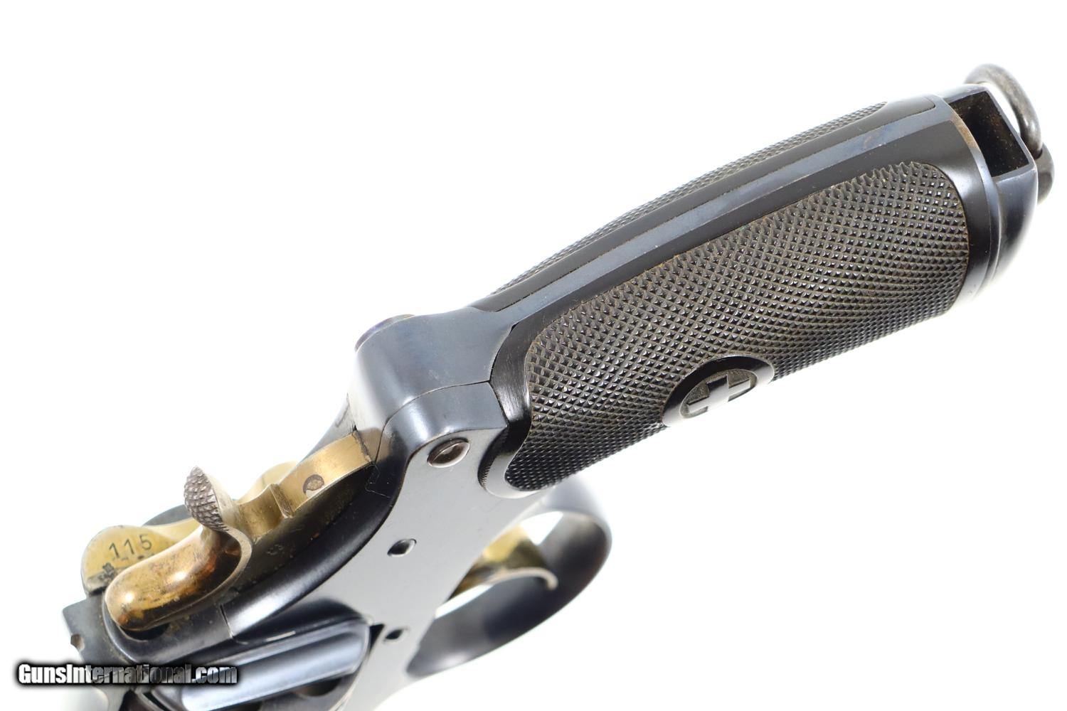 Description: Synopsis: W&F Bern, 1882, Swiss Military, 7.5mm, ANTIQUE, 5115, O-95 Description: Bern 1882 Swiss Military Revolver, caliber 7.5mm. Major and minor components are externally matching, most with assembly number “9497”. Correct hard rubber grips, rotatable lanyard ring. Condition: Excellent, with bright original rust blue. Minimal sharp edge/holster wear as imaged. Crisp grips with a few small areas of blunted checkering but no splits or cracks. All cylinders lock up tightly. Mirror bore. A excellent example of an early, classic, Swiss Military revolver, even better that it is an antique! ~~Insured shipping fee of $55; most packages shipped using FedEx 2nd Day.~~ SOLD Manufacturer: Bern Serial Number: 5115 Caliber Info: 7.5mm |