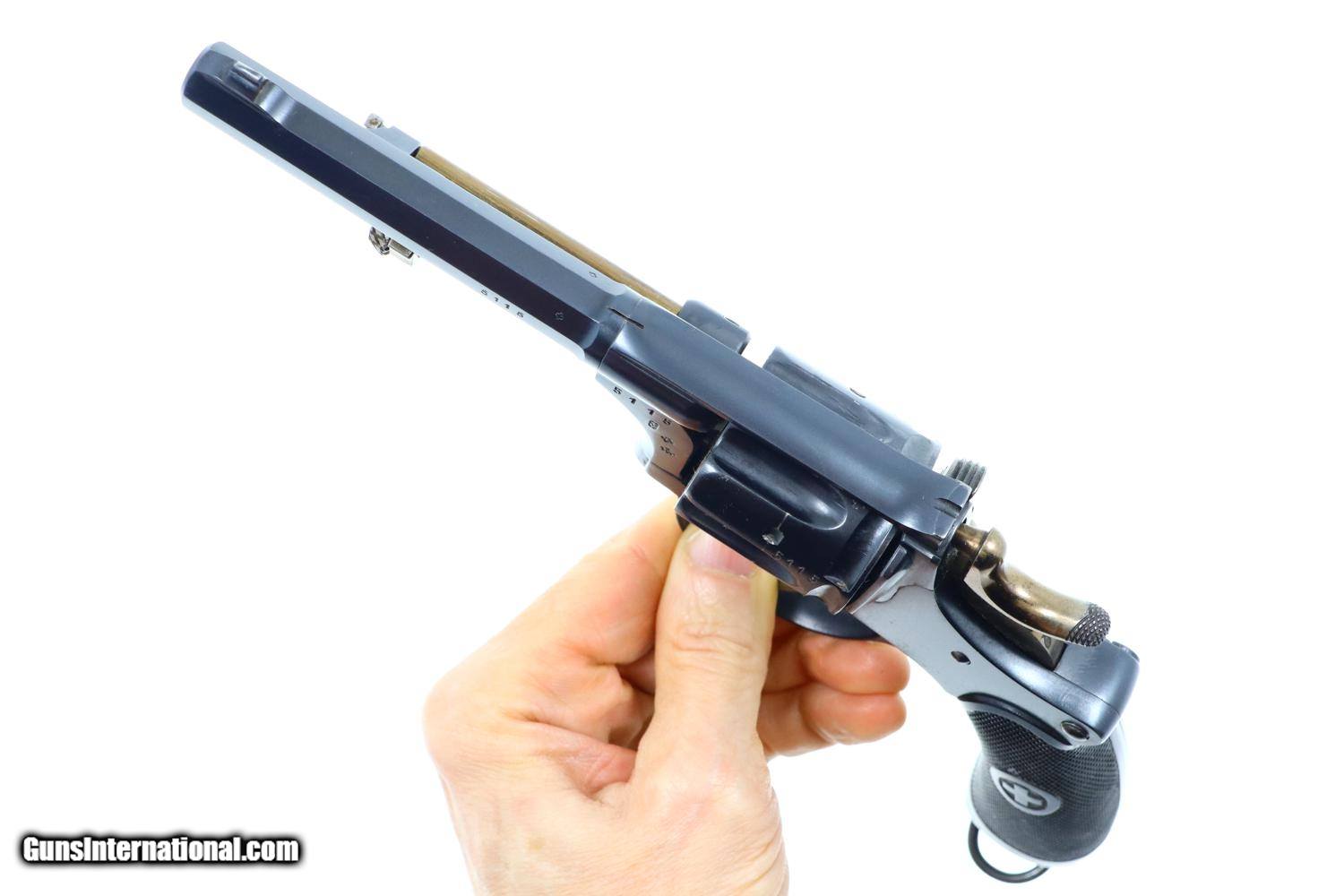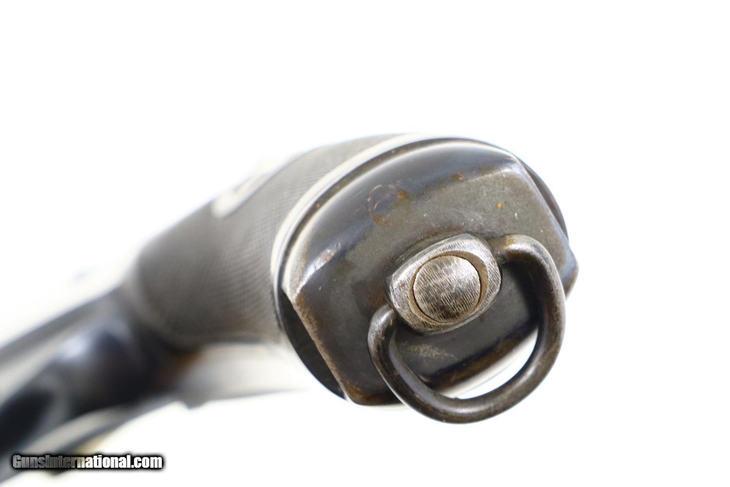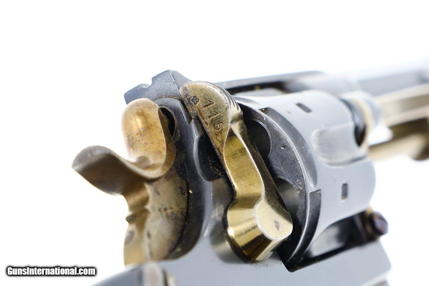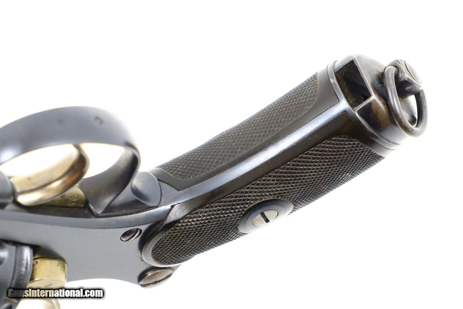 Description: Synopsis: W&F Bern, 1882, Swiss Military, 7.5mm, ANTIQUE, 5115, O-95 Description: Bern 1882 Swiss Military Revolver, caliber 7.5mm. Major and minor components are externally matching, most with assembly number “9497”. Correct hard rubber grips, rotatable lanyard ring. Condition: Excellent, with bright original rust blue. Minimal sharp edge/holster wear as imaged. Crisp grips with a few small areas of blunted checkering but no splits or cracks. All cylinders lock up tightly. Mirror bore. A excellent example of an early, classic, Swiss Military revolver, even better that it is an antique! ~~Insured shipping fee of $55; most packages shipped using FedEx 2nd Day.~~ SOLD Manufacturer: Bern Serial Number: 5115 Caliber Info: 7.5mm |