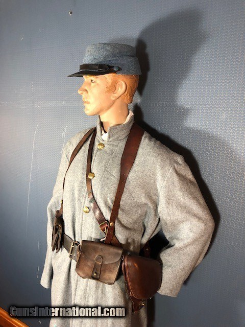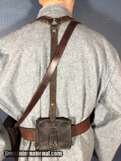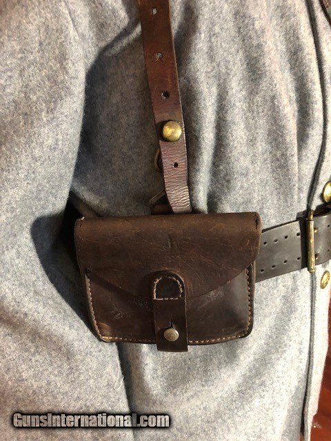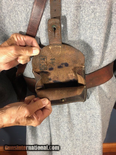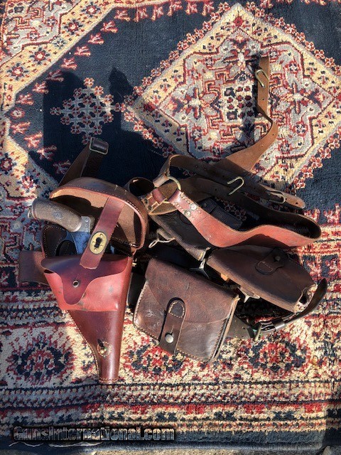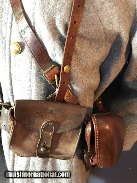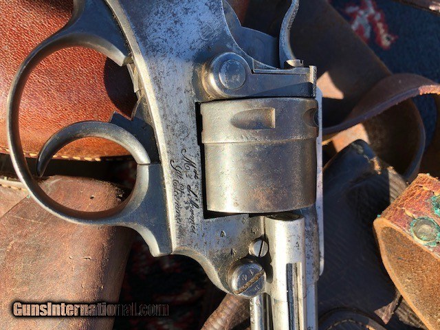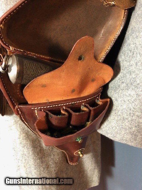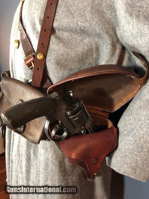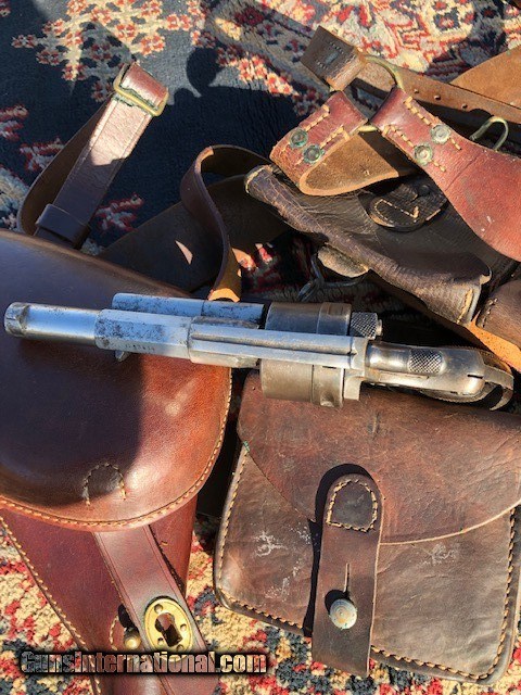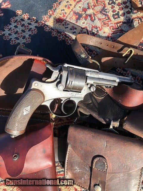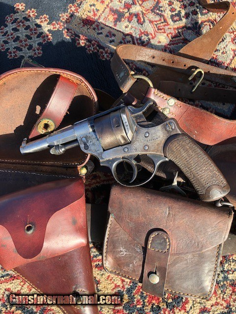 Description: French Military 1873 Ordnance revolver manufactured at the St. Etienne arsenal (dated 1879). These revolvers were manufactured from 1873 to 1887. All matching numbers. This revolver is built like a wagon, designed for a very robust 11mm cartridge. Used all throughout the first world war. The cylinder has been reamed out and rechambered to 45 Auto Rim cartridges as French 11mm is difficult to obtain. This gun is a great shooter! Shoots a 45 auto 230 gr. cast bullet. comes with loaded 45 Auto Rim ammo. (Starline Brass). 45 Auto Rim ammo is easily reloaded. Bore is bright and shinny with sharp rifling. there are several dark spots in the grooves. Action is smooth and tight. Comes with a WW I French Gunnery Officers holster rig complete with 3 original ammo pouches, shoulder "Y" straps and leather belt. Ideal rig for the WW I French reanactor. Antique no FFl needed. $950 SOLD Antique: Yes |