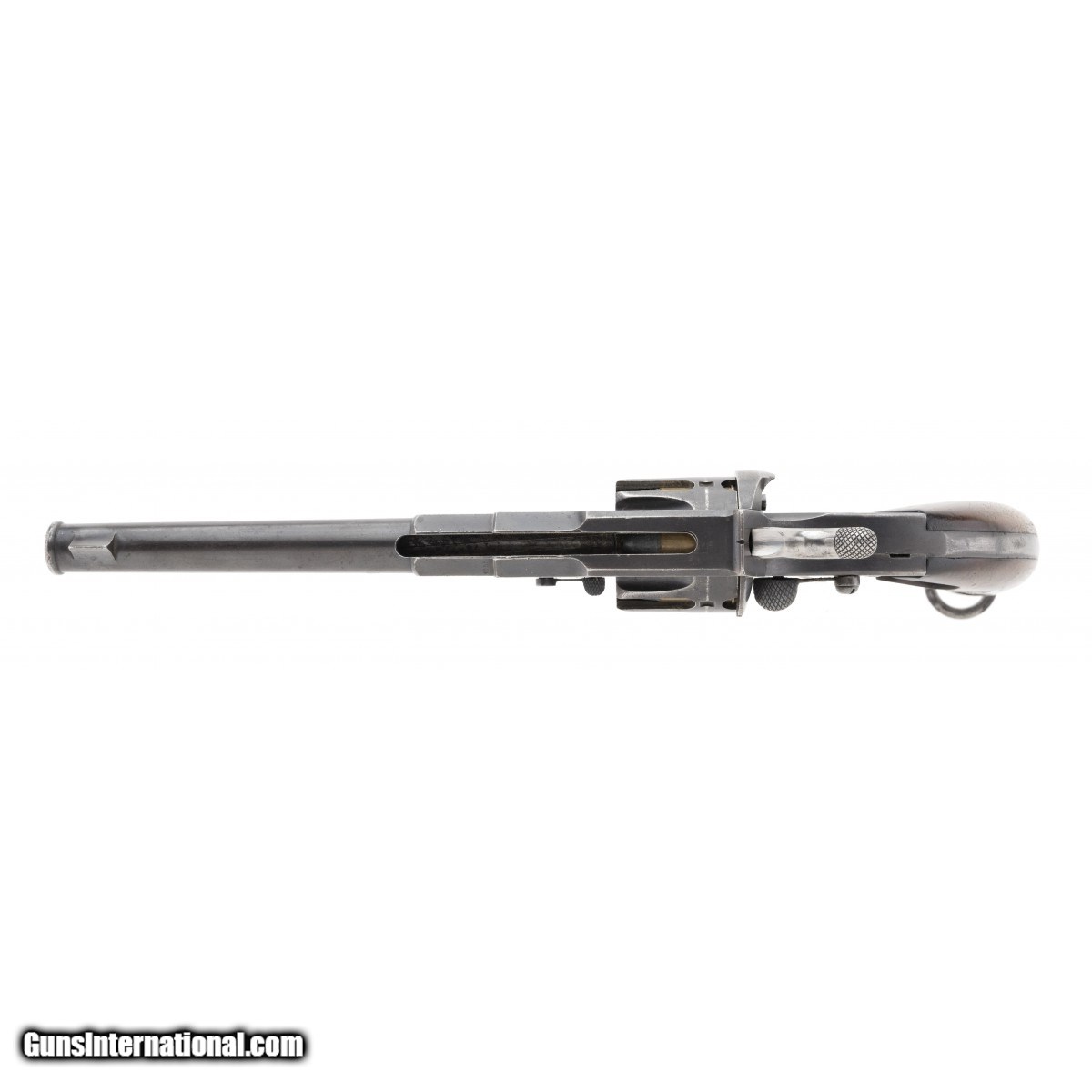 Description: " The 10.55mm Model 1879 Reichs revolver was used from 1882 to 1919. This revolver was manufactured in 1881 by the Dreyse factory in Sommerda. The overall length is approx. 13"". The 7.2"" stepped octagon to round barrel with cannon muzzle has a good bore with erosion in the rifling. The revolver retains approx. 80% of its original dull blue finish which is turning plum. The grip tangs, butt cap, and trigger guard are worn bright. The matching serial number, 3336, can be found on most parts. As evidenced by the issue marks of 69.A. and 2.53. on the butt cap, this pistol was issued prior to its being altered to the cut-away configuration. The top rear 2.5"" of the barrel is cut away along with each of the six chambers (with later added dummy rounds made from 44S&W cartridges), the left side of the action, and two areas of the left grip. The grips are very good with original finish and very light wear. The action, including the safety, functions correctly. This is a very nice early Dreyse Model 1879 that was issued and then turned into an armorer's training tool. It would fit an early German or European cartridge revolver collection or a specialized cut-away collection. SOLD Antique: Yes |