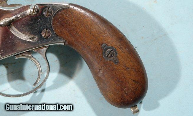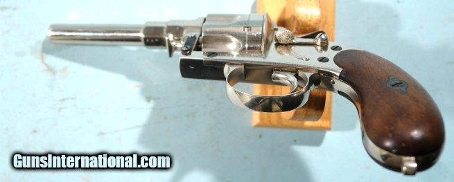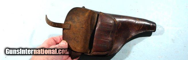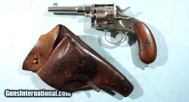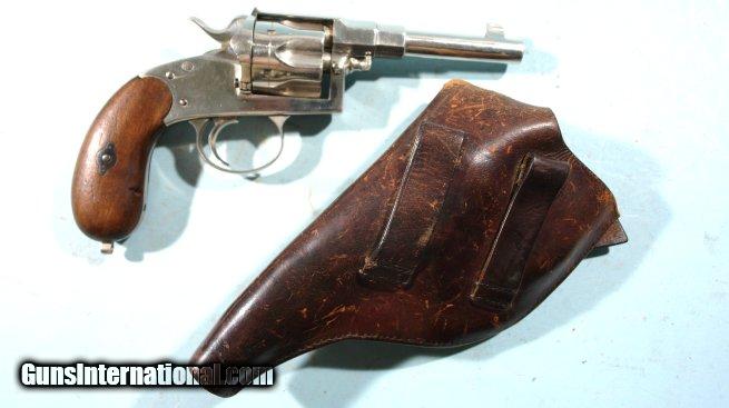 Description: IMPERIAL GERMAN ERFURT MODEL 1883 REICHS REVOLVER DATED 1893 WITH HOLSTER. 10.35mm caliber six shot with 4 ¼” barrel. All matching serial numbers. Stamped on the frame “CROWN/ERFURT/1893”. Professionally refinished with all parts nickel plated except the screws and the cylinder pin spring which are brightly blued in what appears to be the original finish. Original grips with the original finish. Perfect working order and excellent bore. Scarce original issue holster in very nice condition. Has all the loops inside the cartridge pocket and the original belt loops. Missing the small buckle for the pouch flap strap. Very nice looking outfit. SOLD Antique: Yes |