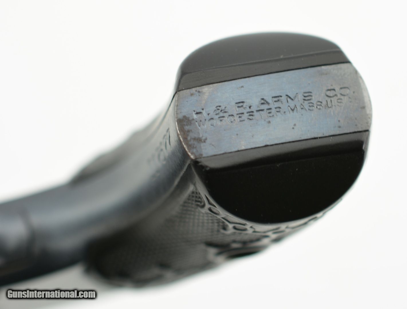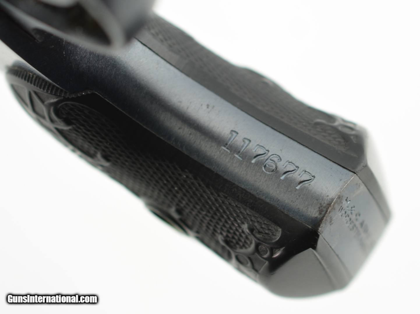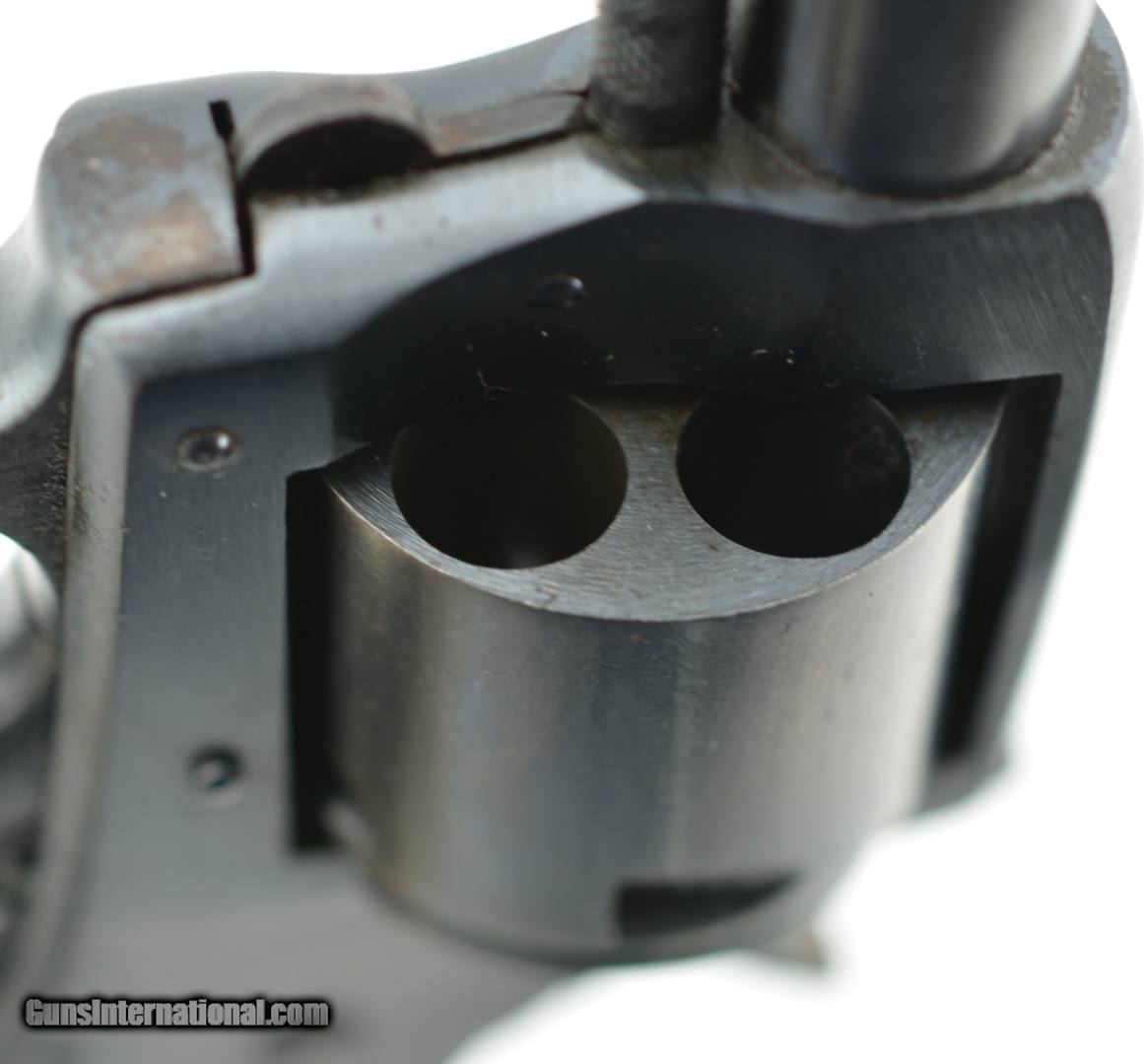 Description: Serial #117677, 32 S&W, 2" round barrel with a bright, excellent bore. This is a late model, medium frame, Victor revolver manufactured by Harrington & Richardson from approximately 1913 to 1936. Most often encountered with nickel finish this scarce blued example is in excellent condition retaining about 97-98% of the original bright blue finish showing some faint thinning and a few freckles on the cylinder, and the triggerguard and backstrap. The hammer shows smoky case-hardened colors and the markings remain crisp. The black checkered hard rubber crown motif grips remain in excellent condition and are numbered to the gun. The butt is marked with "H. & R Arms Co. / Worcester. Mass. U.S.A." with the serial number on the inside of the grip strap and on the inside frame under the grip. Single action does not currently hold but the double action seems to function well mechanically with very good timing and lock-up. An excellent example of this little pistol. FFL or C&R; SOLD |
