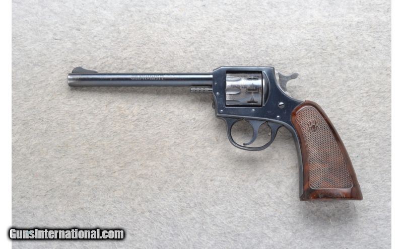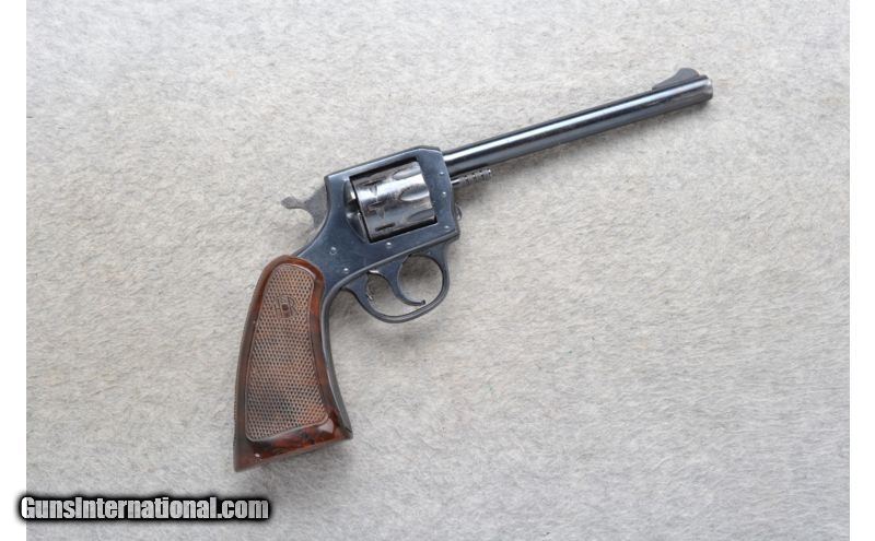 Description: SOLD Caliber Info: .22 Long Rifle Chambers: 9 round fluted cylinder. Metal Condition: Fair. Has freckling, handling marks and blue wear. Wood Condition: Good with handling marks. Bore Condition: Excellent. Barrels: 6 inch blued barrel. Triggers: Single Action / Double Action. Stock: Diamond checkered walnut grip. Weight: 26 oz. Sights: Blade front. Integral notch rear. Item Location: Richfield, WI |