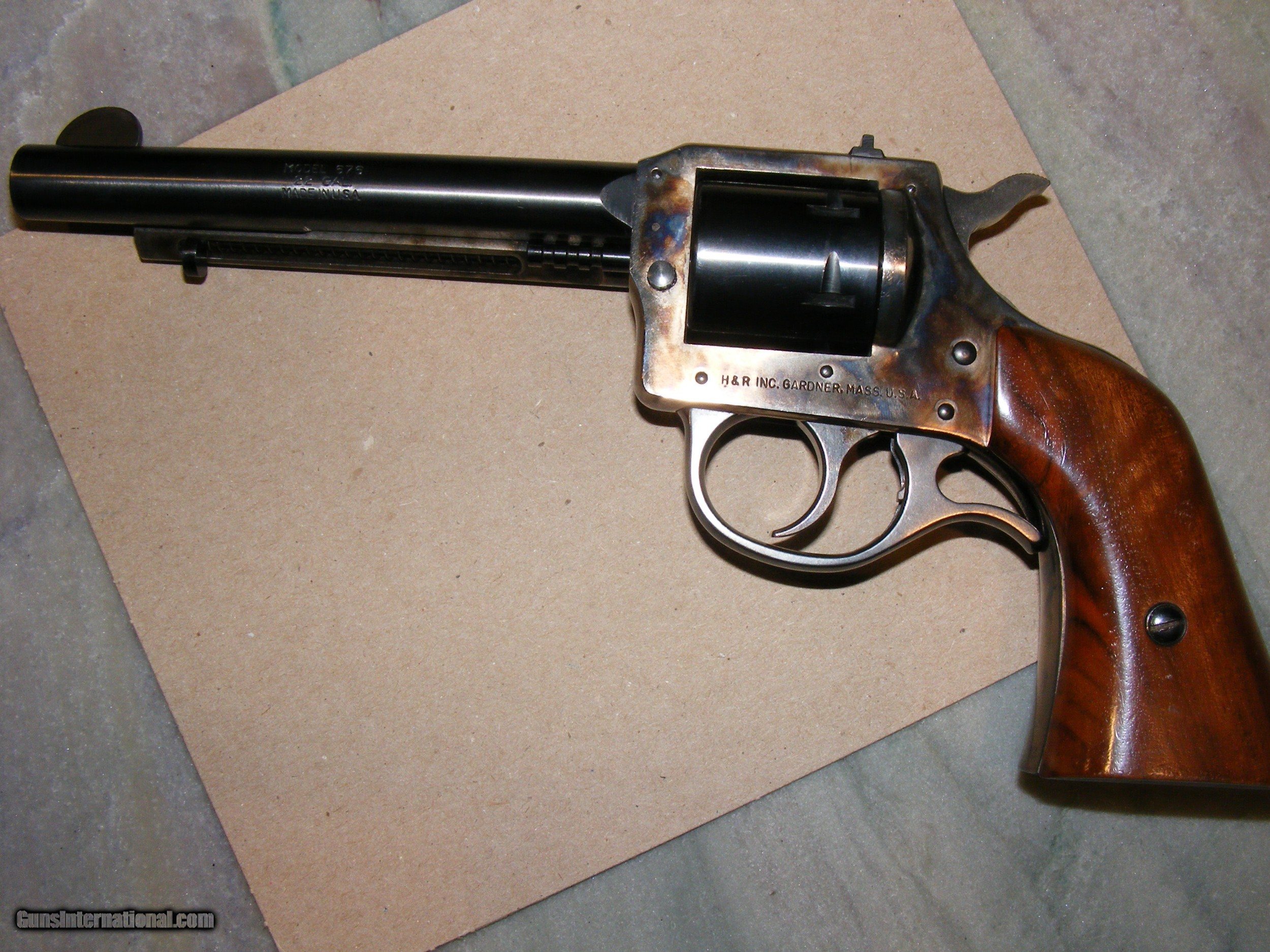 Description: SOLD PENDING RECEIPT OF PAYMENT H&R Model 676 Convertible double action/single action western style revolver with two 6-shot cylinders: caliber .22 LR and .22 WMR, 5.5" barrel, side load and eject, fixed sights, case colored frame and ejector rod housing; blued barrel, trigger guard and cylinders; one piece walnut grip, 98% overall condition with bright bore and sharp rifling, mechanically excellent, transfer bar ignition with frame-mounted firing pin. Manufactured from 1975 to 1980. FFL required. Payment via USPS money order or bank cashier's check only. $95 for insured shipping. SOLD |