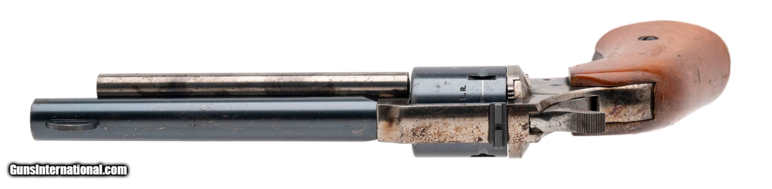 Description: "SN: AP59111. 1980s vintage, .22LR with a 5.5"" barrel. Bore is excellent. Double-action rimfire revolver with case color hardened frame, blue finished barrel, and wood grips. Finish and grips are worn with handling marks throughout. Overall condition is good. SOLD |
