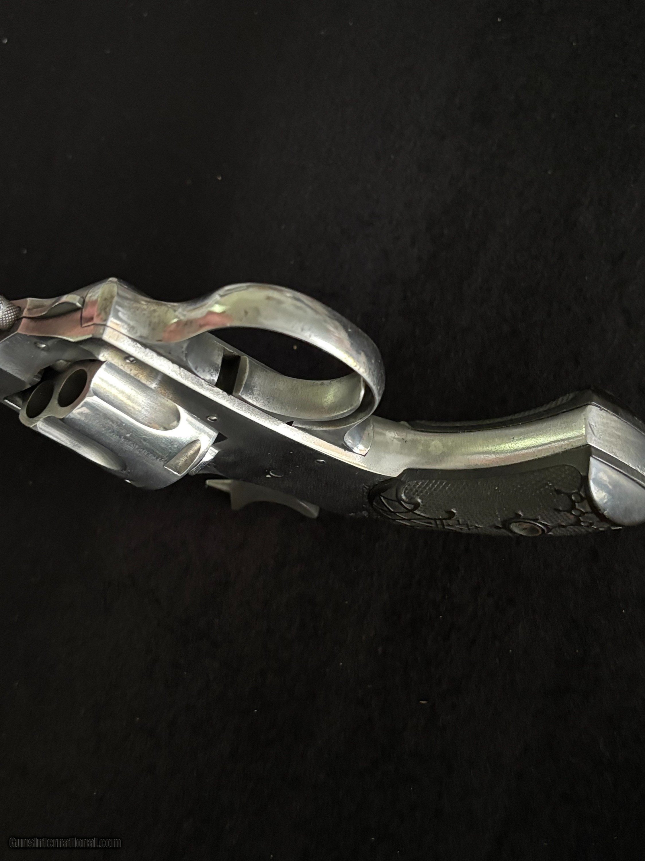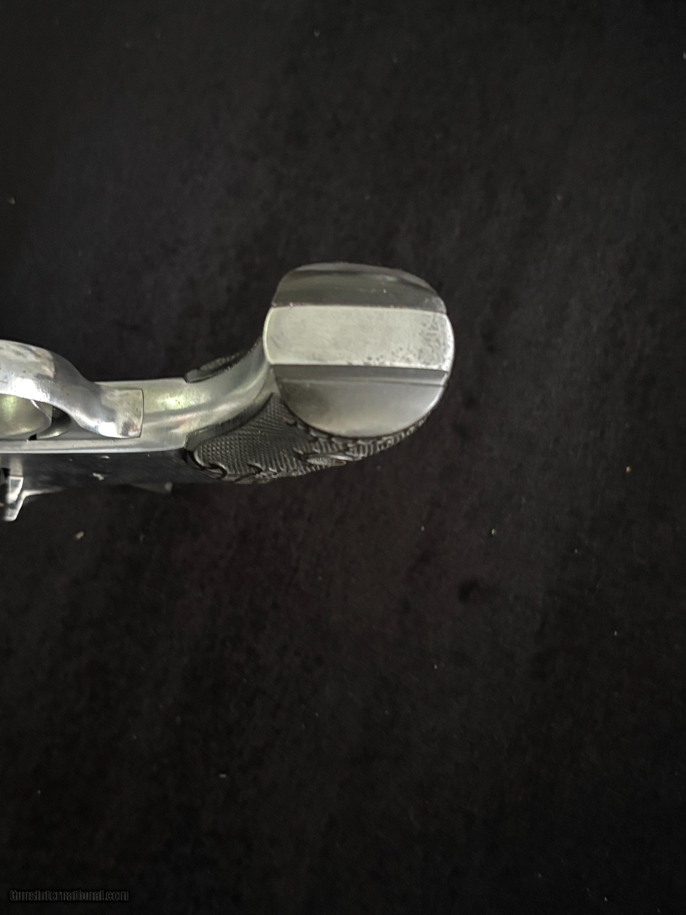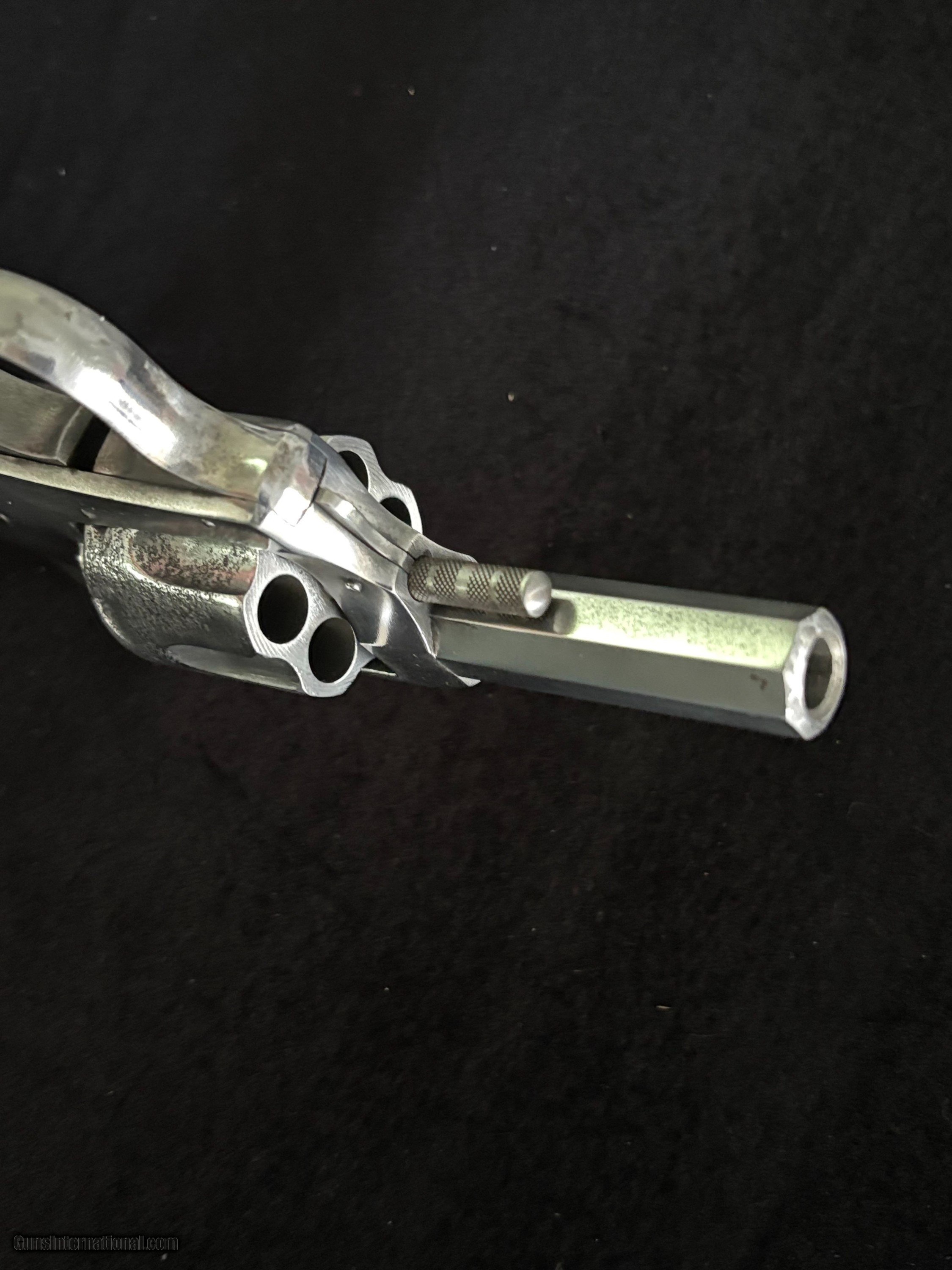 Description: H&R .32 S&W Double Action Top Break 1st Model Revolver. This is a very rare 1st model, 2nd variation, produced from 1888-1897. Serial #302 Looking for a classic piece of American firearms history? If you're looking for an addition to your Harrington & Richardson revolver collection, then this rare H&R .32 S&W Double Action Top Break 1st Model Revolver might just be what you're looking for. ANTIQUE H&R 1st model 2nd variation Revolver 6 shot .32 S&W Nickel finish 6 shot in .32 S&W. Trigger guard attached with thru pin in the rear and a screw in the front. Pull pin cylinder. Hard rubber grips. These were made for black powder cartridges. Top of Barrel marked: THE AMERICAN DOUBLE ACTION Condition: 2 ½” octagon barrel with a lightly frosted bore , very minor pitting from black powder use and still showing very nice rifling. The metal surfaces are still in good condition with most of the original nickel faded away with some very light freckling and pin-prick pitting in spots probably from staorage. Please judge from the photos. The original Hard rubber checkered grips rate excellent. Lock-up and timing appear to be good. Mechanically works very well in single and double action with a strong hammer spring. This is an antique and no FFL required. Just proof of age. Will ship USPS priority mail FREE SHIPPING included This gun is sold "as-is" as a collectible with no refund and no return. Payment can be made with bank check, postal money order, or personal check. If you prefer instant payment and shipping I can take venmo, Zelle or Cash App. please email or text me for account info. SOLD Antique: Yes Handgun Caliber: .32 S&W Long (.32 Colt New Police) Manufacturer: Harrington & Richardson Model: American Barrel Length: 3 |
