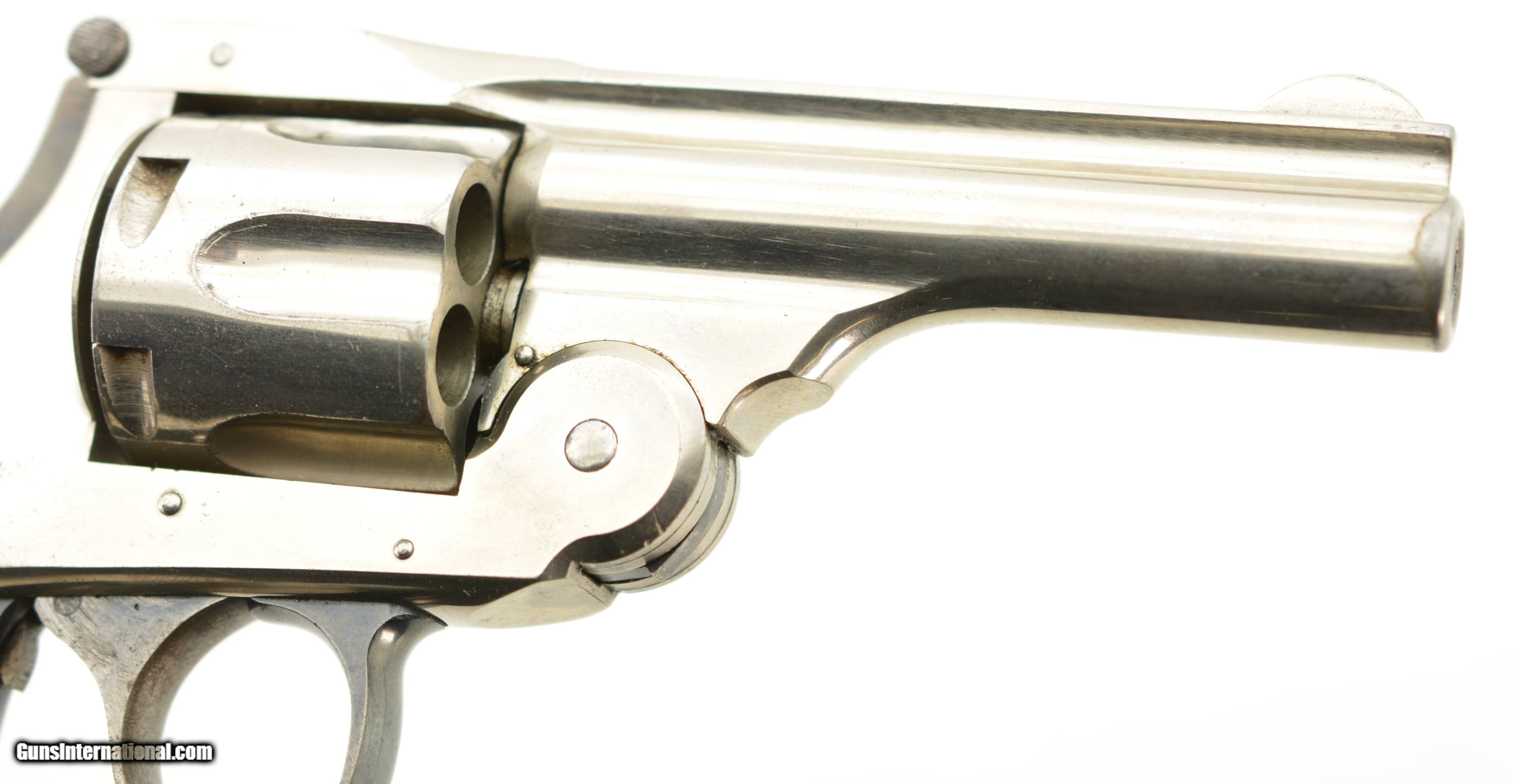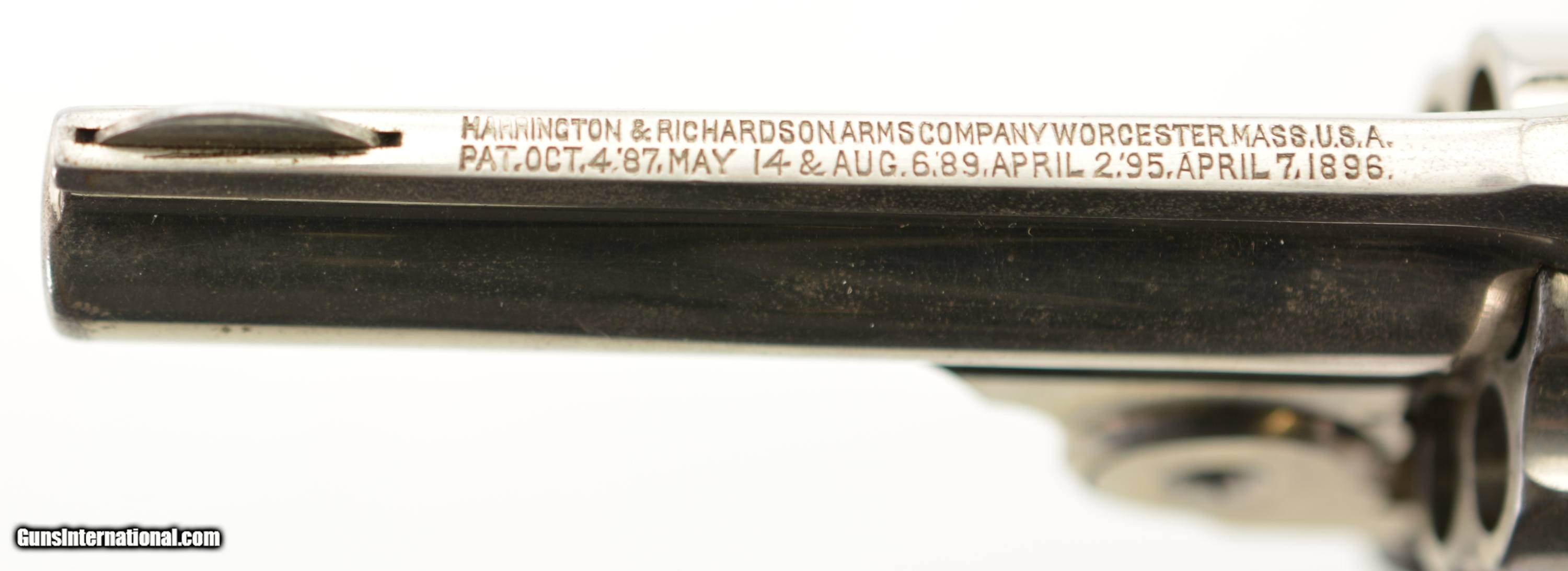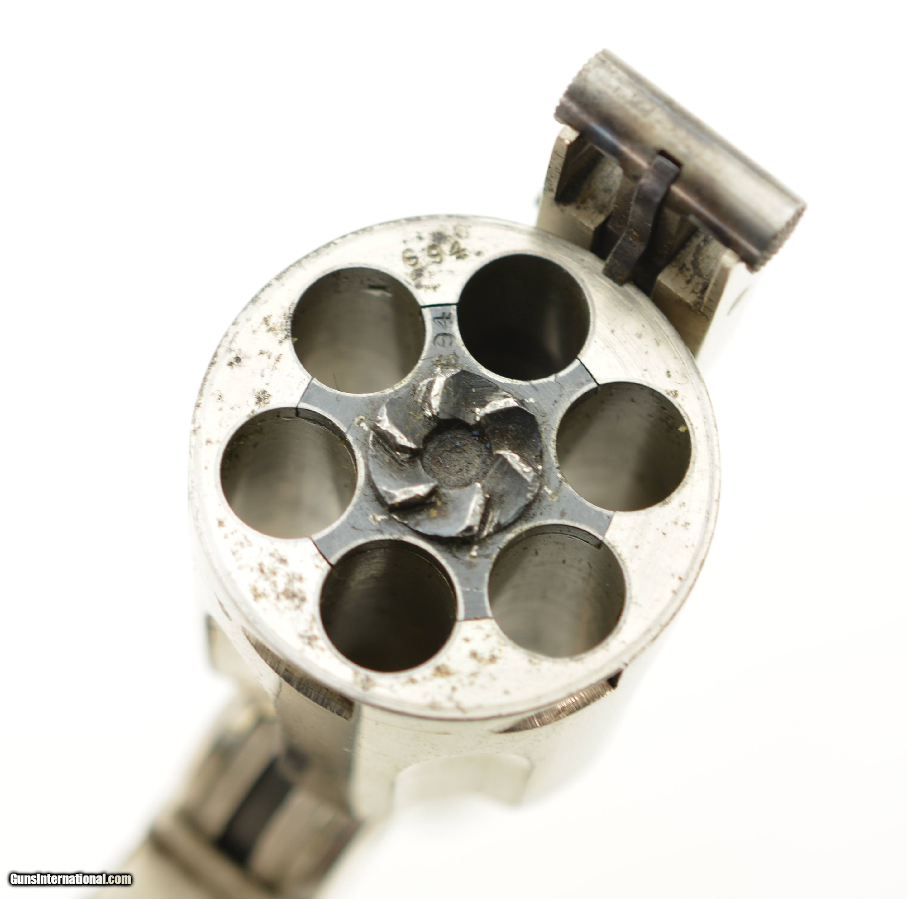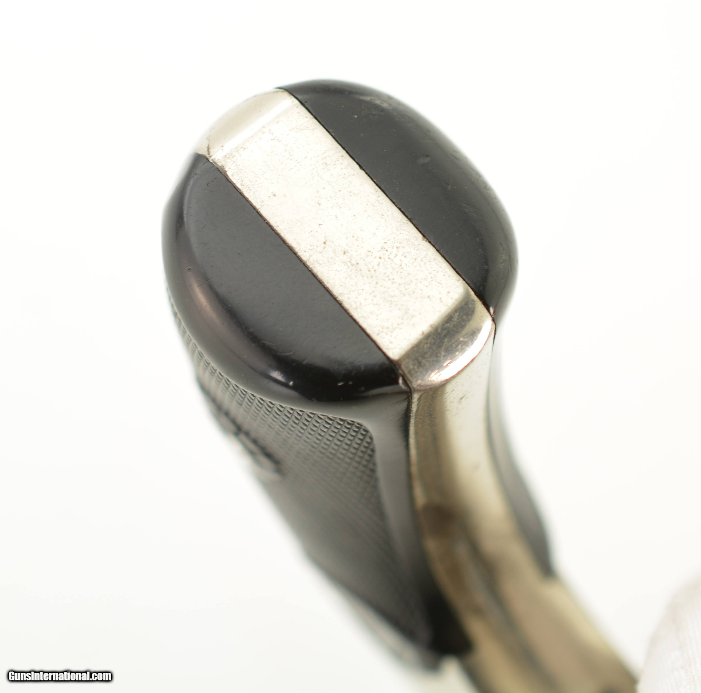 Description: Serial #G28694, .32 S&W, 3 1/4" barrel with a very good, lightly freckled bore. This is a DA only revolver that retains 92-95% of the original nickel finish with some wear along the high and exposed edges, as well as some scattered spots of mild brown freckling, most noticeably within the cylinder flutes. The trigger has a mottled gray patina, and bright color case-hardening remains on the bobbed hammer which looks to have been done at the factory showing traces of case on the rear of the hammer. A true Single action only revolver . The checkered hard rubber grips are in fine shape, with some mild wear and flattening of the points on either side. The action is fully functional, and the revolver rates fine-near excellent overall. FFL or C&R SOLD Curio/Relic: Yes Manufacturer: H&R Model: Police Serial Number: G28694 Caliber Info: .32 S&W Gauge Info: .32 S&W |