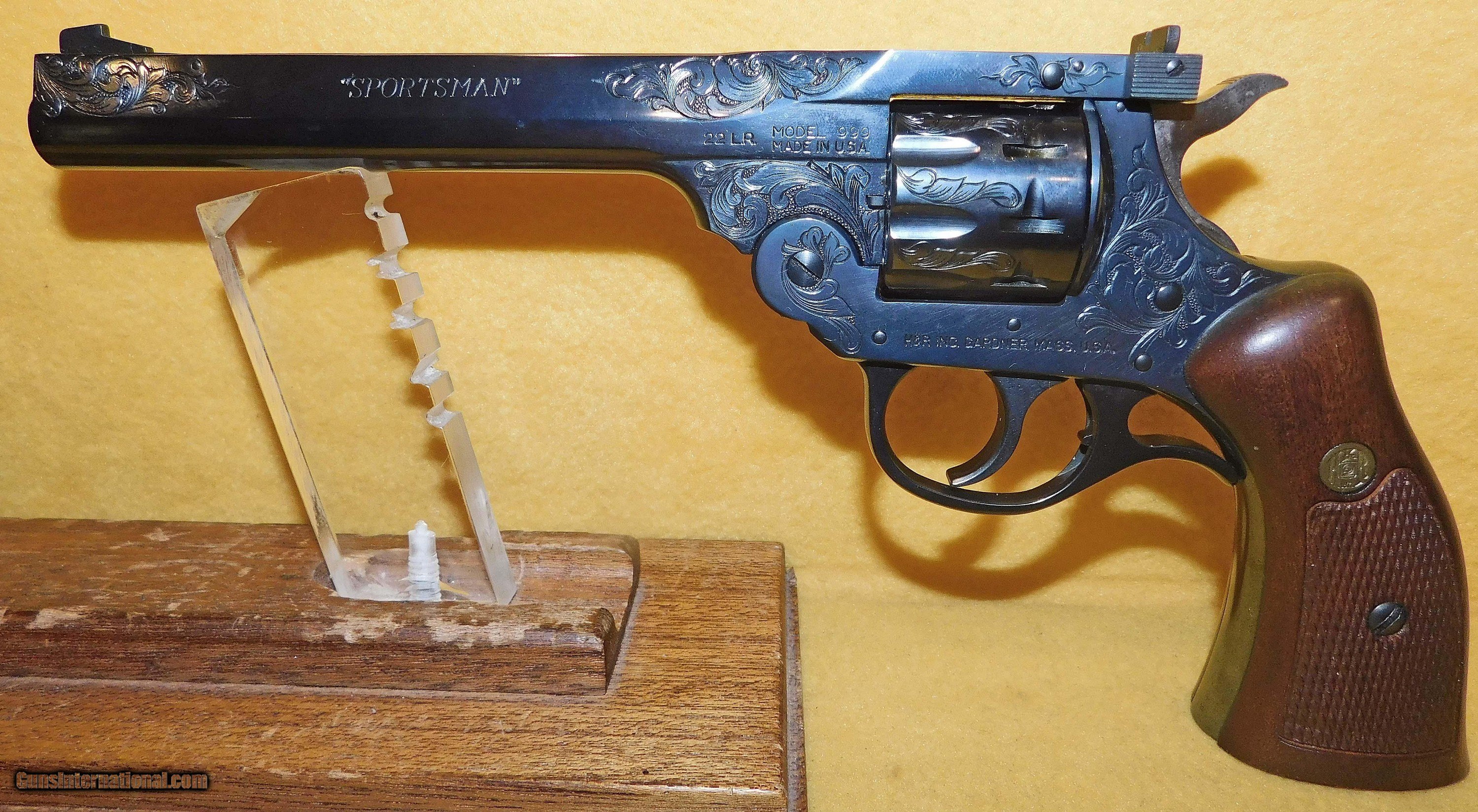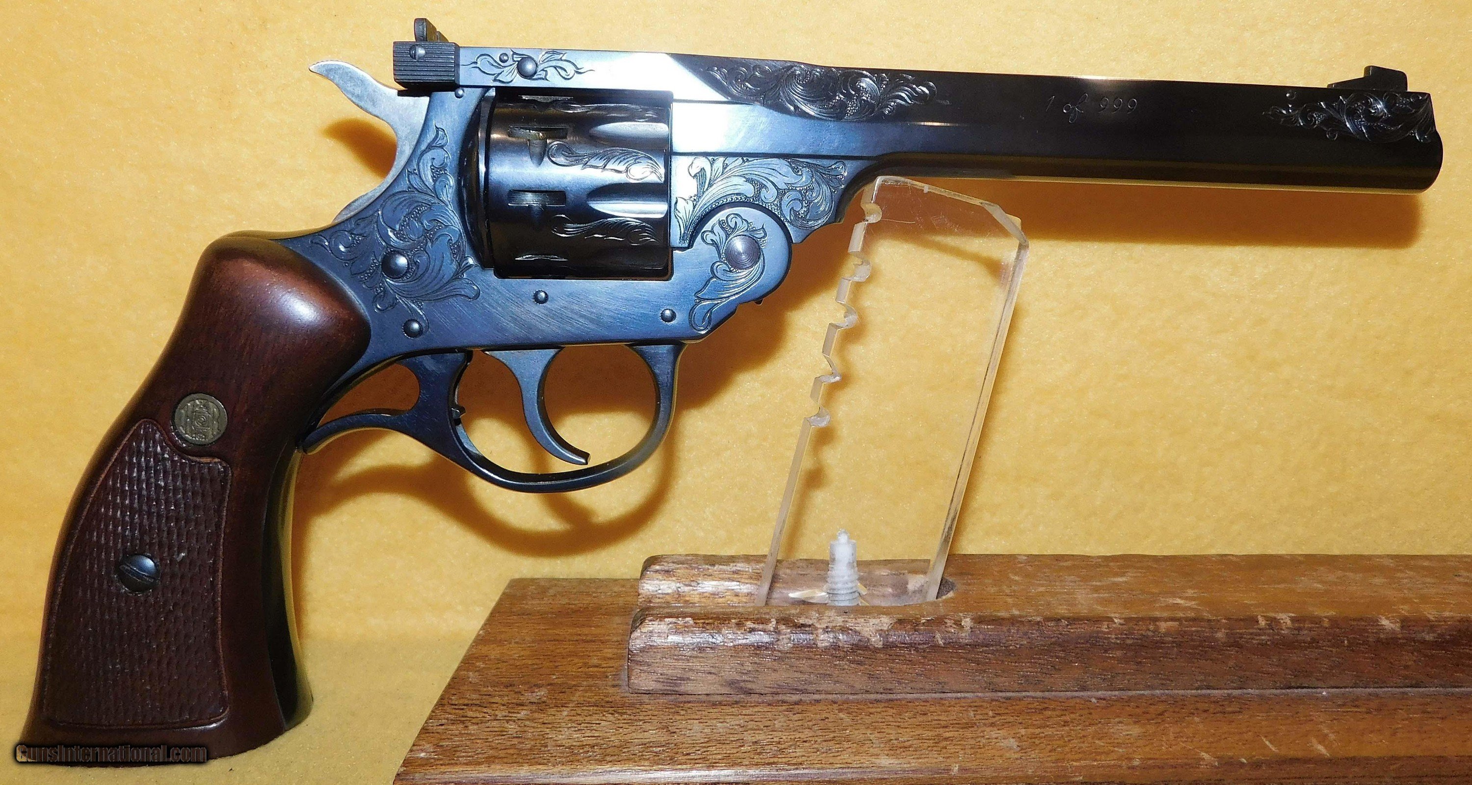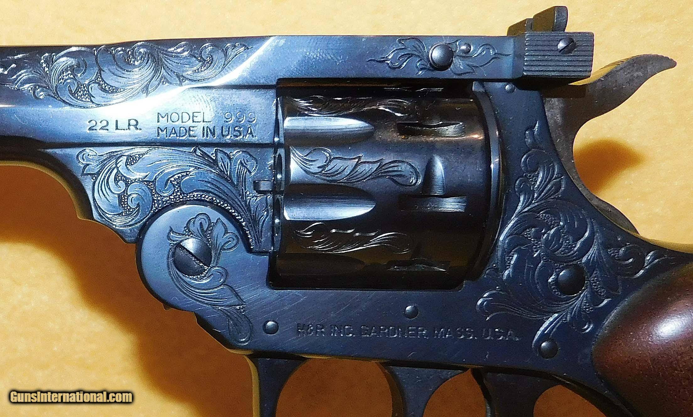 Description: H&R 999 IN .22 L.R. CAL., WITH 6" BARREL. COLOR BLUE. CONDITION 98% LIKE NEW UNFIRED. SERIAL NUMBER 999206. H&R MODEL 1 0F 999 IN .22 L.R. CAL., THIS FIRE ARM IS 206 FO 999, (WORCESTER MASS.),FACTORY ENGRAVING, COMES WITH CHECKERED ROPER WALNUT GRIPS, VELVET LINED WALNUT DISPLAY CASE WITH SLEEVE, MISSING THE MEDALLION FROM THE CASE, 98% LIKE NEW UNFIRED OVERALL CONDITION, OUR STOCK # D3413 SOLD |
