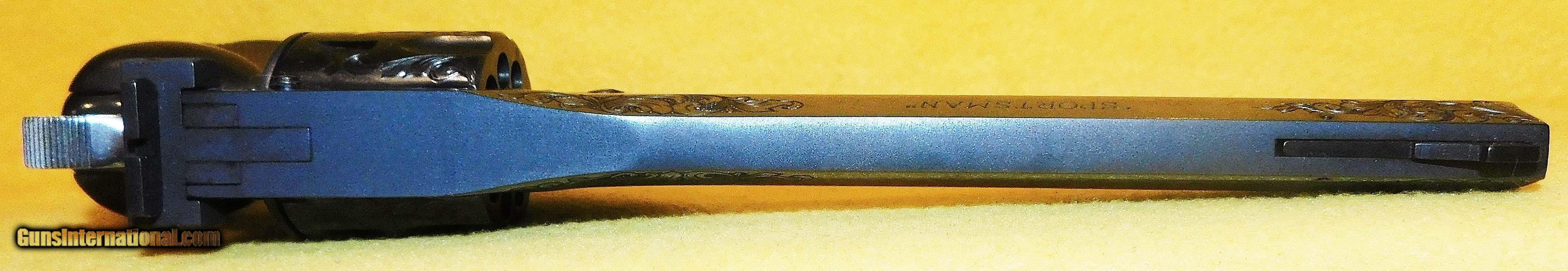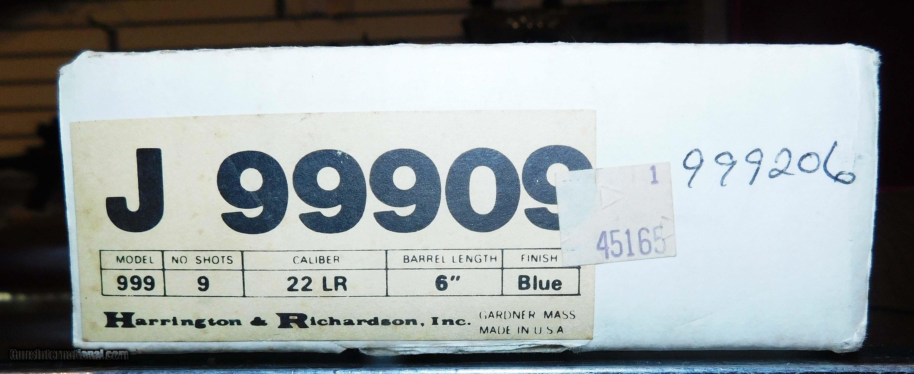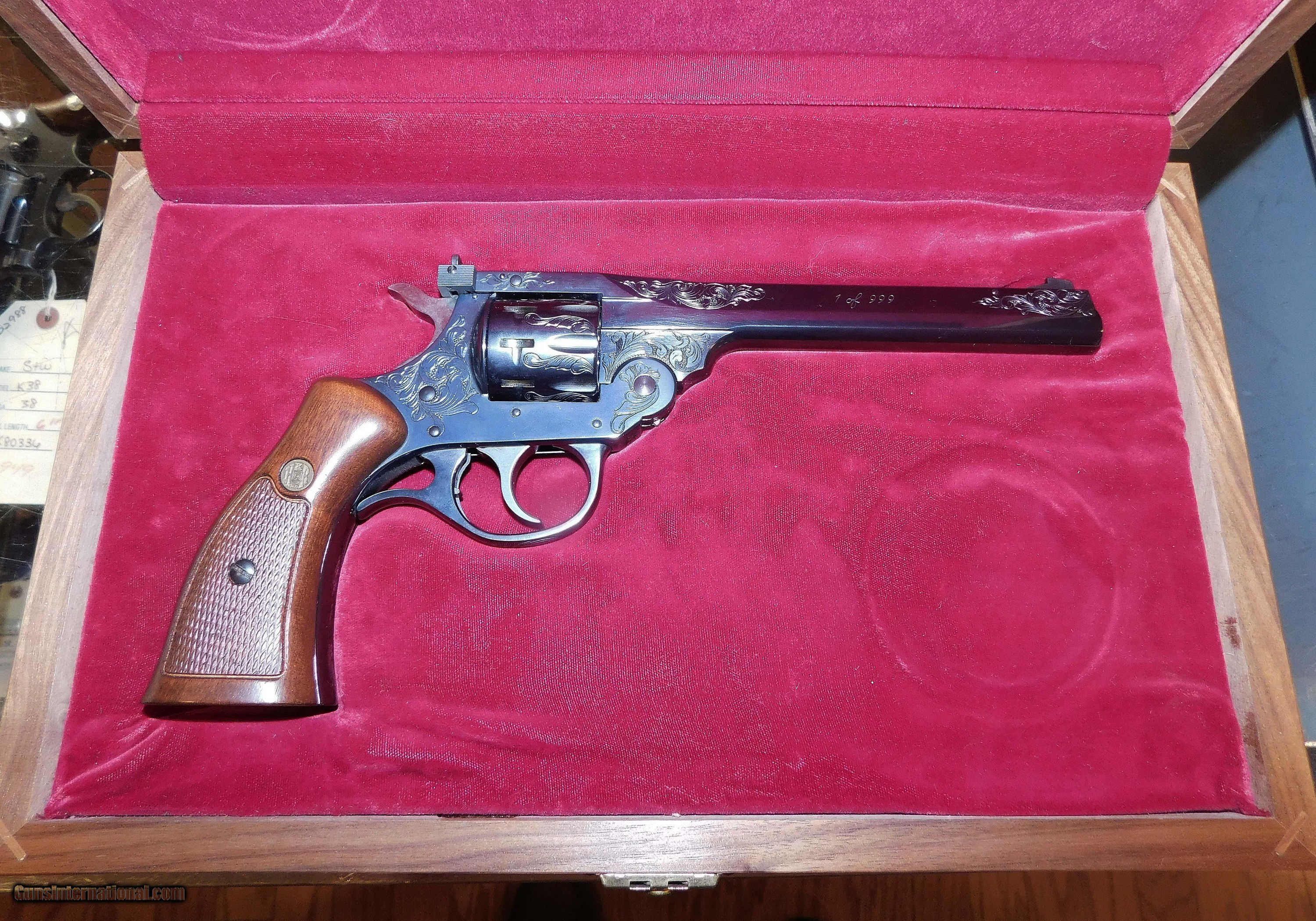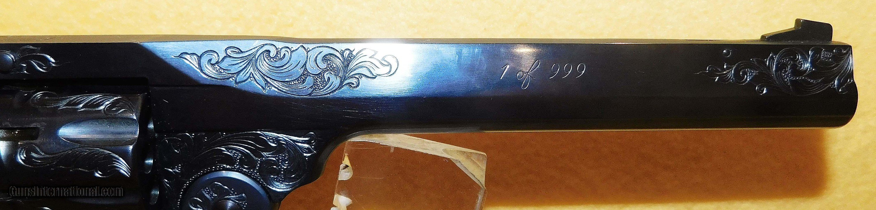 Description: H&R 999 IN .22 L.R. CAL., WITH 6" BARREL. COLOR BLUE. CONDITION 98% LIKE NEW UNFIRED. SERIAL NUMBER 999206. H&R MODEL 1 0F 999 IN .22 L.R. CAL., THIS FIRE ARM IS 206 FO 999, (WORCESTER MASS.),FACTORY ENGRAVING, COMES WITH CHECKERED ROPER WALNUT GRIPS, VELVET LINED WALNUT DISPLAY CASE WITH SLEEVE, MISSING THE MEDALLION FROM THE CASE, 98% LIKE NEW UNFIRED OVERALL CONDITION, OUR STOCK # D3413 SOLD |