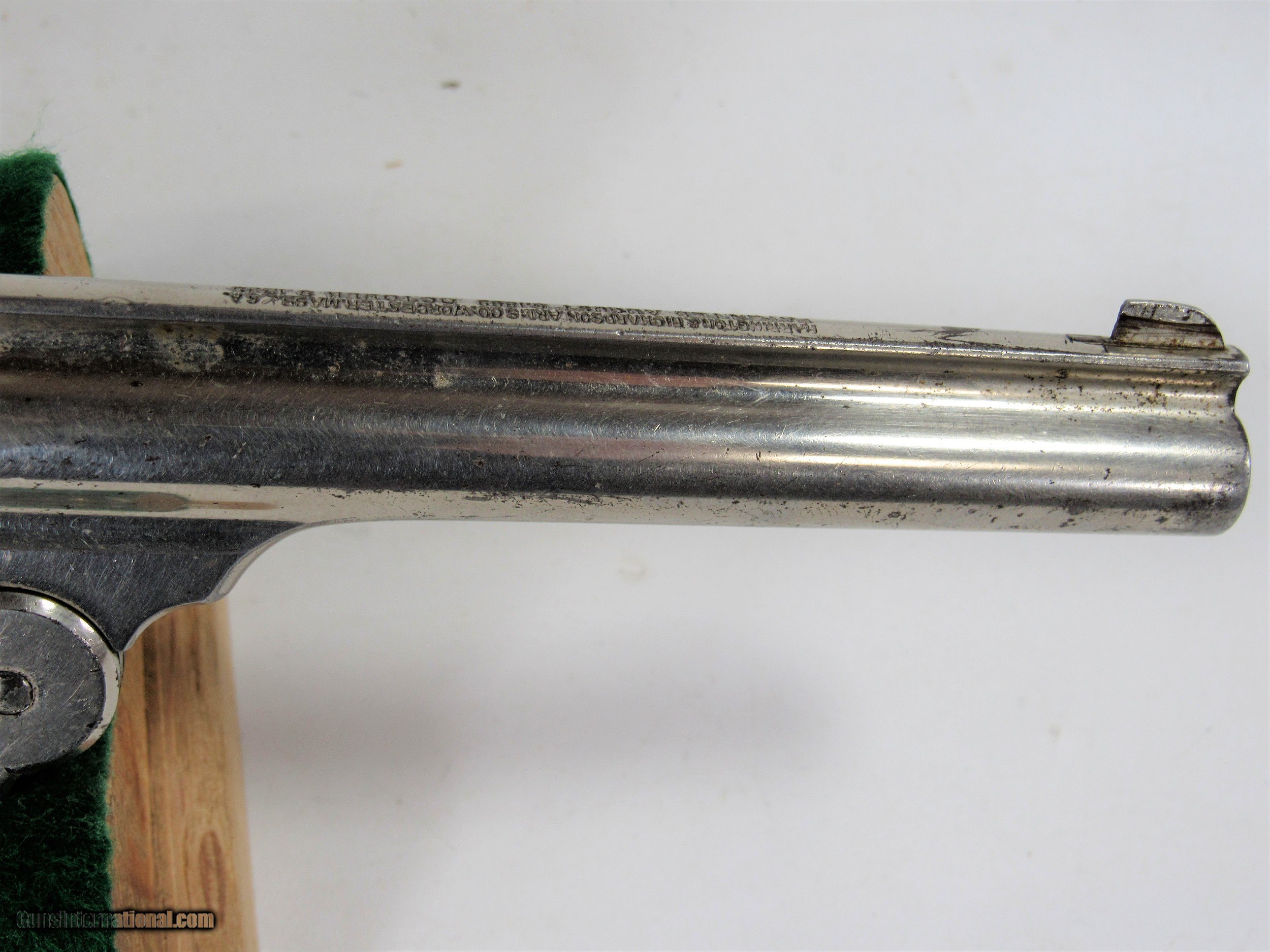 Description: H&R AUTO EJECTING THIRD MODEL SECOND VARIATION. MADE 1909-1912. 85% NICKEL. NICE BORE. FUNCTIONS GOOD. CHIP IN THE BOTTOM OF ONE GRIP. SOLD Curio/Relic: Yes Handgun Caliber: .32 S&W |