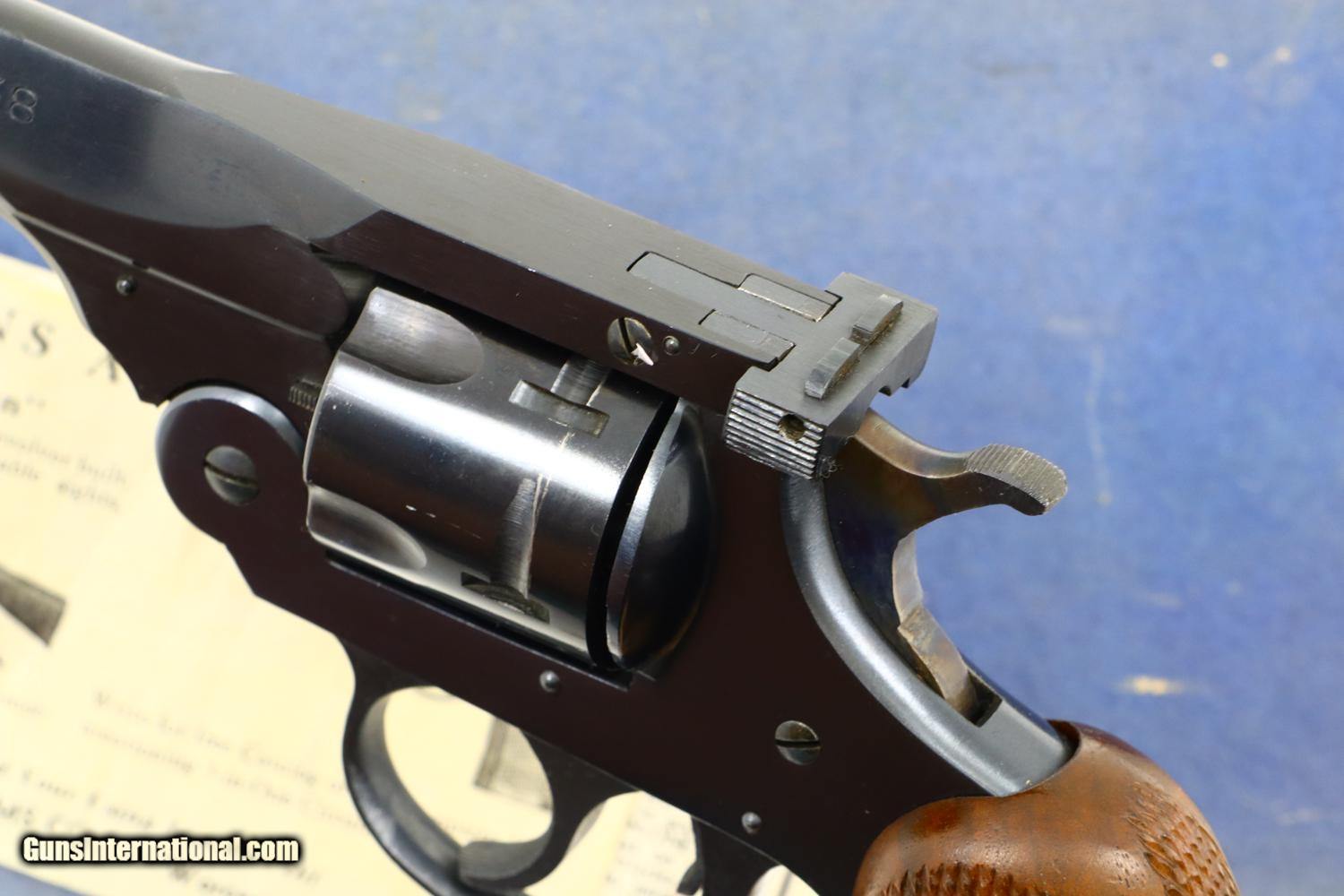 Excellent, retaining 98-99% original blue with cylinder ring as imaged and a tiny ding under the barrel. The hammer retains nearly all its case-hardened colors. The checkered walnut grip in comparable condition. Mirror bore. The action functions well excepting that the hand does not catch to rotate the cylinder on one chamber. The shipping box is VG/Excellent with shelf wear as expected along with early separations. One of the harder to find H&R revolvers especially in such exceptional condition with shipping box and literature.