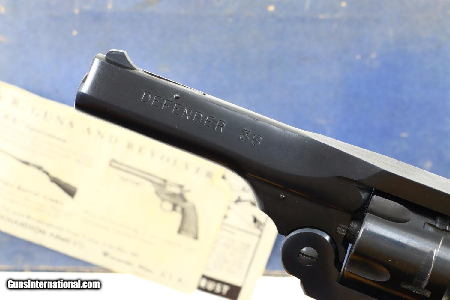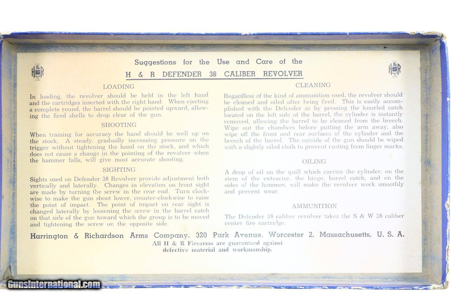 Excellent H&R, Defender 38, wartime production, with 4” barrel having ramp front and horizontally adjustable rear sight. The left side of the barrel is marked Defender 38 while the H&R address is on the right along with the caliber reference. Full serial number on the front strap with last three digits repeated at rear of cylinder and extractor star. Major components blued with color cased hardened hammer and single piece grip having three checkered panels. Complete with an original blue shipping box, details on unnumbered end label, instructions printed inside lid. Also present is a strip of period literature that advertises this revolver.