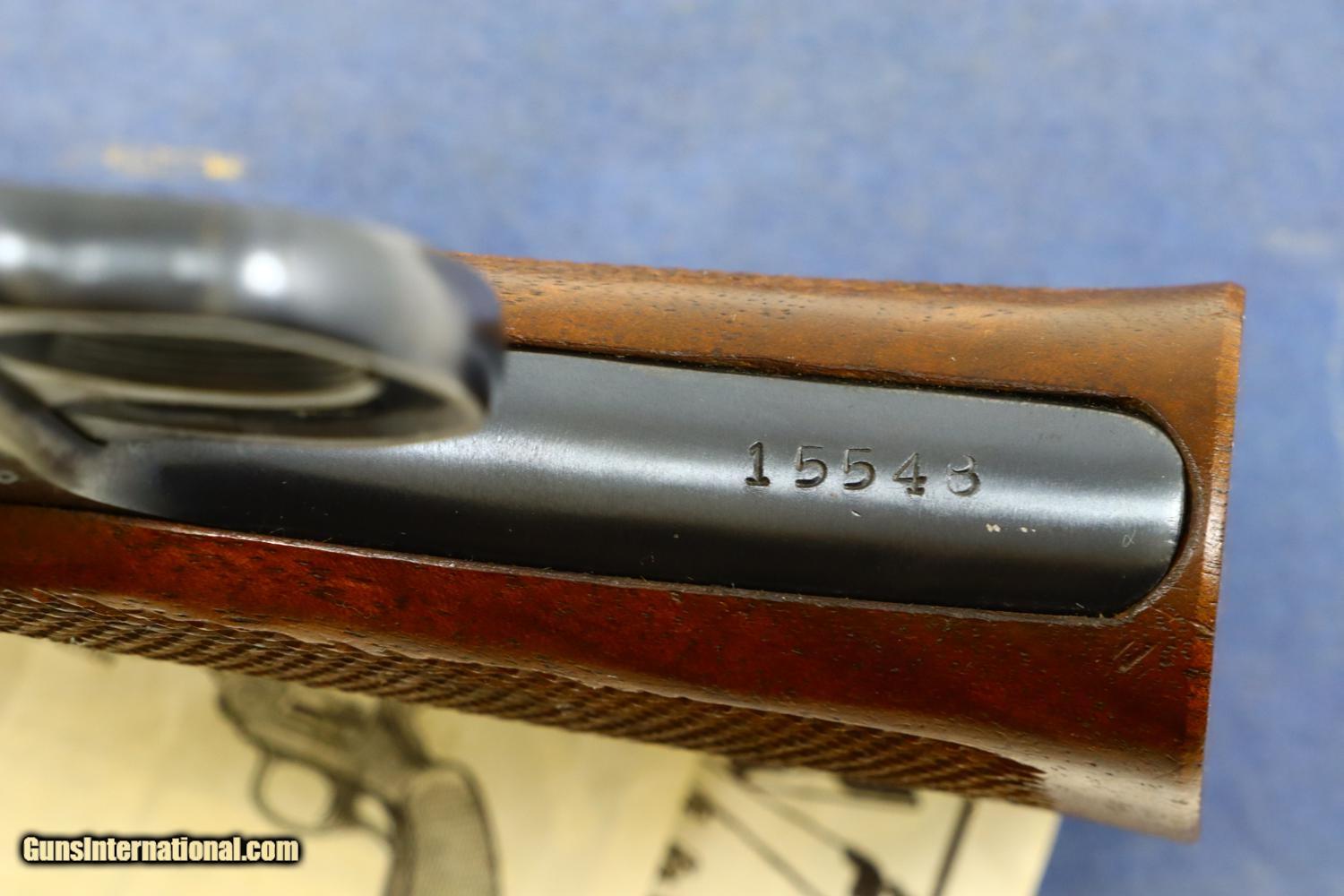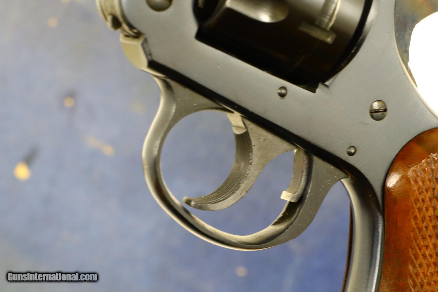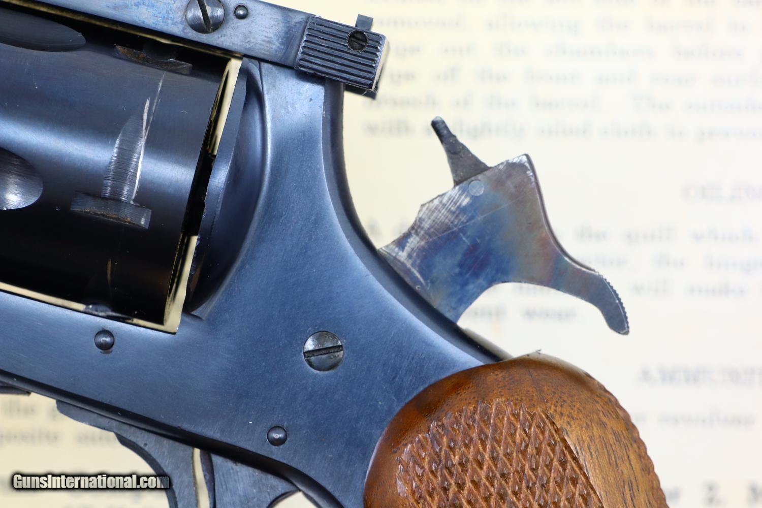 Description: Excellent H&R, Defender 38, wartime production, with 4” barrel having ramp front and horizontally adjustable rear sight. The left side of the barrel is marked Defender 38 while the H&R address is on the right along with the caliber reference. Full serial number on the front strap with last three digits repeated at rear of cylinder and extractor star. Major components blued with color cased hardened hammer and single piece grip having three checkered panels. Complete with an original blue shipping box, details on unnumbered end label, instructions printed inside lid. Also present is a strip of period literature that advertises this revolver. Synopsis: H&R, Defender 38, Original box, .38 S&W, 15548, A-1608 Condition: Excellent, retaining 98-99% original blue with cylinder ring as imaged and a tiny ding under the barrel. The hammer retains nearly all its case-hardened colors. The checkered walnut grip in comparable condition. Mirror bore. The action functions well excepting that the hand does not catch to rotate the cylinder on one chamber. The shipping box is VG/Excellent with shelf wear as expected along with early separations. One of the harder to find H&R revolvers especially in such exceptional condition with shipping box and literature. ~~Insured shipping fee of $55; most packages shipped using FedEx 2nd Day.~~ SOLD Curio/Relic: Yes Manufacturer: H&R Serial Number: 15548 Caliber Info: 38 S&W |