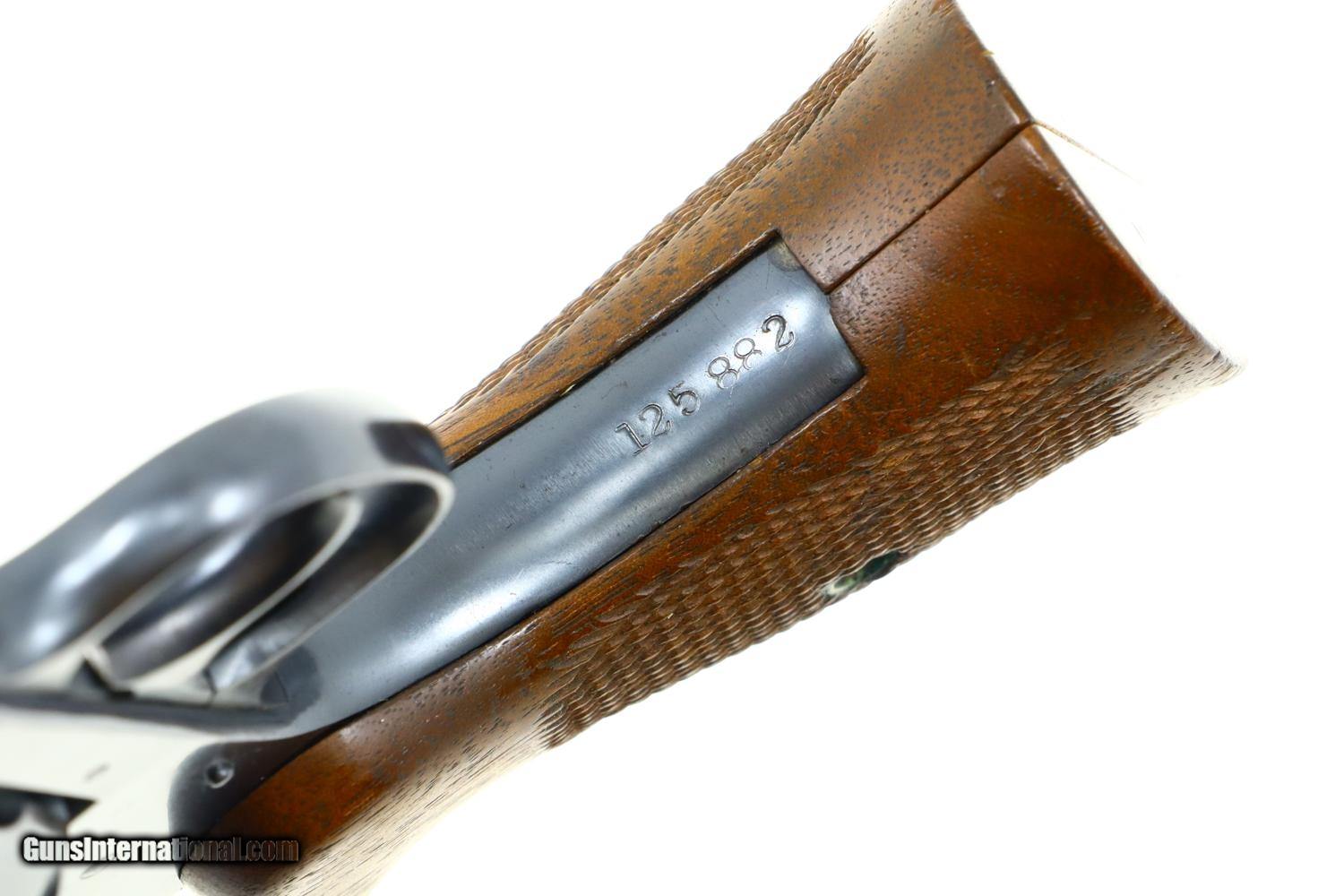 Description: Description: Low production H&R Metropolitan Police Revolver, only 700 assembled between 1924-1926 with that particular marking, characteristics otherwise as per the more familiar Trapper. This example has a 6” octagon barrel with a half moon front sight and a notched rear sight. The model markings and caliber appearing on the left side. Full serial number on front strap with the last two digits repeated at rear of cylinder. Fitted with two piece checkered wood grips secured with a single screw. Synopsis: Very Scarce H&R, Metropolitan Police Revolver, .22 LR, 125882, A-1607 Condition: Approximately 97% original blue. Sides and top of the case hardened hammer have been freshened. Near excellent grips. Bright bore with sharp rifling. Cylinder indexes properly. A very unusual appearing revolver, especially by today’s standards, particularly when marking a 22 caliber revolver for the Metropolitan Police! SOLD Manufacturer: H&R Serial Number: 125882 Caliber Info: .22 LR |