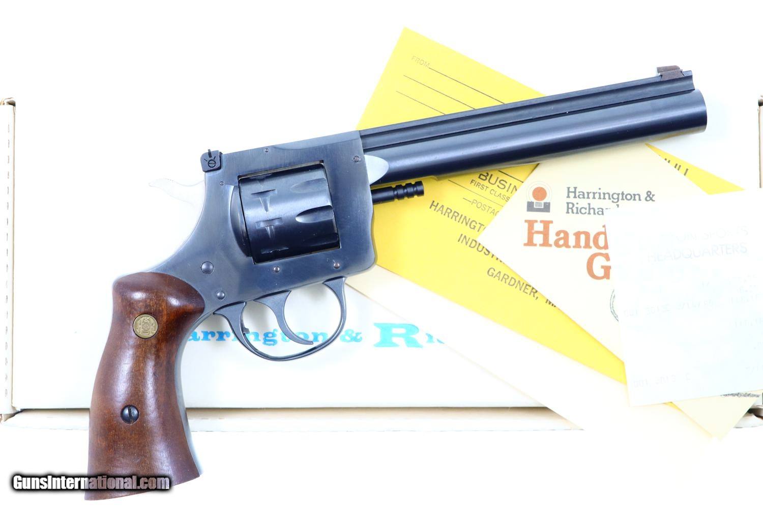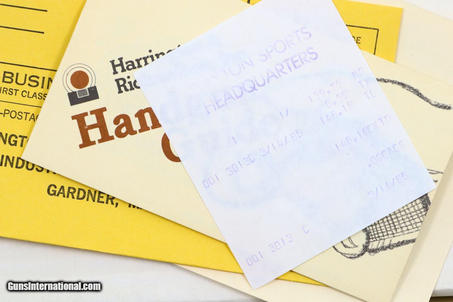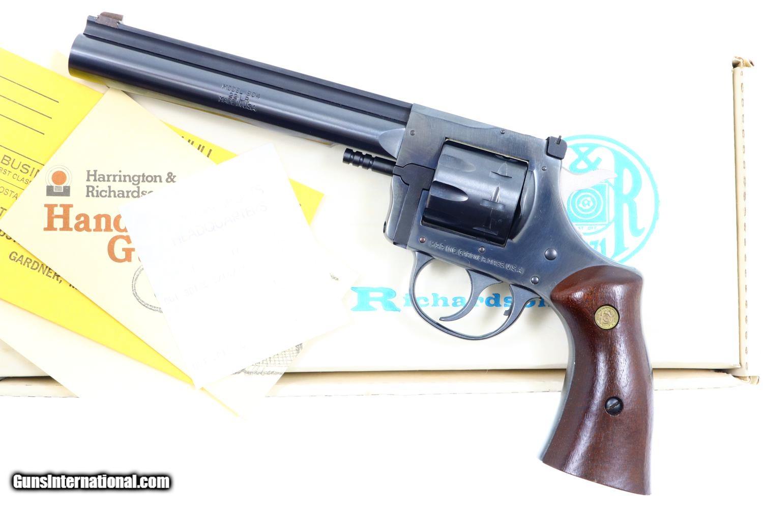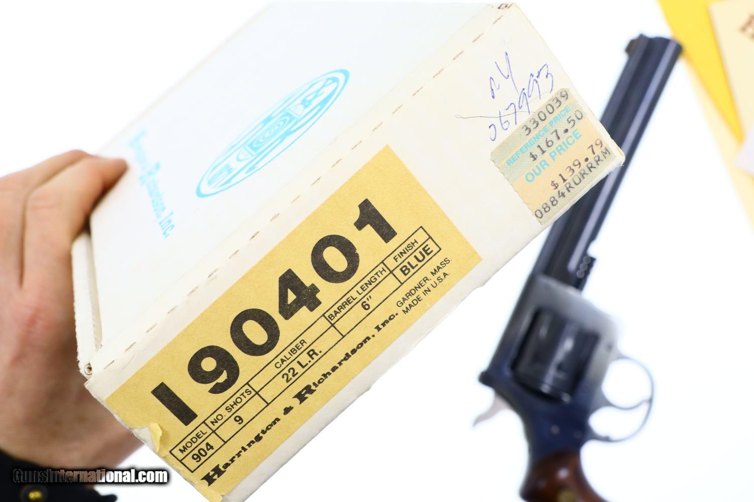 Description: Synopsis: Harrington & Richardson, H&R, Model 904 target revolver. Description: H&R target revolver, 9-shot, .22 LR, with 6 inch bull barrel, fully adjustable rear sight, and generously proportioned smooth walnut grips. Virtually NIB with warranty card and original purchase receipt from 1985. Condition: 99+%, bright original blue finish. Comparable condition bore and grips. Excellent original shipping box and warranty cards. A wonderful example whose condition would be nearly impossible to improve upon. ~~Insured shipping fee of $45; most packages shipped using FedEx 2nd Day.~~ SOLD Manufacturer: H&R Serial Number: AY067993 Caliber Info: .22 LR |
