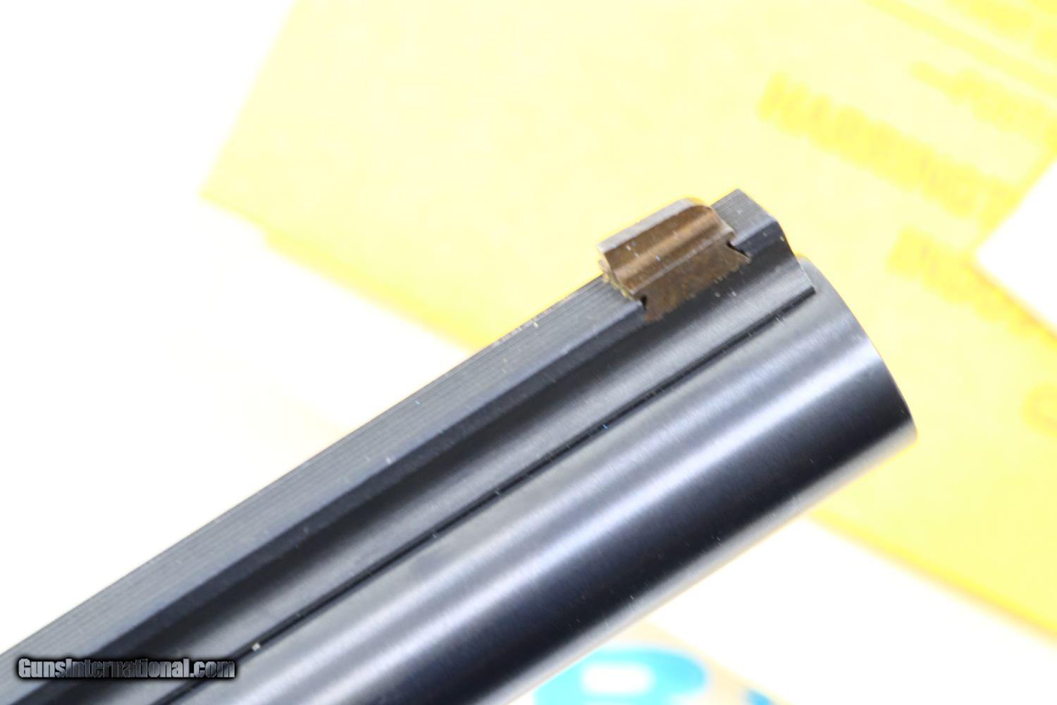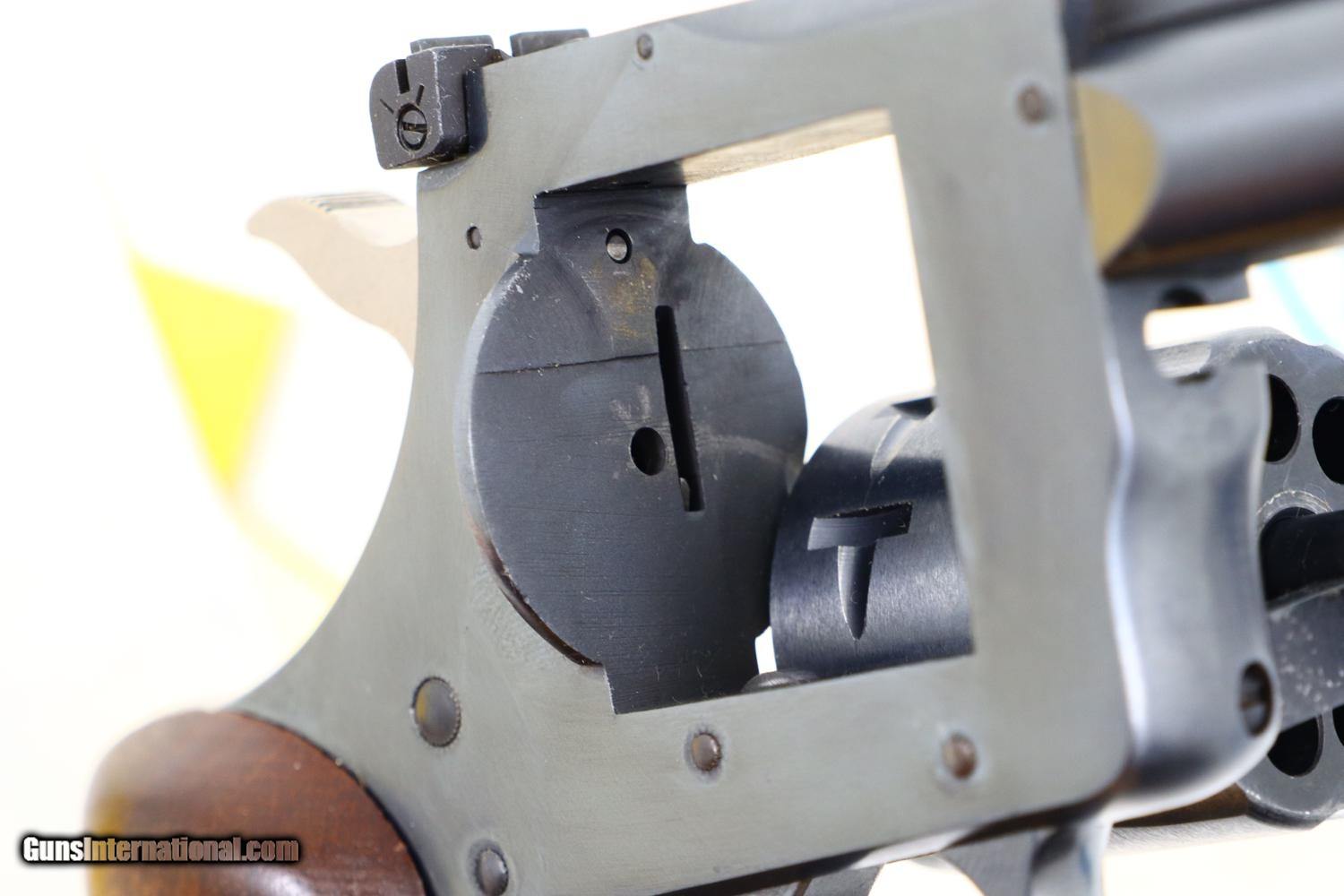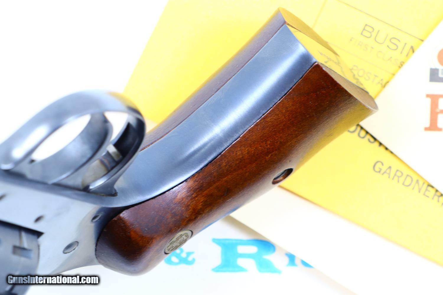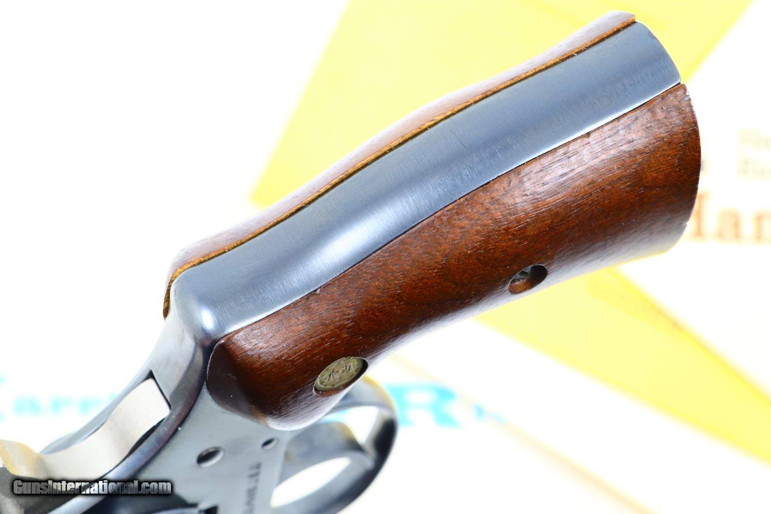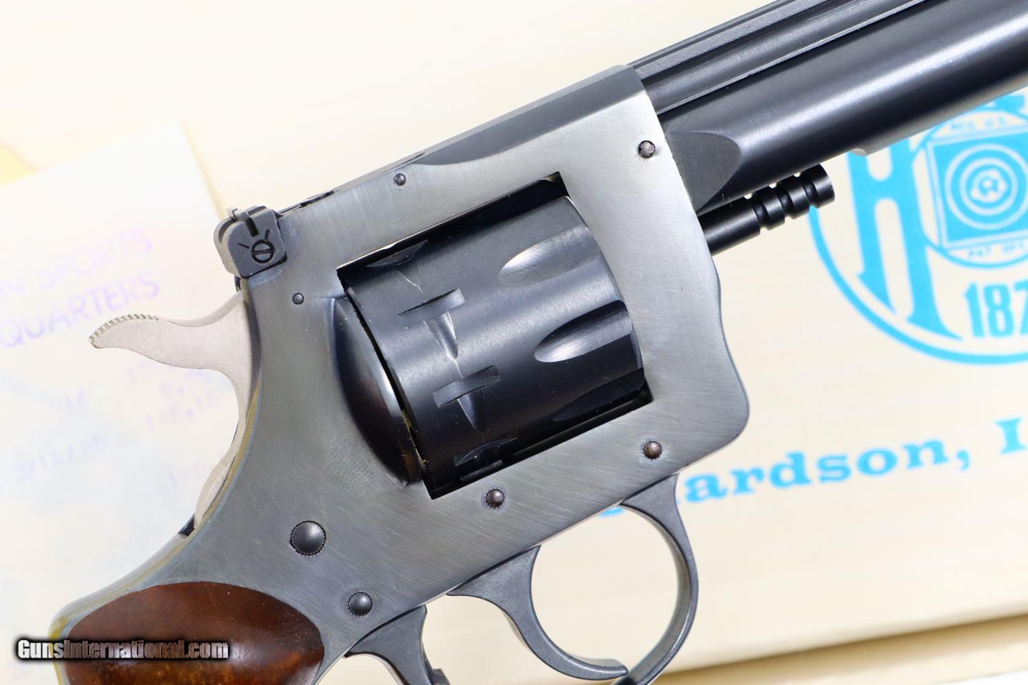 Description: Synopsis: Harrington & Richardson, H&R, Model 904 target revolver. Description: H&R target revolver, 9-shot, .22 LR, with 6 inch bull barrel, fully adjustable rear sight, and generously proportioned smooth walnut grips. Virtually NIB with warranty card and original purchase receipt from 1985. Condition: 99+%, bright original blue finish. Comparable condition bore and grips. Excellent original shipping box and warranty cards. A wonderful example whose condition would be nearly impossible to improve upon. ~~Insured shipping fee of $45; most packages shipped using FedEx 2nd Day.~~ SOLD Manufacturer: H&R Serial Number: AY067993 Caliber Info: .22 LR |