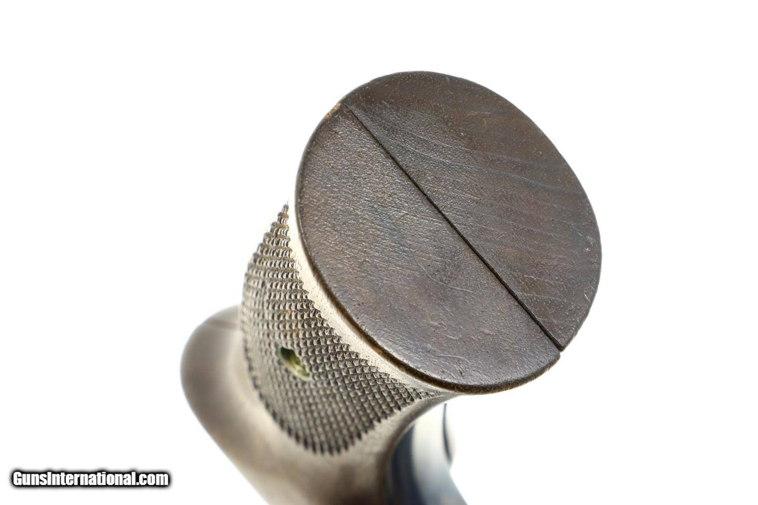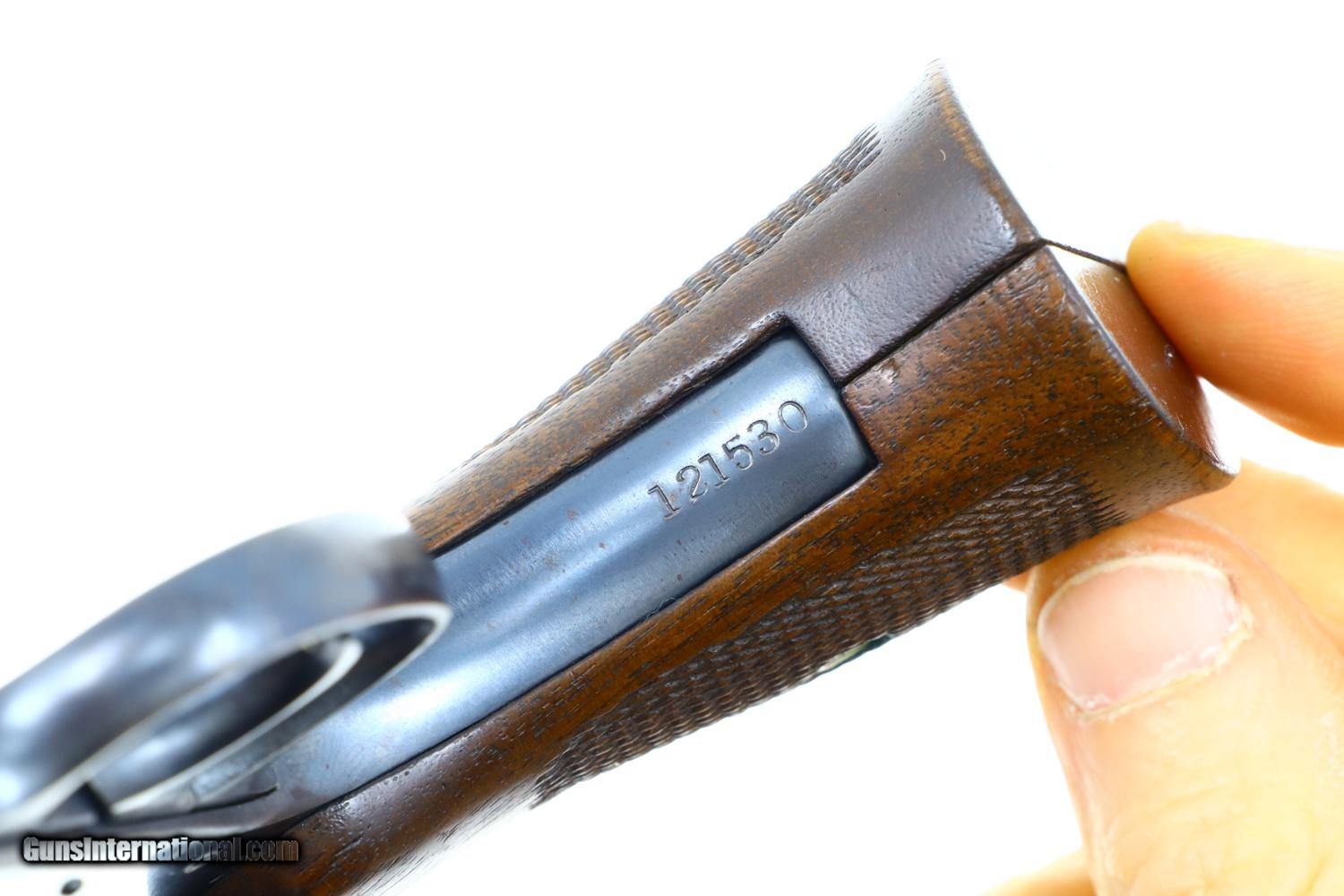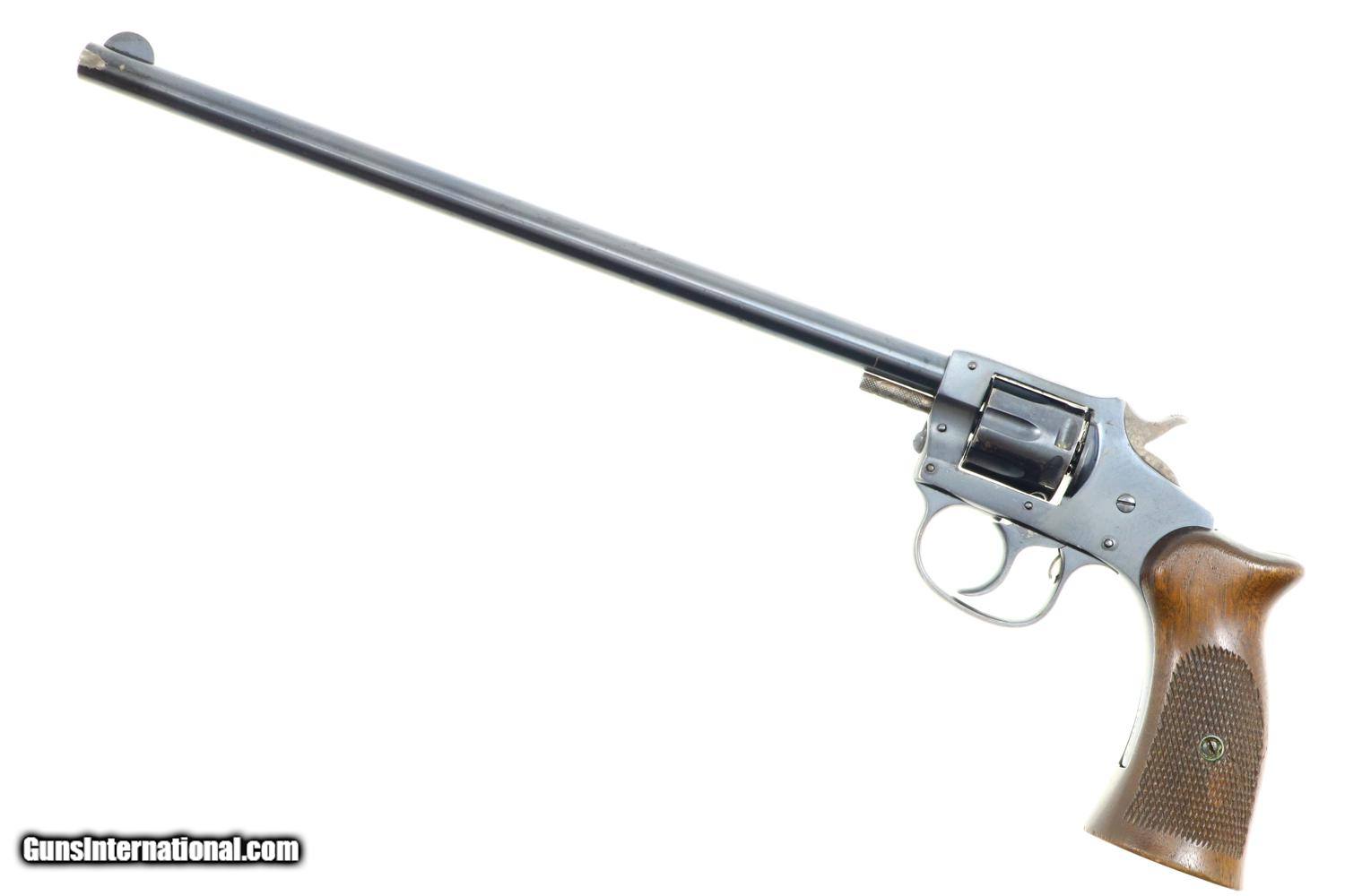Description: A very high condition example of the seldom encountered H&R Hunter with a 10” barrel having fixed front and notched rear sight. “Hunter Model” marked on top strap. Full serial number on front strap. Last three digits, partially bored out on back of cylinder. Major and most minor components blued with case colored checkered spur hammer. Walnut saw grips with generous border less checkering on each panel. Synopsis: Striking H&R Model Hunter SA/DA Revolver, 10” Barrel, .22RF Condition: Approx 95% bright original blue with a spot of blue loss on the left side of muzzle, sharp edge wear and scattered freckling in usual locations for a revolver that has seen field use. No suggestion of touch up. Comparable condition grips. Bright bore with sharp rifling. All cylinders index properly with single action cocking. A tough to find H&R revolver, this one in exceptionally nice condition. ~~Insured shipping fee of $55; most packages shipped using FedEx 2nd Day.~~ SOLD Manufacturer: Harrington & Richardson Serial Number: 121530 Caliber Info: 0.22RF |