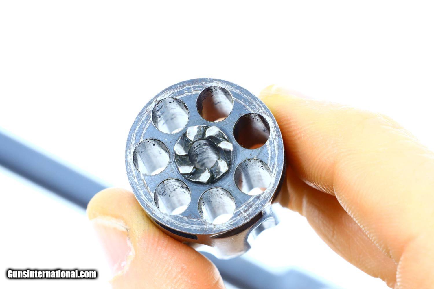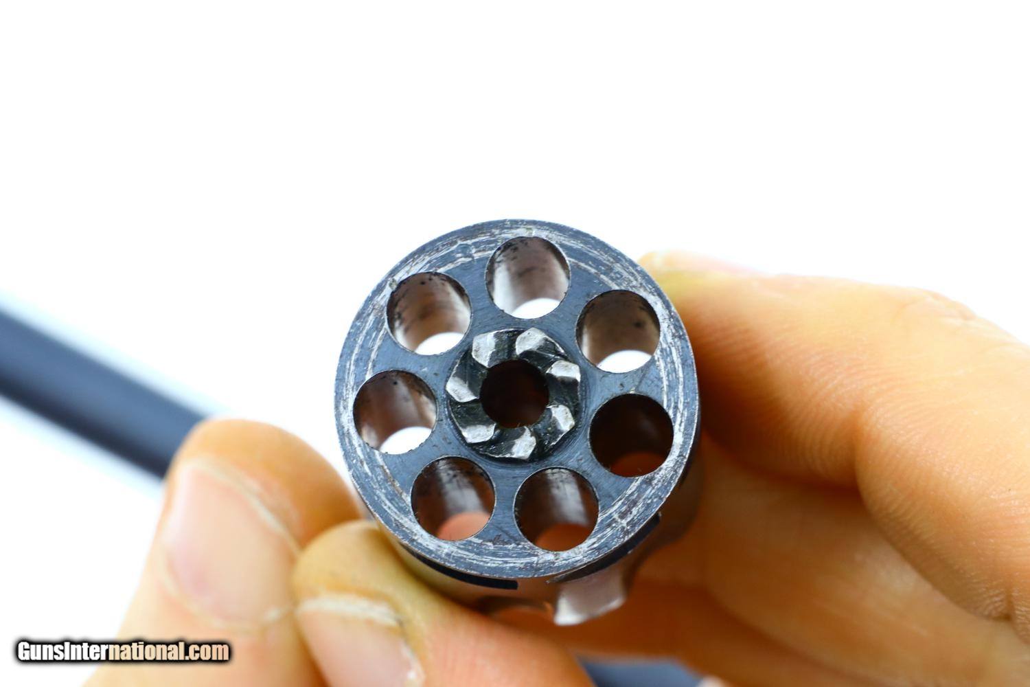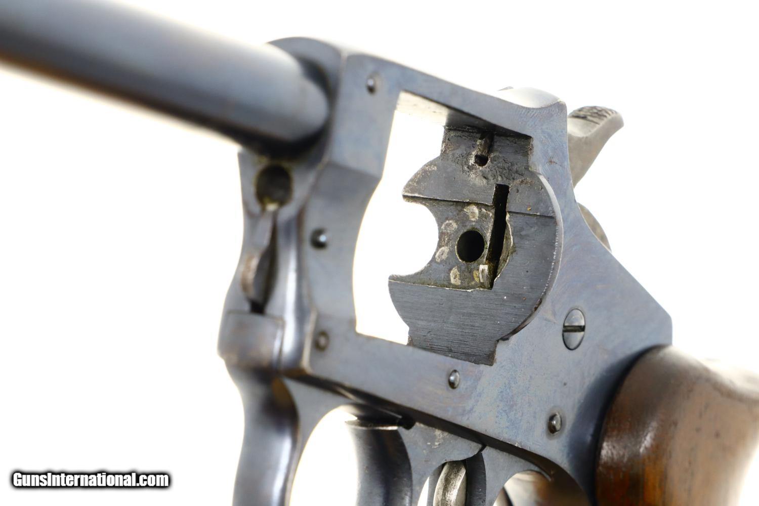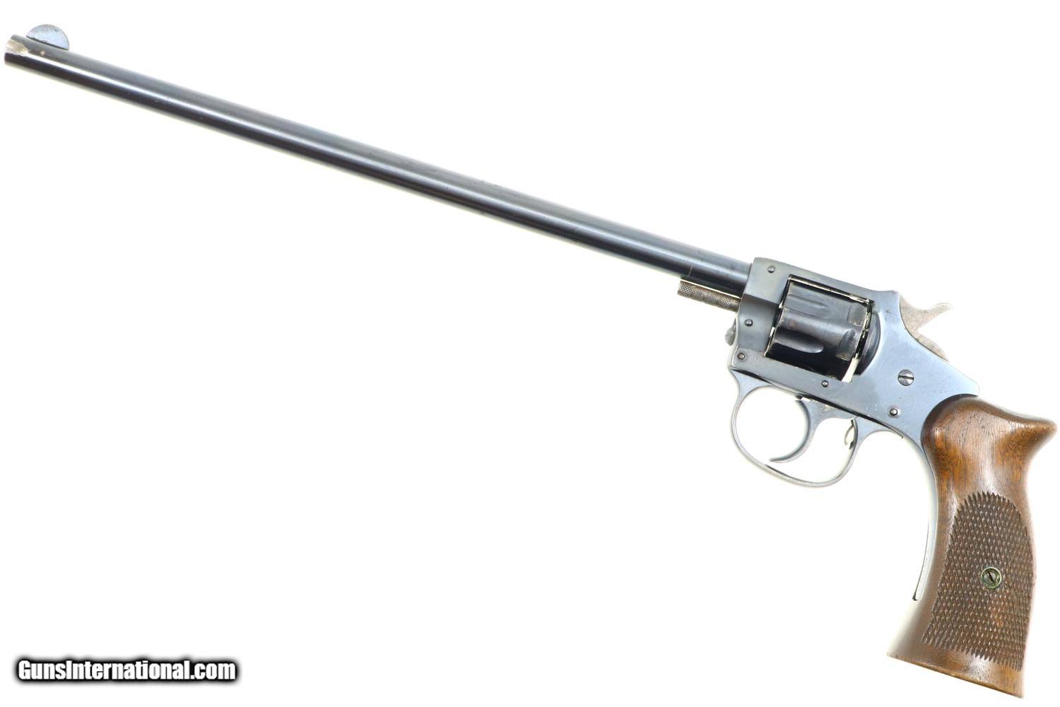 Description: A very high condition example of the seldom encountered H&R Hunter with a 10” barrel having fixed front and notched rear sight. “Hunter Model” marked on top strap. Full serial number on front strap. Last three digits, partially bored out on back of cylinder. Major and most minor components blued with case colored checkered spur hammer. Walnut saw grips with generous border less checkering on each panel. Synopsis: Striking H&R Model Hunter SA/DA Revolver, 10” Barrel, .22RF Condition: Approx 95% bright original blue with a spot of blue loss on the left side of muzzle, sharp edge wear and scattered freckling in usual locations for a revolver that has seen field use. No suggestion of touch up. Comparable condition grips. Bright bore with sharp rifling. All cylinders index properly with single action cocking. A tough to find H&R revolver, this one in exceptionally nice condition. ~~Insured shipping fee of $55; most packages shipped using FedEx 2nd Day.~~ SOLD Manufacturer: Harrington & Richardson Serial Number: 121530 Caliber Info: 0.22RF |