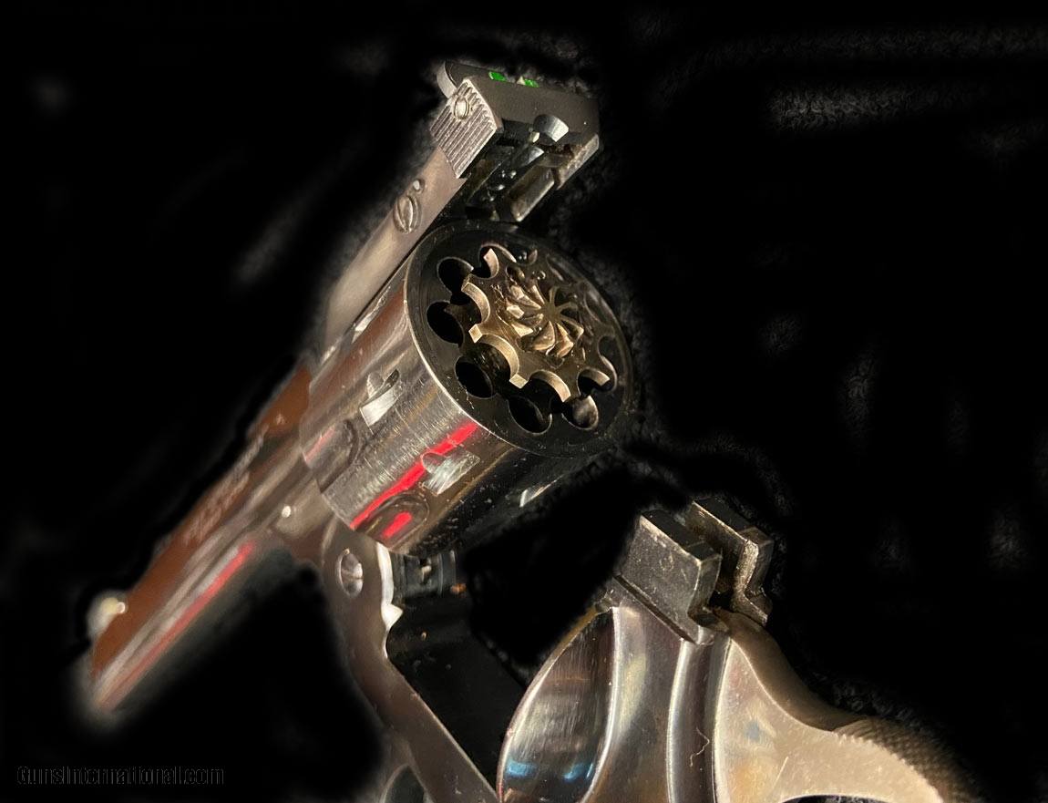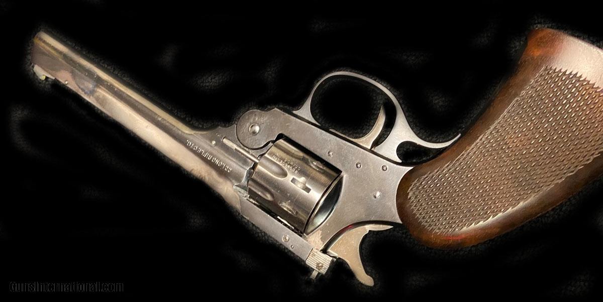 Description: SOLD PENDING FUNDS Nine shot break action revolver in nice shape, single action only, with hi viz sights and 6" barrel. Neat camp gun, train your wife and kids to shoot. SOLD |