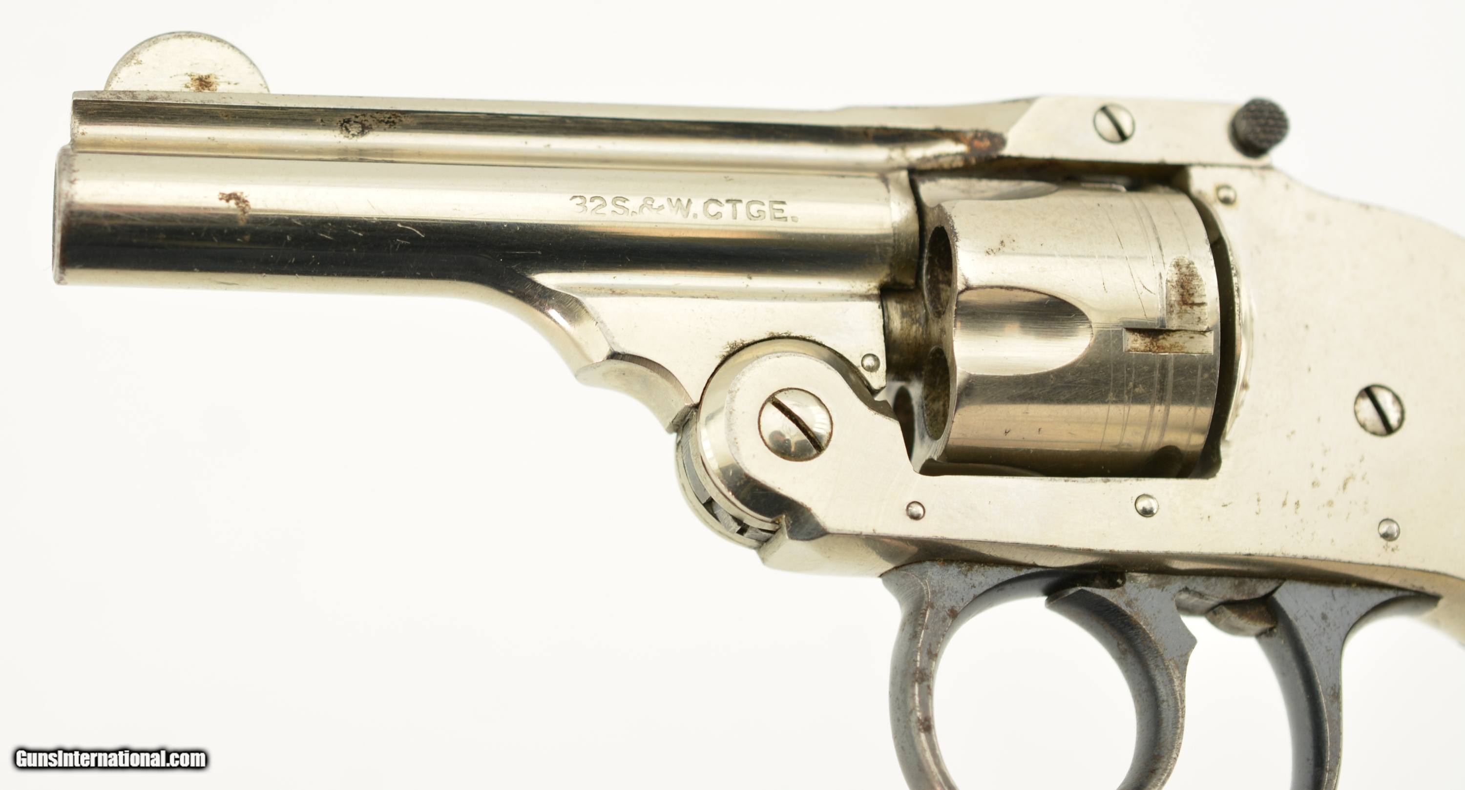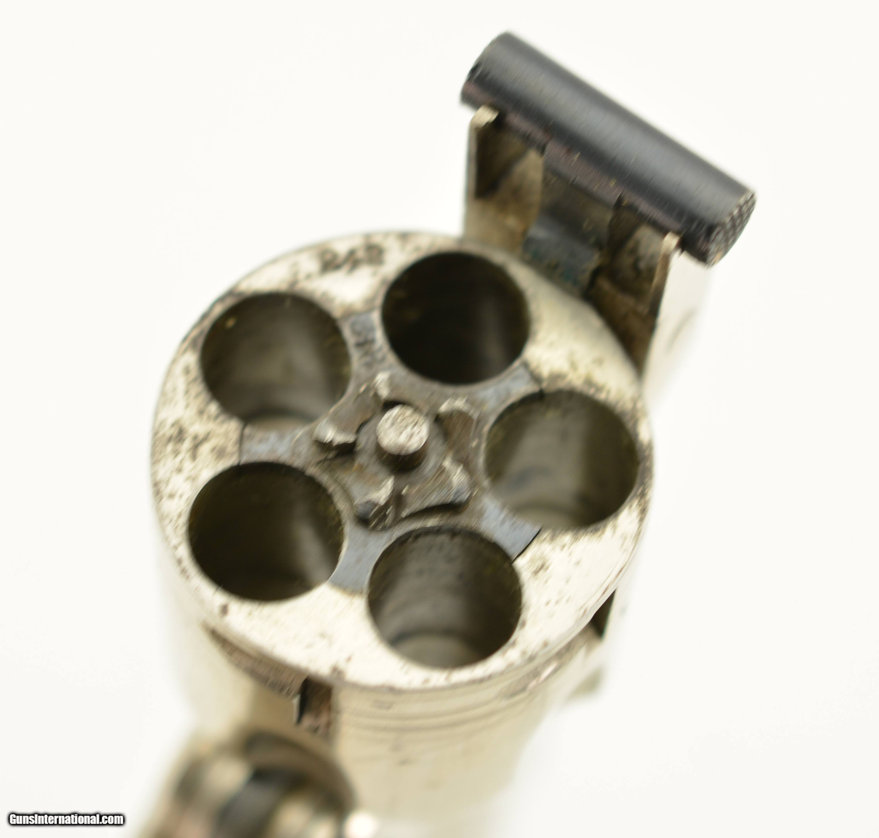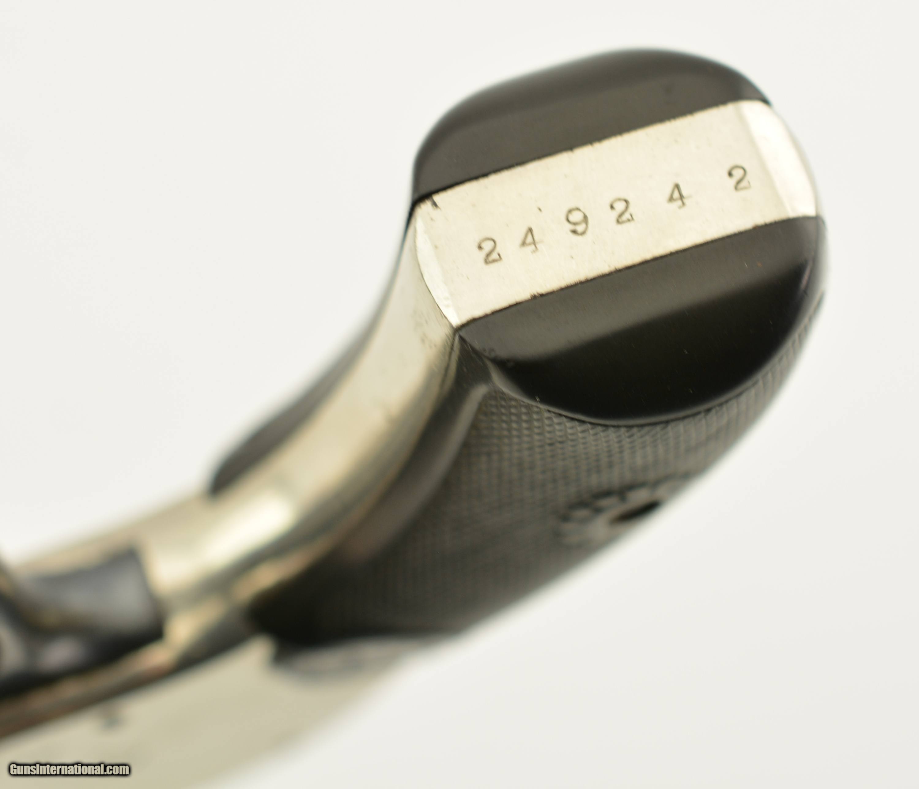 Description: Serial #249242, .32 S&W, 3 inch solid ribbed barrel with a very fine dark bore with strong rifling and light roughness. This is the H&R Hammerless second model small frame top break revolver built for smokeless powder built in the second decade of the 1900's. It has the caliber designation on the left side of the barrel with the top of the barrel marked “HARRINGTON & RICHARDSON ARMS COMPANY / WORCESTER, MASS. U.S.A. PAT OCT. 8 1895" and has all matching numbers. In excellent condition the single action revolver retains about 92-95% of the original bright nickel finish with some scattered flaking on the frame and cylinder which also shows turn marks. The hard rubber target logo grips are excellent with some wear to the high points. An excellent H&R Hammerless. FFL or C&R SOLD Curio/Relic: Yes Manufacturer: H&R Model: 2nd Model Serial Number: 249242 Caliber Info: .32 S&W Gauge Info: .32 S&W |