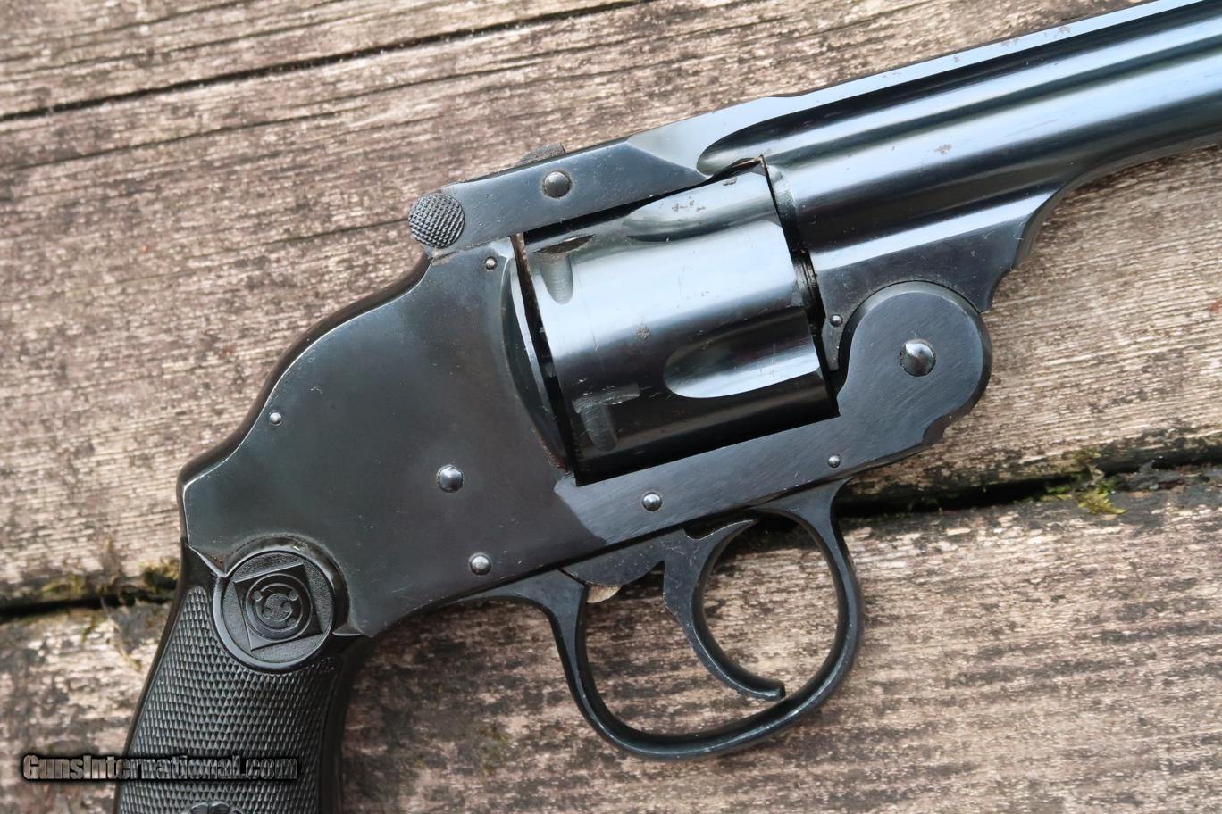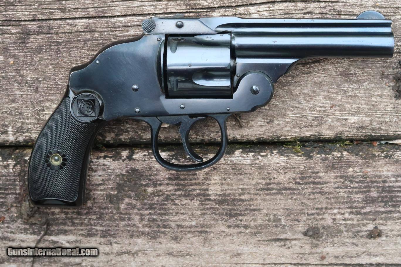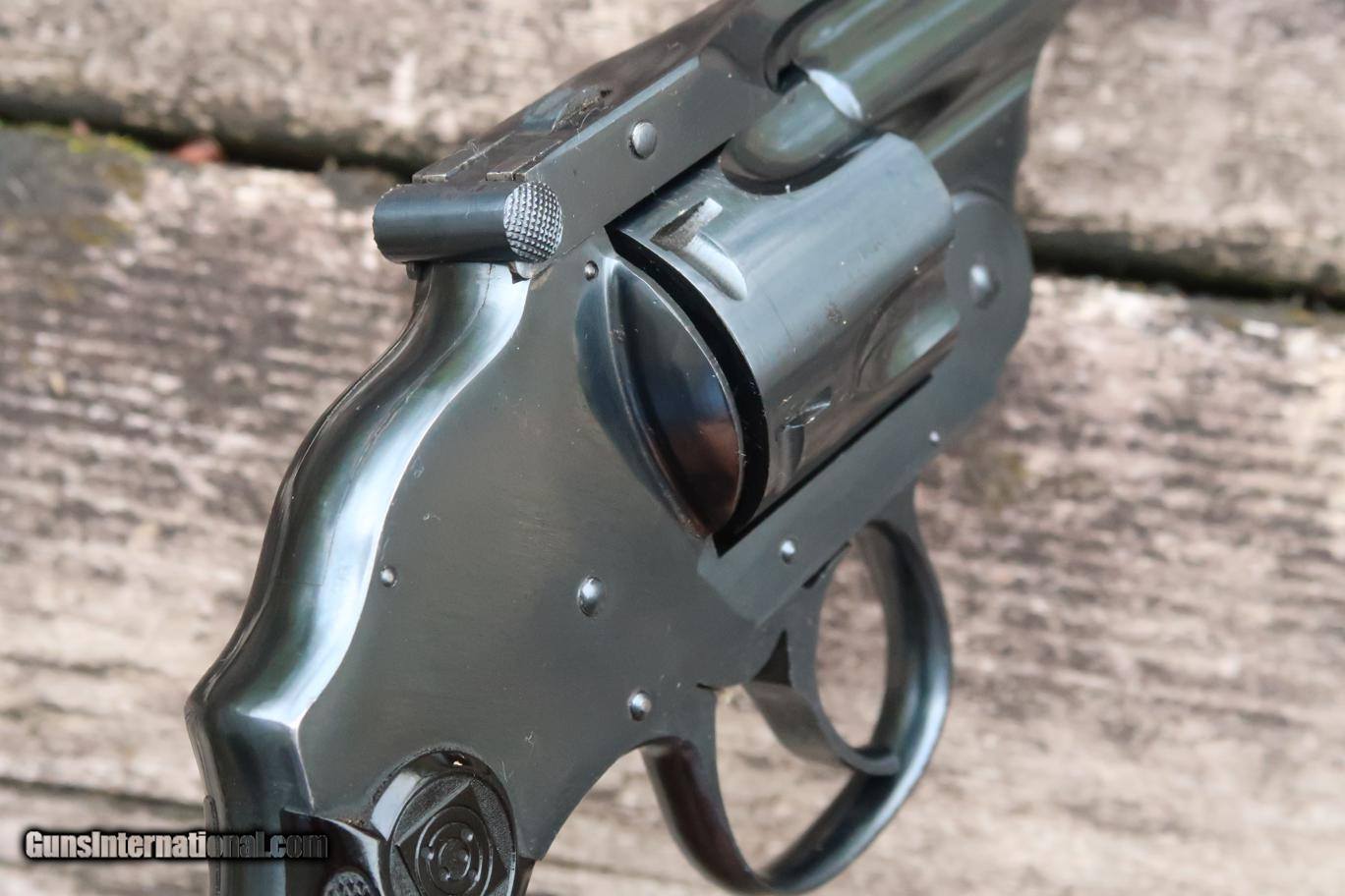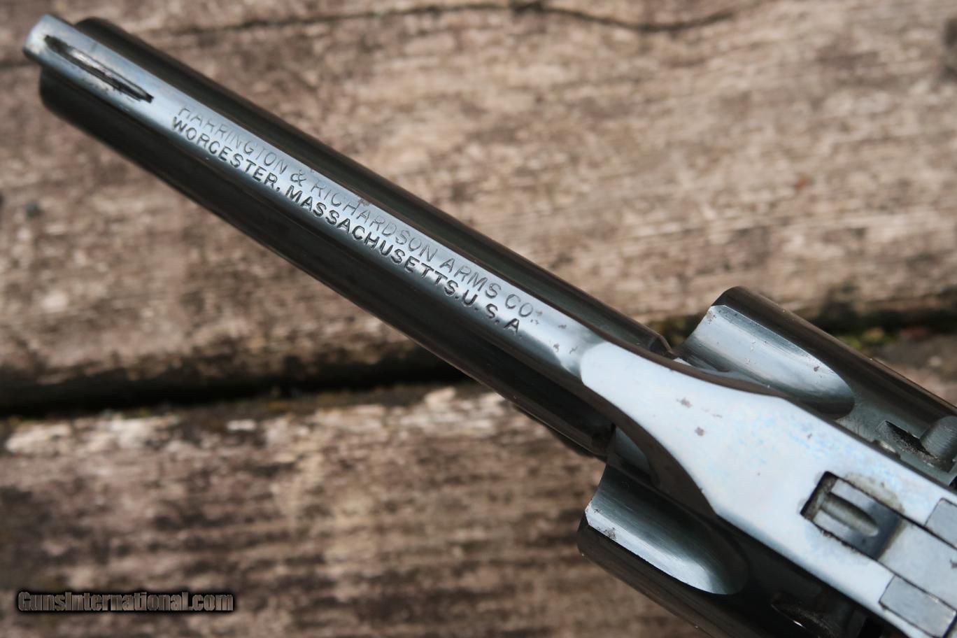 Description: This H&R in 38 S&W has a 3 1/4” ribbed round barrel, with fixed sights, top break action, and 5-shot cylinder. The latch and trigger are blued and the frame is fitted with black checkered hard rubber grips. Manufacturer address is on the barrel rib, caliber is on the left side of the barrel, and serial number is on the butt. Synopsis: A gorgeous 100 year old H&R large frame hammerless revolver from an iconic American manufacturer. Condition: Bright 98+% blue, with very little evidence of use. Most of the "wear" relates to the few scattered freckles and a small scratch on the left side of the frame. The faint cylinder ring does not break the blue and the recoil shield shows no evidence of use beyond the usual test firing. Mirror bore. A wonderfully high condition large frame hammerless H&R that would be extremely difficult to improve upon short of finding an example NIB. ~~Insured shipping fee of $45; most packages shipped using FedEx 2nd Day.~~ SOLD Manufacturer: Harrington & Richardson Serial Number: 179938 Caliber Info: 38 S&W |
