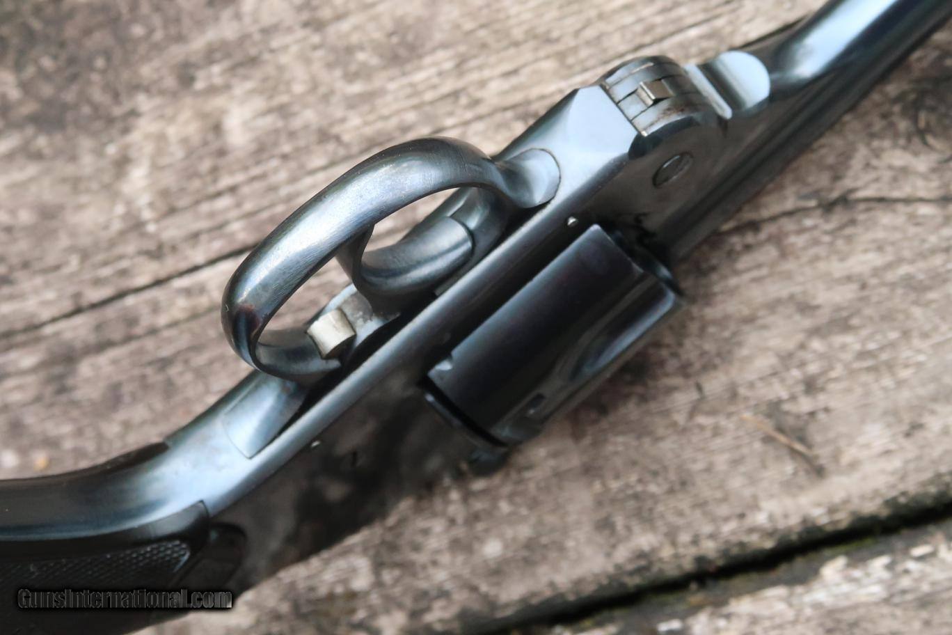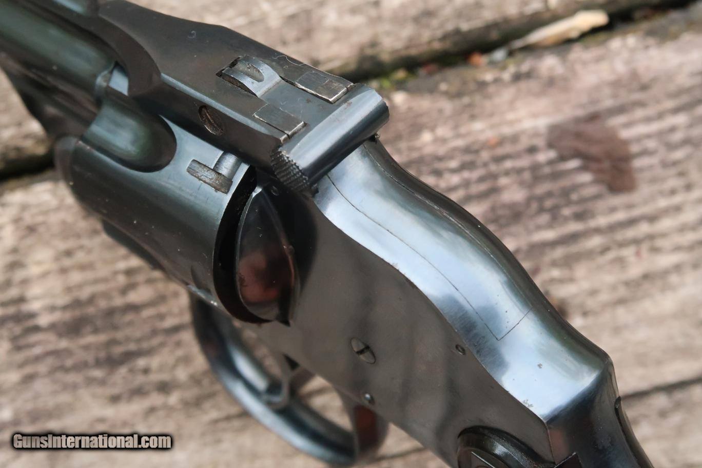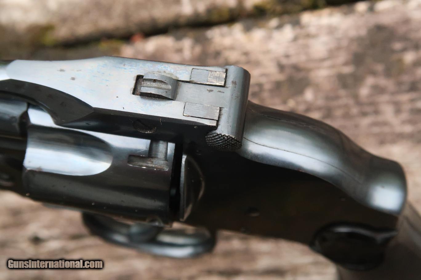 Description: This H&R in 38 S&W has a 3 1/4” ribbed round barrel, with fixed sights, top break action, and 5-shot cylinder. The latch and trigger are blued and the frame is fitted with black checkered hard rubber grips. Manufacturer address is on the barrel rib, caliber is on the left side of the barrel, and serial number is on the butt. Synopsis: A gorgeous 100 year old H&R large frame hammerless revolver from an iconic American manufacturer. Condition: Bright 98+% blue, with very little evidence of use. Most of the "wear" relates to the few scattered freckles and a small scratch on the left side of the frame. The faint cylinder ring does not break the blue and the recoil shield shows no evidence of use beyond the usual test firing. Mirror bore. A wonderfully high condition large frame hammerless H&R that would be extremely difficult to improve upon short of finding an example NIB. ~~Insured shipping fee of $45; most packages shipped using FedEx 2nd Day.~~ SOLD Manufacturer: Harrington & Richardson Serial Number: 179938 Caliber Info: 38 S&W |