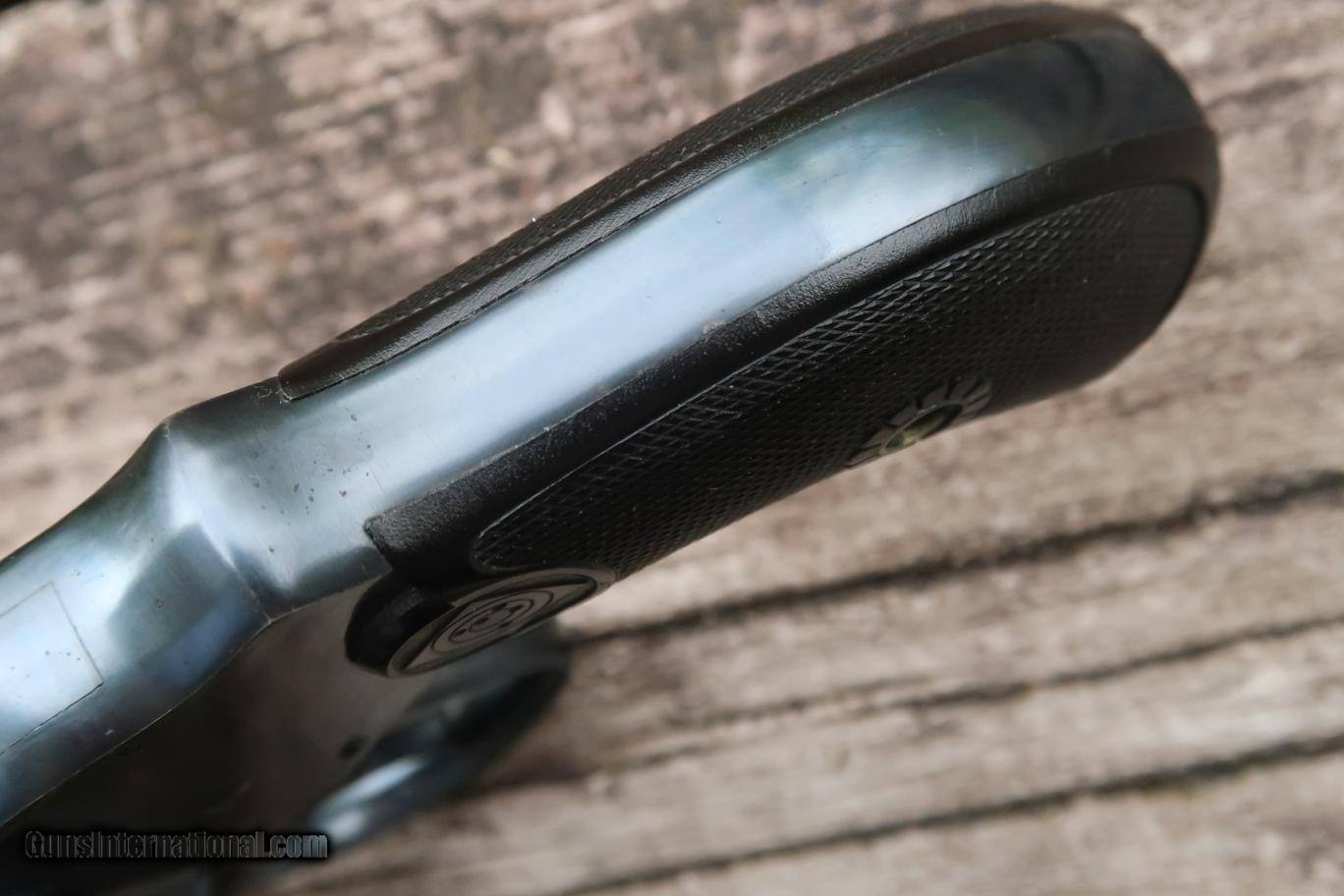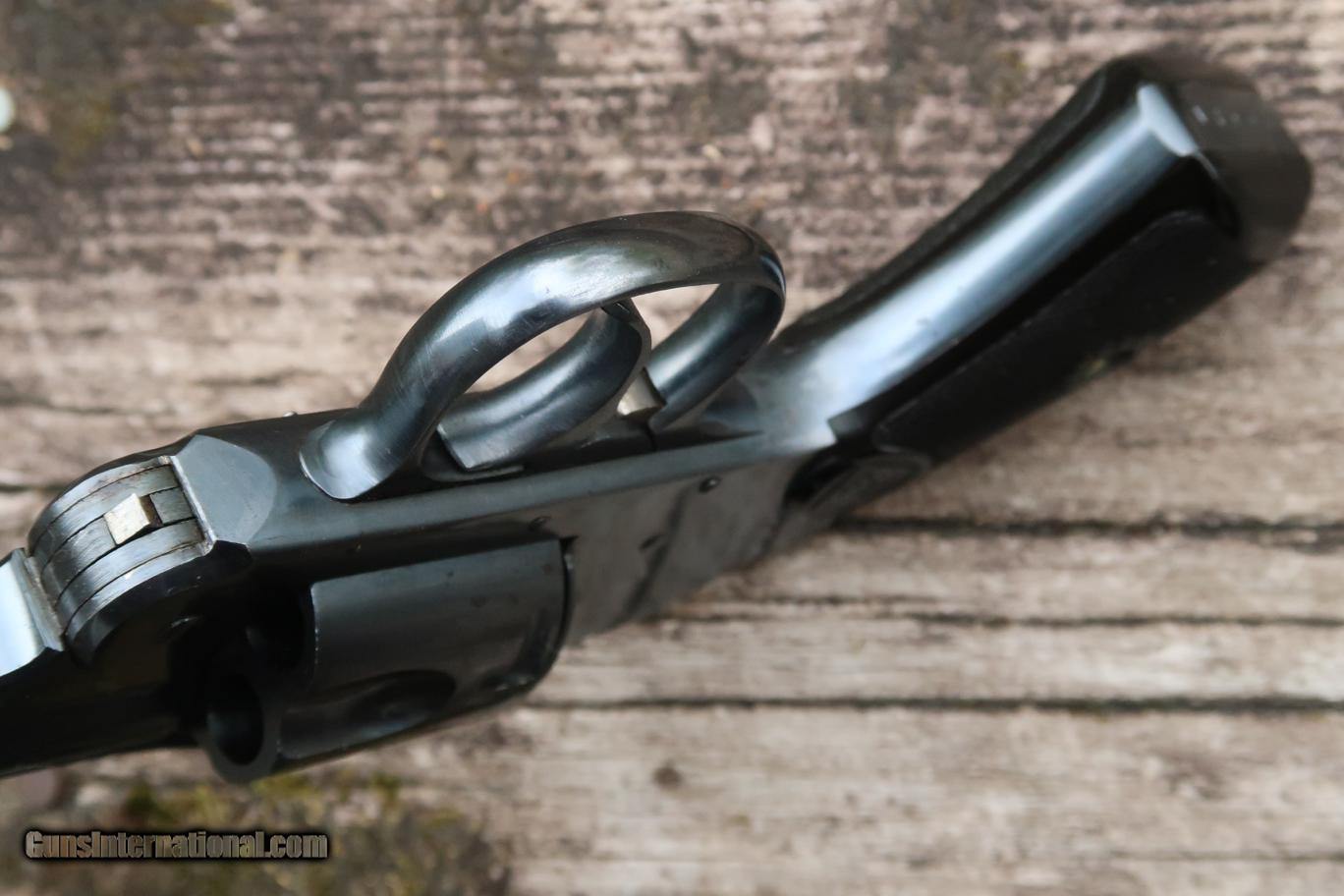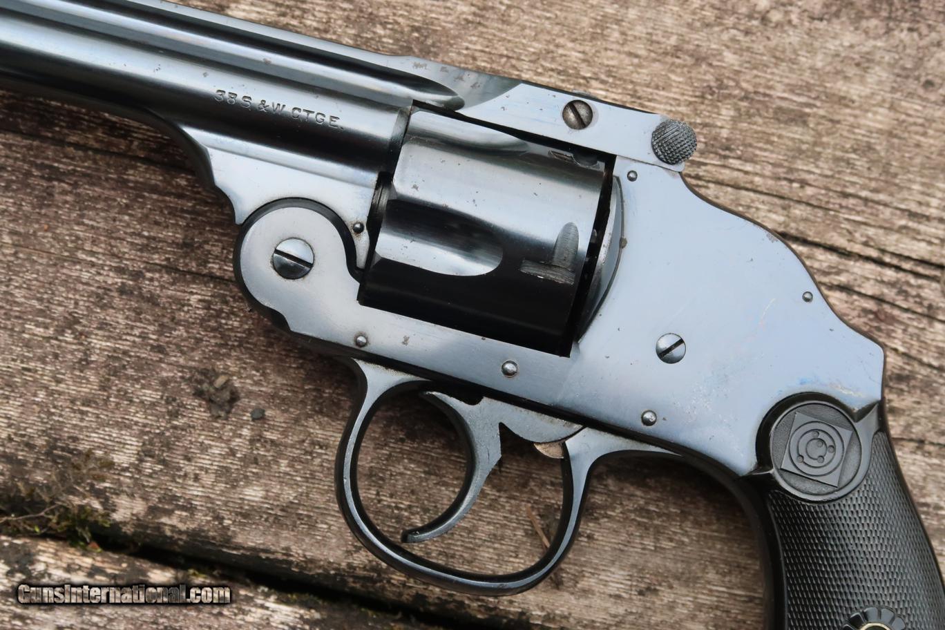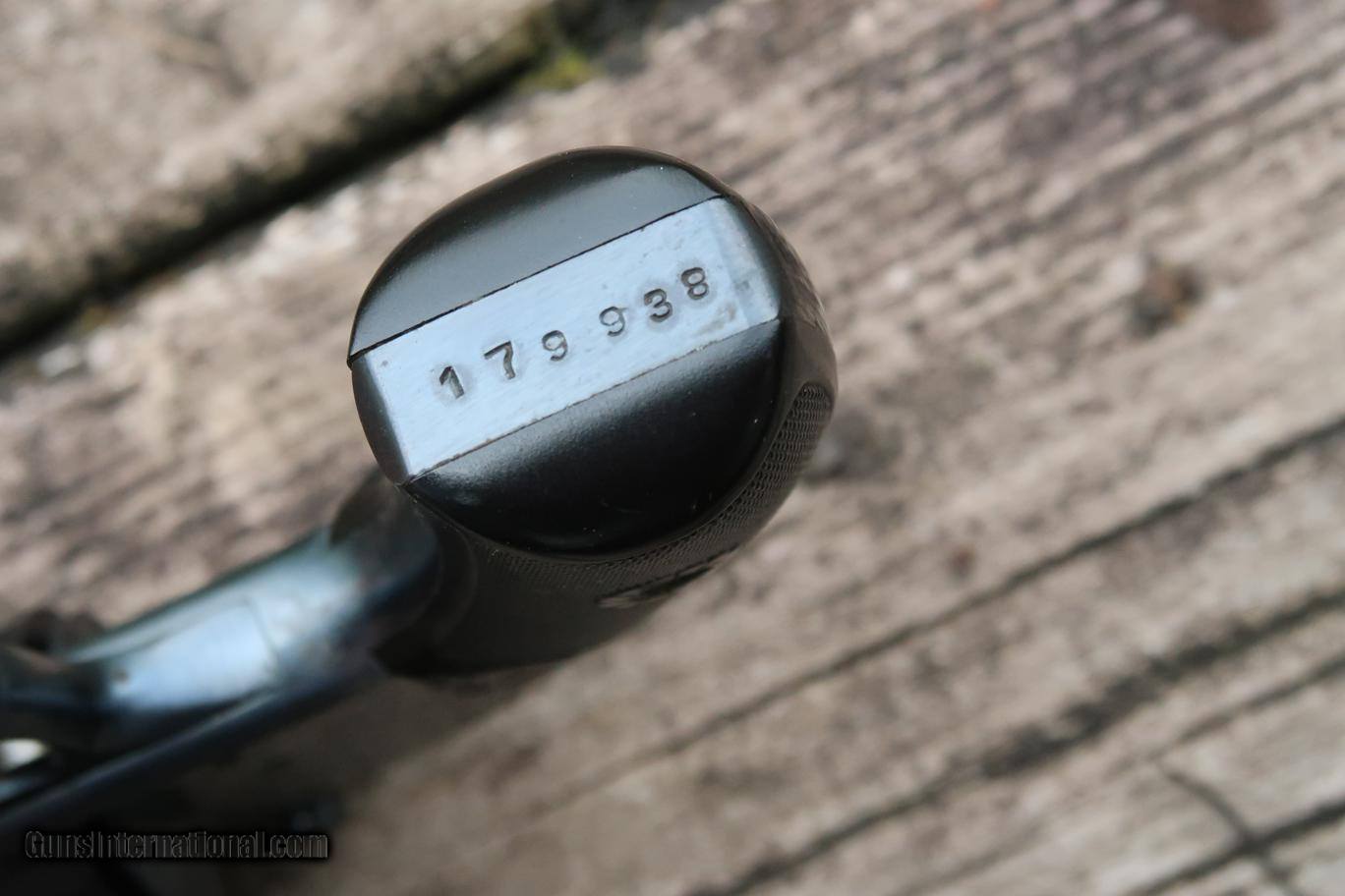 Description: This H&R in 38 S&W has a 3 1/4” ribbed round barrel, with fixed sights, top break action, and 5-shot cylinder. The latch and trigger are blued and the frame is fitted with black checkered hard rubber grips. Manufacturer address is on the barrel rib, caliber is on the left side of the barrel, and serial number is on the butt. Synopsis: A gorgeous 100 year old H&R large frame hammerless revolver from an iconic American manufacturer. Condition: Bright 98+% blue, with very little evidence of use. Most of the "wear" relates to the few scattered freckles and a small scratch on the left side of the frame. The faint cylinder ring does not break the blue and the recoil shield shows no evidence of use beyond the usual test firing. Mirror bore. A wonderfully high condition large frame hammerless H&R that would be extremely difficult to improve upon short of finding an example NIB. ~~Insured shipping fee of $45; most packages shipped using FedEx 2nd Day.~~ SOLD Manufacturer: Harrington & Richardson Serial Number: 179938 Caliber Info: 38 S&W |