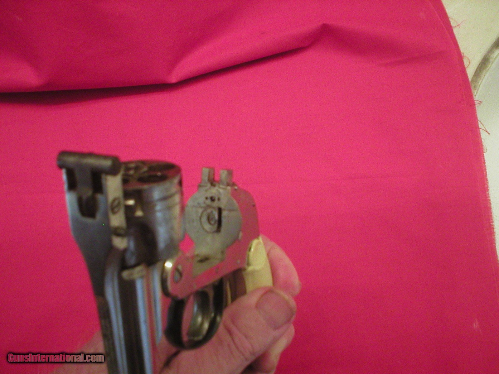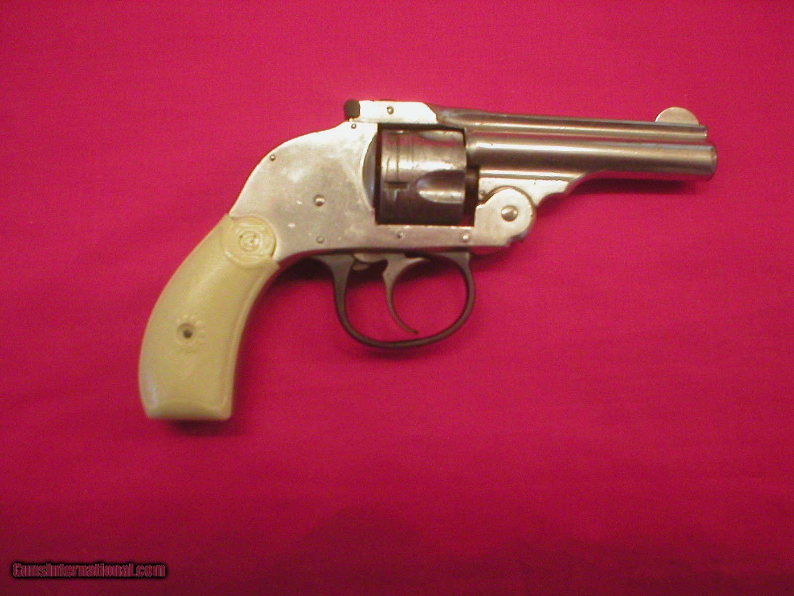 Description: Harrington & Richardson Safety Hammerless Revolver SN. 92XX, 32 S&W, 3" Barrel, Good Condition, Double Action. Revolver Has a Blade Front With Notch Sights. Nickel Finish Shows Light Scattered Tool Marks And Handling And The Checkered Composite Grip Panels Have Been Painted an Off White Cream. The Barrel Rib is Marked in Two Lines With The Address and Patent Dates and The Bore Shines With Some Slight Pitting Present. Revolver Functions as it Should When Trigger Goes Through its Full Motion. $25.00 Shipping. SOLD Antique: Yes Handgun Caliber: .32 S&W Manufacturer: Harrington & Richardson Model: Safety Hammerless Serial Number: 92XX Barrel Length: 3 inch Bore: Good Chambers: 5 Condition: Good Metal Condition: Good Bore Condition: Good Action: Double Action Finish: Nickel Weight: 12 Ounce Manufacture Date: 1896 Item Location: Antelope, Calif. |