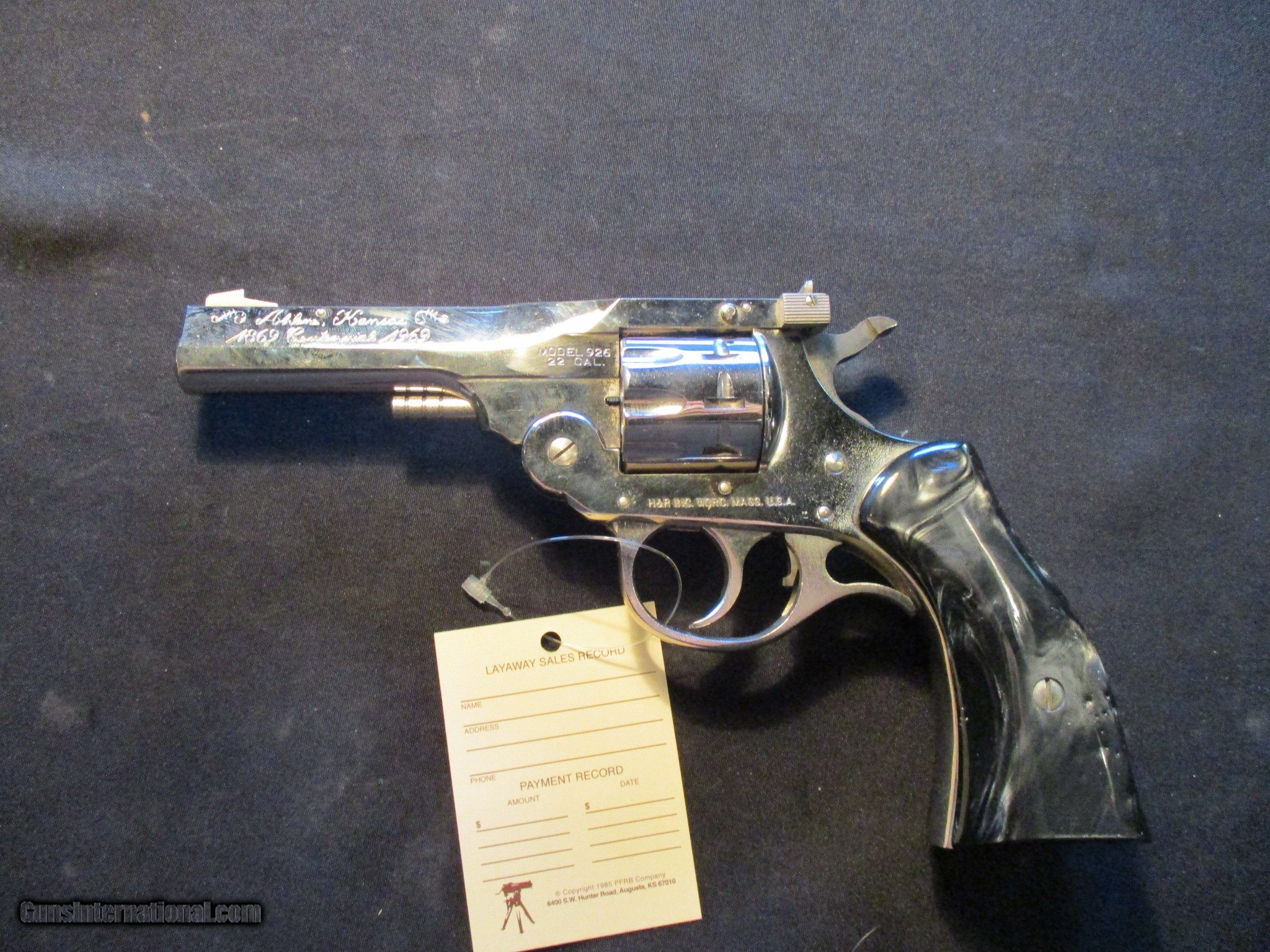 Description: Here is a neat set! Winchester 94 Carbine, 30-30 with a 20" Barrel, all nickled finished. H&R 999, 22LR with a 9 shot cylinder, 6" barrel, all nickel and pearl grips H&R 926, 22LR with a 9 shot cylinder, 4" barrel. All are to commemorative Abilene Kansas! Winchester is stamped 1869-1969 Abilene KS. 926 is also stamped 1869-1969 Abilene KS. The 999 is stamped "End of the Chisholm trail, 1867-1967. All appear to be un-fired, but no boxes. Winchester has a few very minor marks in the wood. All are same number. Email me if you would like these pics sent to you, they will come through bigger and better than on the listing page here. We do offer Lay-A-Way. Our standard terms are 25% down, 90 days. Initial deposit is not refundable. Email me with any questions. I am a store front dealer, and I will close s if the gun sells locally. Once it has aI will pull it from my shelves. Please check your local laws to confirm it is legal to own in your state! Buyer pays $25 shipping and insurance to your FFL in the lower 48. AK, HI or PR is extra. I will ship to California, NO PROBLEM! All my guns come with a non-firing, 3 day unconditional return privilege, from the day UPS delivers to your dealer. Buyer pays shipping both ways if the gun comes back. I can add a new hard case by PLANO for secure shipping for $25 if the buyer wishes (highly recommended, cheap insurance, really helps keep the UPS monster from eating my guns!). No sales tax on guns ship out of Kansas, guns sold in Kansas are subject to Kansas sales tax. I am a licensed FFL, and will include a copy of my FFL with the gun for your dealer’s records. I will ship to a C&R if the gun is eligible. I will ship to California, but you need to confirm the gun is legal where you are, California or other. WE BUY AND CONSIGN GUNS AND GUN COLLECTIONS! We will travel to pick up collections! I am always looking for good clean, old original Winchesters to buy, consign, or trade, especially Pre '64's model 70's and model 54's. WE ALSO TRADE FOR CLASSIC CARS AND TRUCKS! Email me with any questions, and good luck! SOLD |