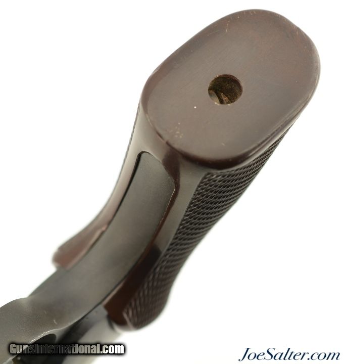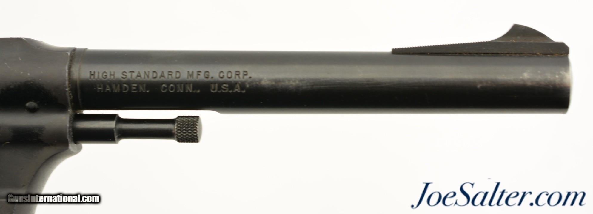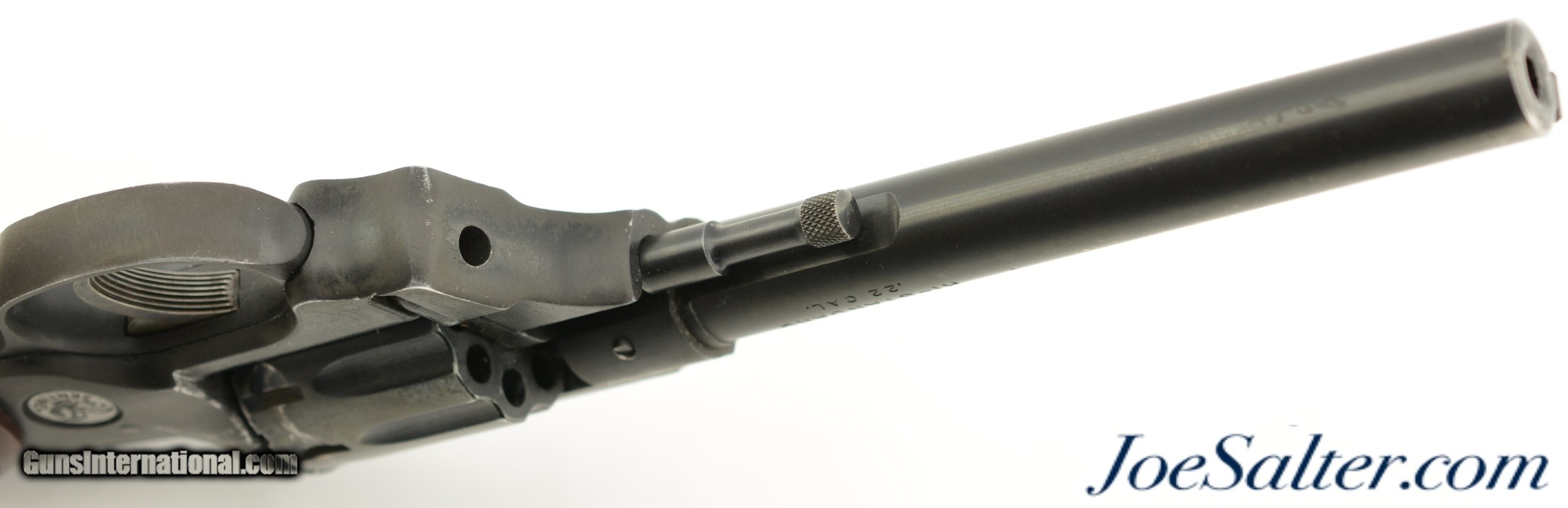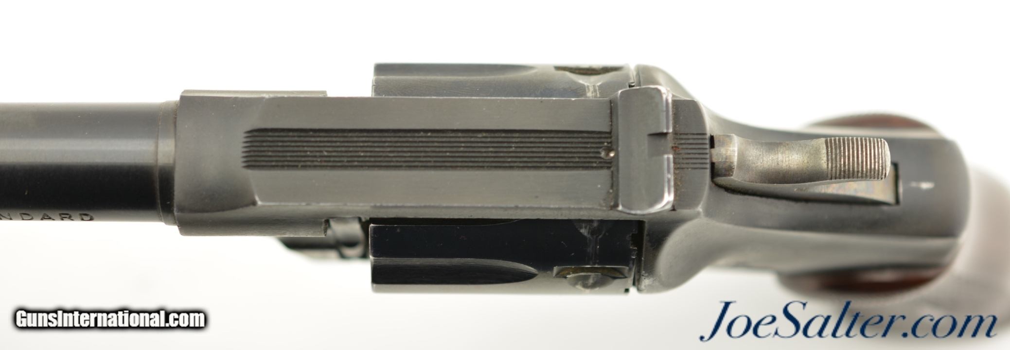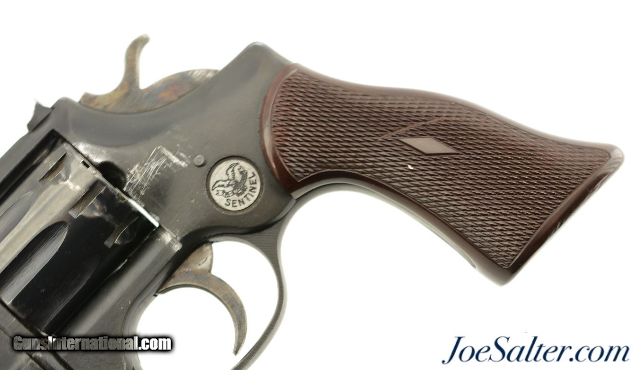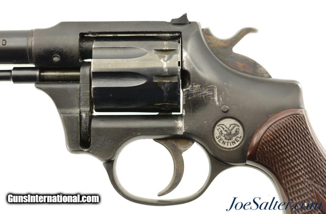 Description: Serial #574982, .22 LR, 6 inch barrel with a bright, excellent bore. This is the Sentinel revolver Model R-101 series manufactured by Hi-Standard featuring a nine shot cylinder with fixed target style sights. The steel barrel and cylinder retain about 85-90% original blue finish thinned on the sides from holster wear with the anodized alloy frame showing slightly less amounts of finish, 80-85% with prominent scratches on the left from the ejector. The trigger and hammer show muted case-color and the brown square butt plastic grips are excellent with light use marks. Mechanically the gun functions properly, times correctly and locks up tight. FFL or C&R SOLD Curio/Relic: Yes |