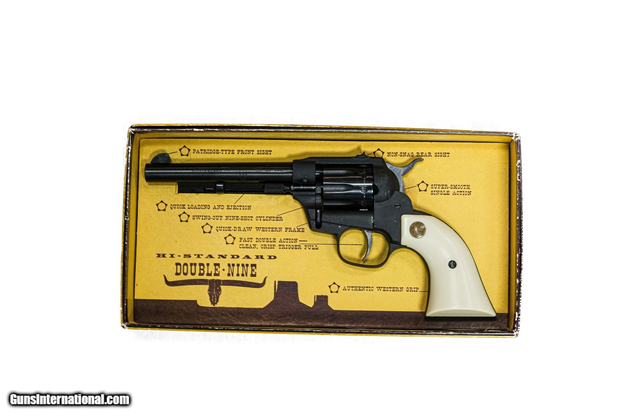 Description: Hi Standard - Double Nine Model W-101, .22 Caliber. 5 ½” Barrel. Faux ivory grips, mint condition, includes factory box, and literature, available for immediate delivery. S & H - $50.00. Inv: 81351 $559.00 SOLD |