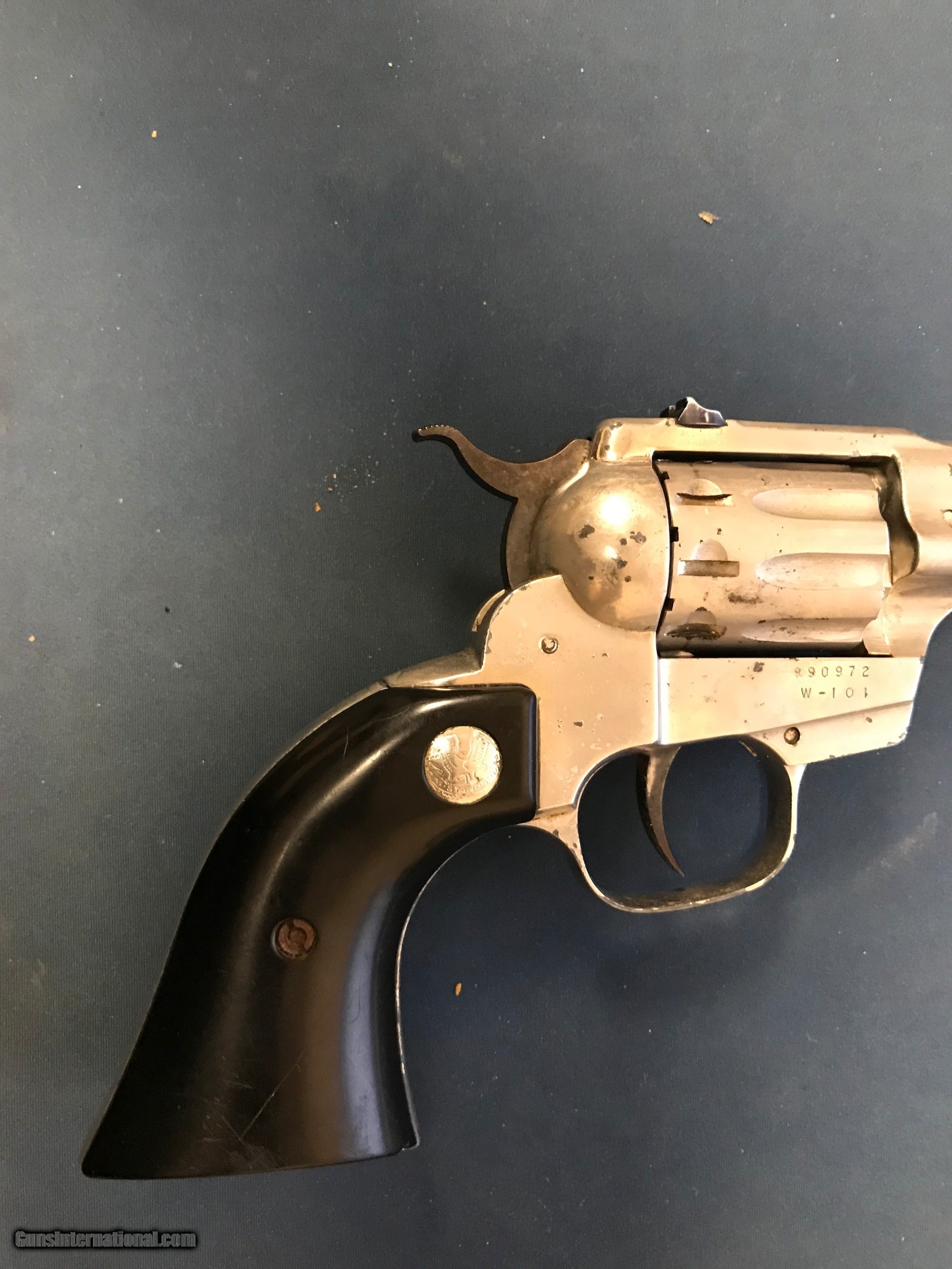 Description: Guns Listing ID: 930627 According to our rating scale I would Rate this gun \"Good\". I have taken multiple pictures to show the condition of it. We want you to get the best impression of it. With the hopes when you get it, that it is better than what you thought. 100% working order. Some scratches and dings Wear on plating Comes with gun only. The bore I would rate 7.5 out of 10. If I had to rate the firearm in condition I would say 6 out of 10.(Please see my pictures for a better detailed idea), Please see all Photos for a very detailed Description of condition. We rate firearms using these condition standards, for modern firearms. NEW-A gun given a grade of \"new\" looks just as it did when it left the factory and has never been sold at a retail store. PERFECT-A “perfect” gun is literally as good as new, although it may have been sold in a retail store. EXCELLENT-An “excellent” rating means the gun appears to be in perfect condition but may have had minor use. VERY GOOD-A “very good” firearm is perfect mechanically but may have minor cosmetic blemishes. GOOD-A rating of “good” indicates that the gun is in proper working condition but may show signs of wear. FAIR-A “fair” firearm may or may not be in safe working order. It has not been test fired, only visually inspected. It may need repair or maintenance. UNRATED-Unrated condition means this firearm has not been test fired, it may function perfectly or it may be in need of repair. Cosmetically it may be in very good to fair condition. You will need to look at the pictures and ask questions SOLD Manufacturer: HI-STANDARD Model: DOUBLE-NINE W-101 Caliber Info: .22 CAL Condition: Used - Non-Certified Barrels: 5.5 BARREL Finish: SILVER |