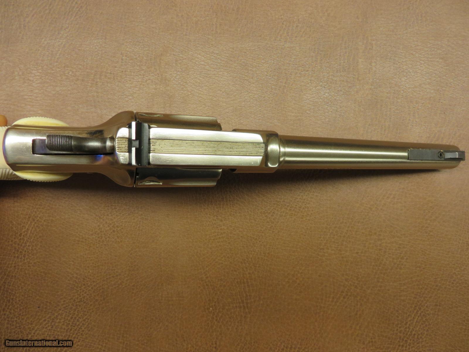 Description: .22 Long Rifle 9 shot double action revolver with swing out cylinder has 6 inch barrel with drift adjustable rear sight. Bright nickel finish is 98%. One piece white checkered plastic grip has a hairline crack on bottom. SOLD |