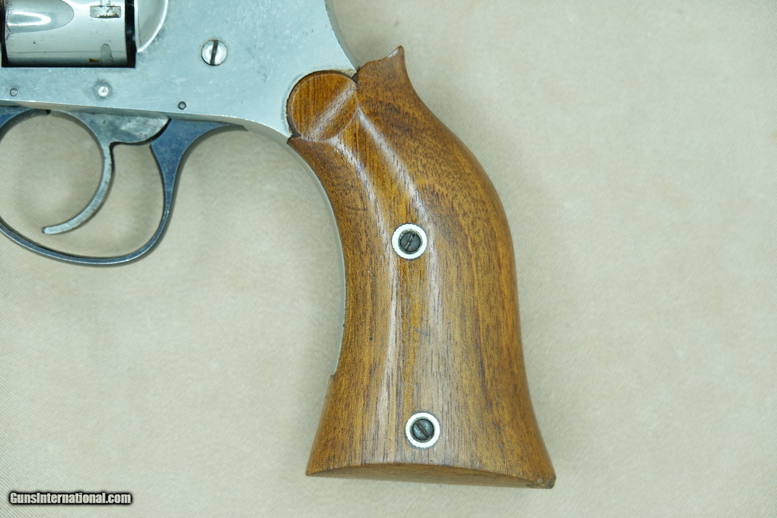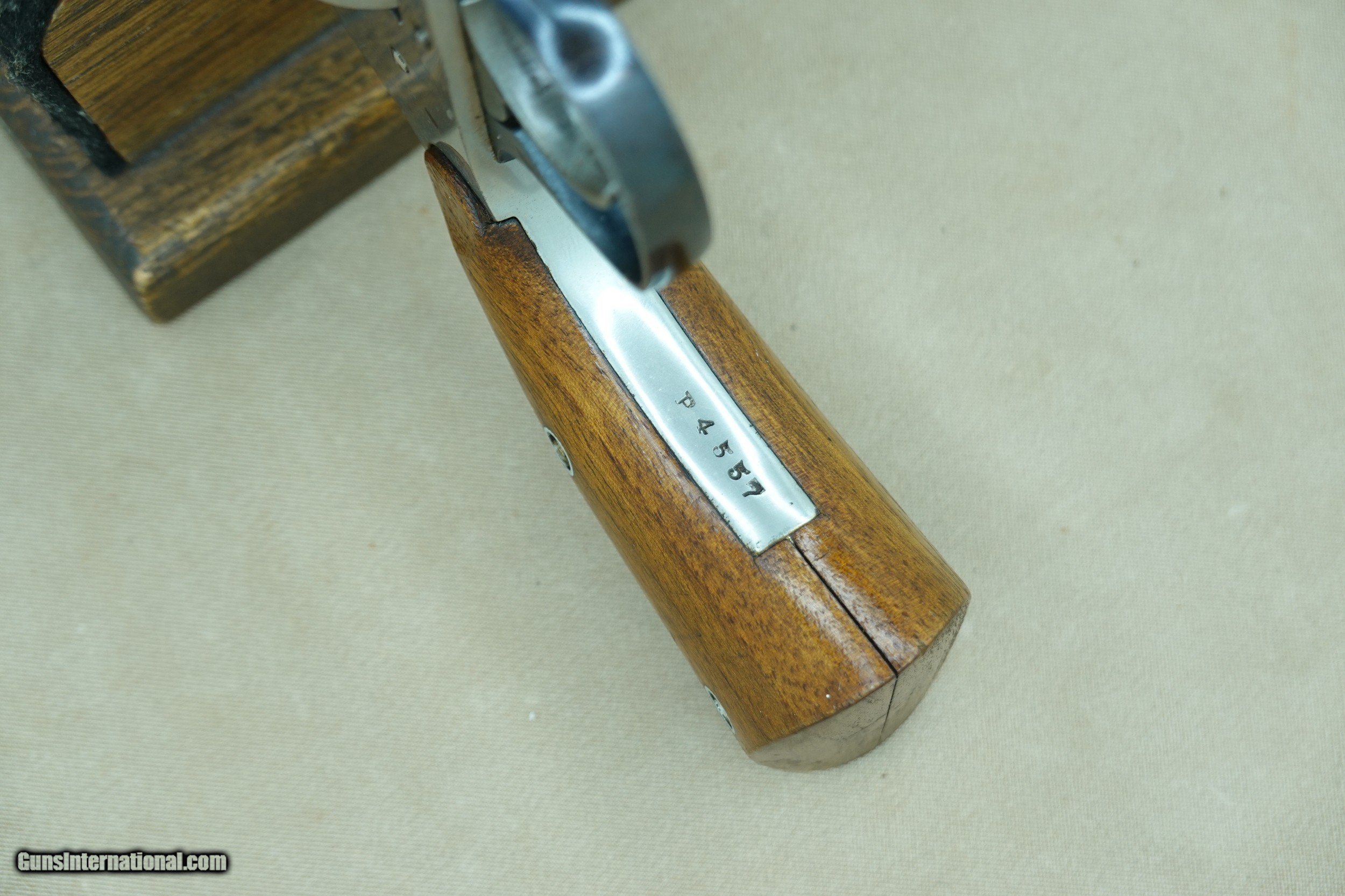 Description: This is a very cool and unusual vintage Hopkins & Allen Triple-Action Safety Police Hammerless double-action only revolver in .32 S&W complete with a period leather holster. Unlike most of the Hopkins & Allen Triple-Action Safety Police revolvers made, this example is a hammerless model with a nickel plated finish, a 4" inch barrel, and factory Walnut target grips. This top-break revolver was introduced in 1908 by Hopkins & Allen as their "flagship" model with the firm's new lock mechanism. Offered in two frame sizes and chamberings of .22, .32, and .38 caliber, this model was fitted with a barrel ranging from 2" to 6" inches in length and was normally fitted with hard rubber grips. As mentioned before, most of the Triple-Action Safety Police revolvers were DA/SA with an exposed hammer and a short barrel, but H&A did make small numbers of the DA-only hammerless variations. These revolvers were very nicely built with top quality materials, excellent fit and finish, and a large amount of hand-fitting and tuning. They quickly became recognized as one of the best top-break revolvers made by any of the firms at that time, and remain highly regarded by collector's today. This particular example is serial number P4557, likely made sometime in the last 4 years of production. It is a very nice all-original example that is exactly how it left the factory, it has not been modified or "improved" in any way. As mentioned before, it is a scarce variation in that it has four major things going for it; it is a hammerless DA-only model, it has a factory nickel plated finish, it is fit with a factory 4" inch barrel, and it is fit with factory Walnut "Target" grips. All four of these features are in the minority when compared to overall production. This Hopkins & Allen is in very good condition overall with perfect mechanics. The factory nickel plated finish is still bright and clean, showing only some very minor spots of marring and plating loss. The original blue finish on the triggerguard, top latch levers, and ejection star is in great shape, and the original case colors on the trigger still show some color on the sides. All of the factory markings are crisp and clear, and all of the serial numbered parts are matching and original. The bore in the 4" inch barrel is in excellent condition with perfect rifling and no visible pitting or erosion. The five chambers of the cylinder are in great shape as well, free from any major defects or pitting. The special-option factory Target grips on this Safety Police are in beautiful shape, free from any cracks, repairs, or major damage. Outside of a little minor damage to the rear edge of the butt both grip panels are clean and all of the factory finish is still intact. The grips match each other perfectly in every way and fit perfectly on this revolver with no wiggle or play in them. Both original grip screws as well as the 4 escutcheons are in excellent condition. The action on this little H&A Safety Police Hammerless is incredibly smooth and precise, and it turns in perfect time no matter how fast or slow you pull the trigger. All of the controls on this revolver are in perfect working order, including the spring loaded top latches and the automatic ejector. We have no doubt that this H&A Triple-Action Safety Police Hammerless would still function just as well today as when it left the factory more than 106 years ago. As you can see from the pictures, it comes with an original period leather holster that we acquired it in, maker unknown. If you have been looking for a neat vintage .32 S&W revolver for your collection that you are unlikely to run across again, this Hopkins & Allen would be an excellent choice and should continue to be a great long-term investment. SOLD Curio/Relic: Yes Handgun Caliber: .32 S&W Manufacturer: Hopkins & Allen Model: Triple-Action Safety Police (Hammerless Model) Serial Number: P4557 Barrel Length: 4" Inches Condition: Very Good / Excellent Metal Condition: Very Good / Excellent Wood Condition: Excellent Bore Condition: Excellent Action: Double-Action Only Top-Break Revolver Finish: Nickel Plated / Blued / Case Colored Sights: Fixed Iron Sights Manufacture Date: 1908-1915 |