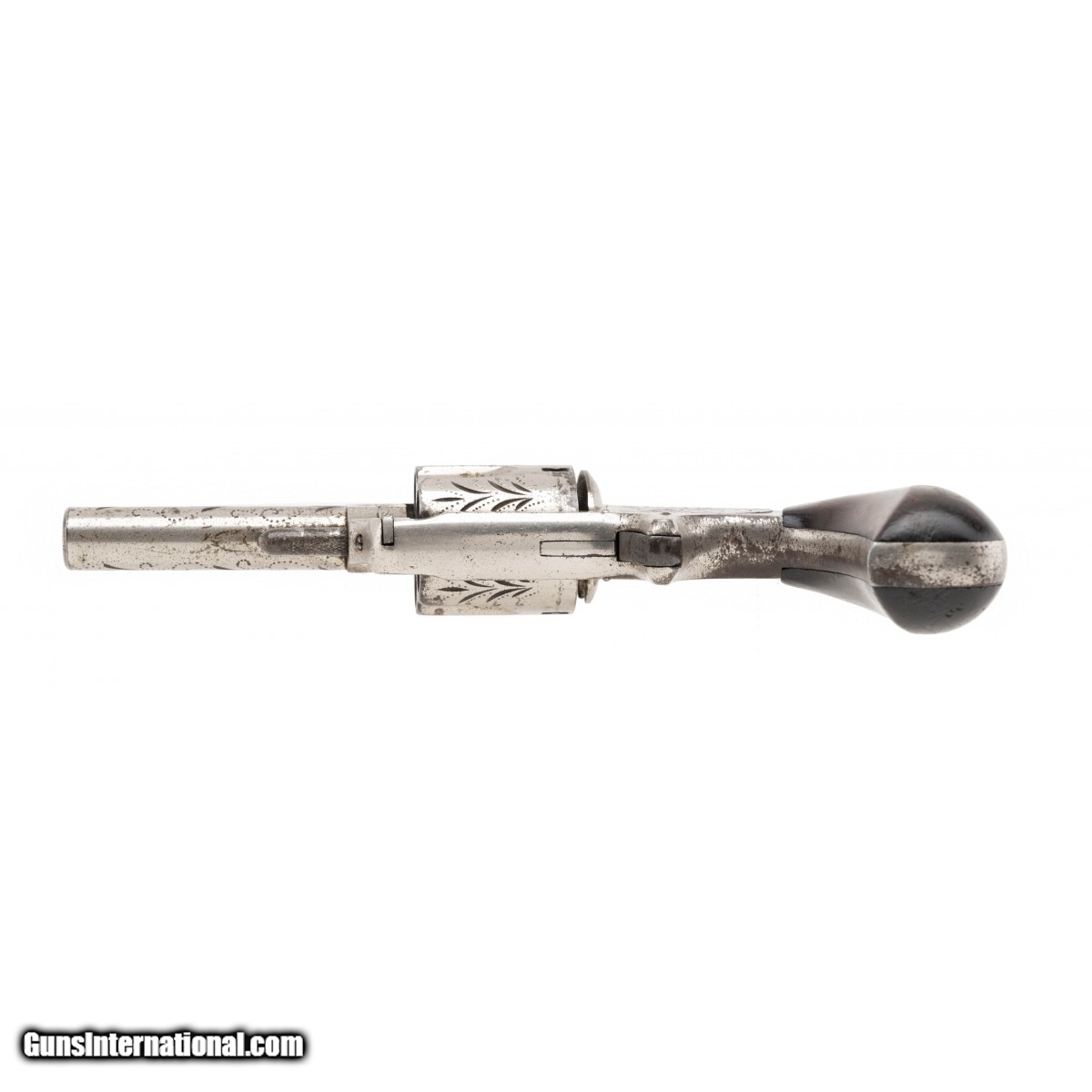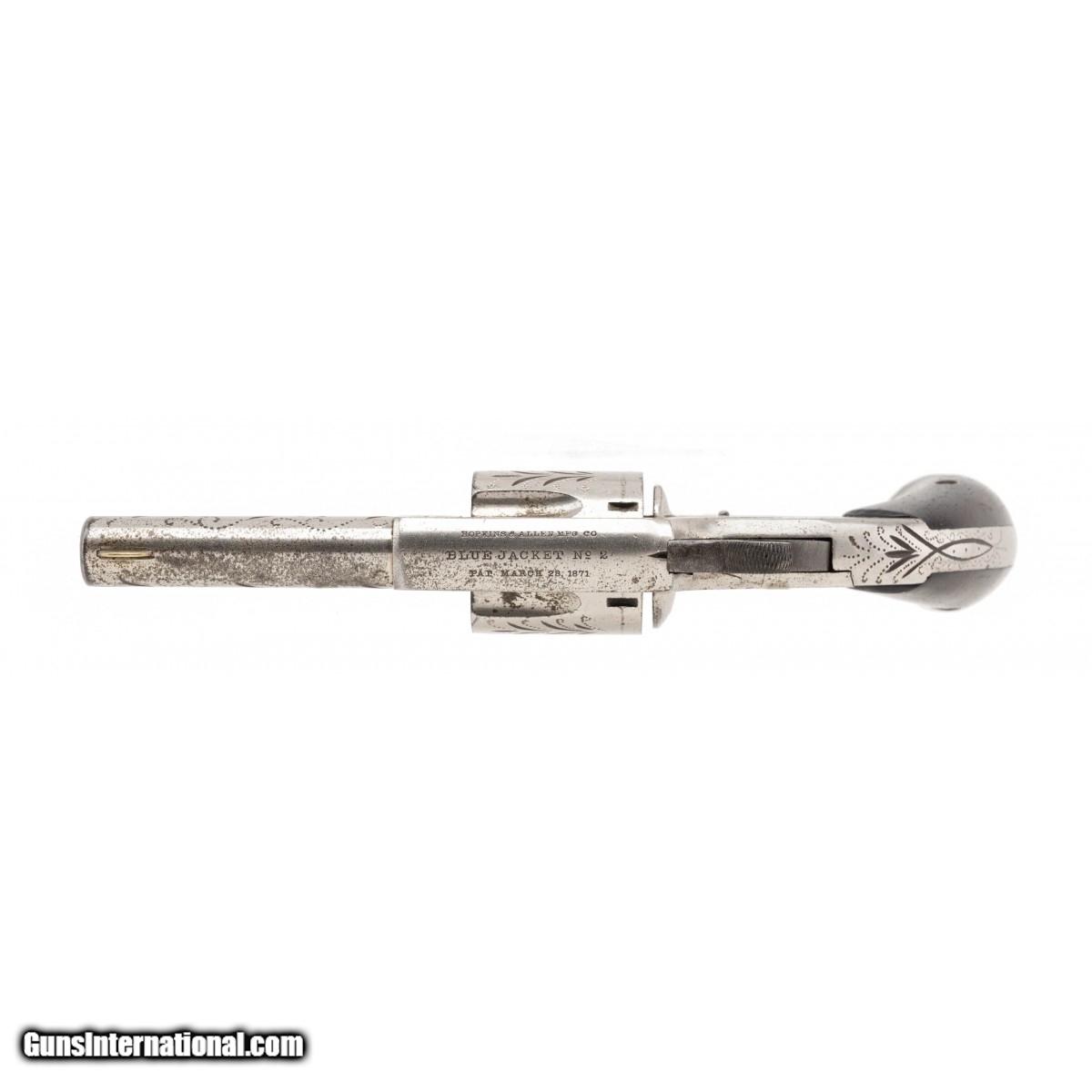 Description: " This 32 rimfire caliber Hopkins & Allen spur trigger fully scroll and dot engraved revolver has approx. 90% of its original nickel finish with much of the loss on the top of the barrel. The 2.75"" round barrel has a good bore with strong rifling and light erosion. The top strap is marked HOPKINS & ALLEN MFG. Co. over BLUE JACKET No 2 over PAT. MAR. 28 1871. The grips are fine with most of their original varnish and no cracks or chips. The action functions properly. This is a nice looking H&A BLUE JAKET No. 3. SOLD |