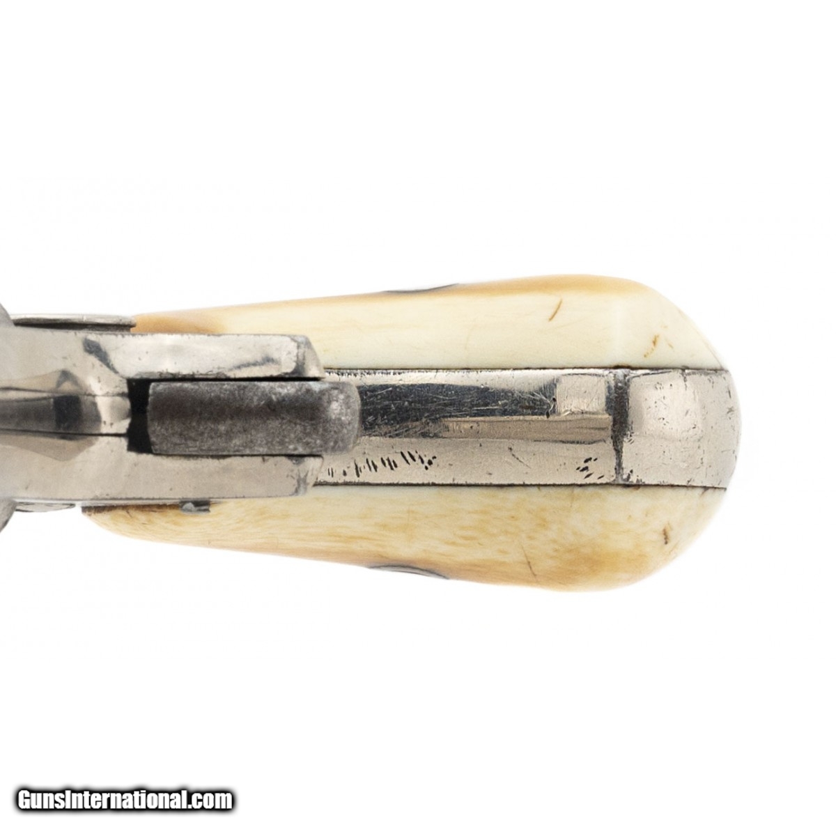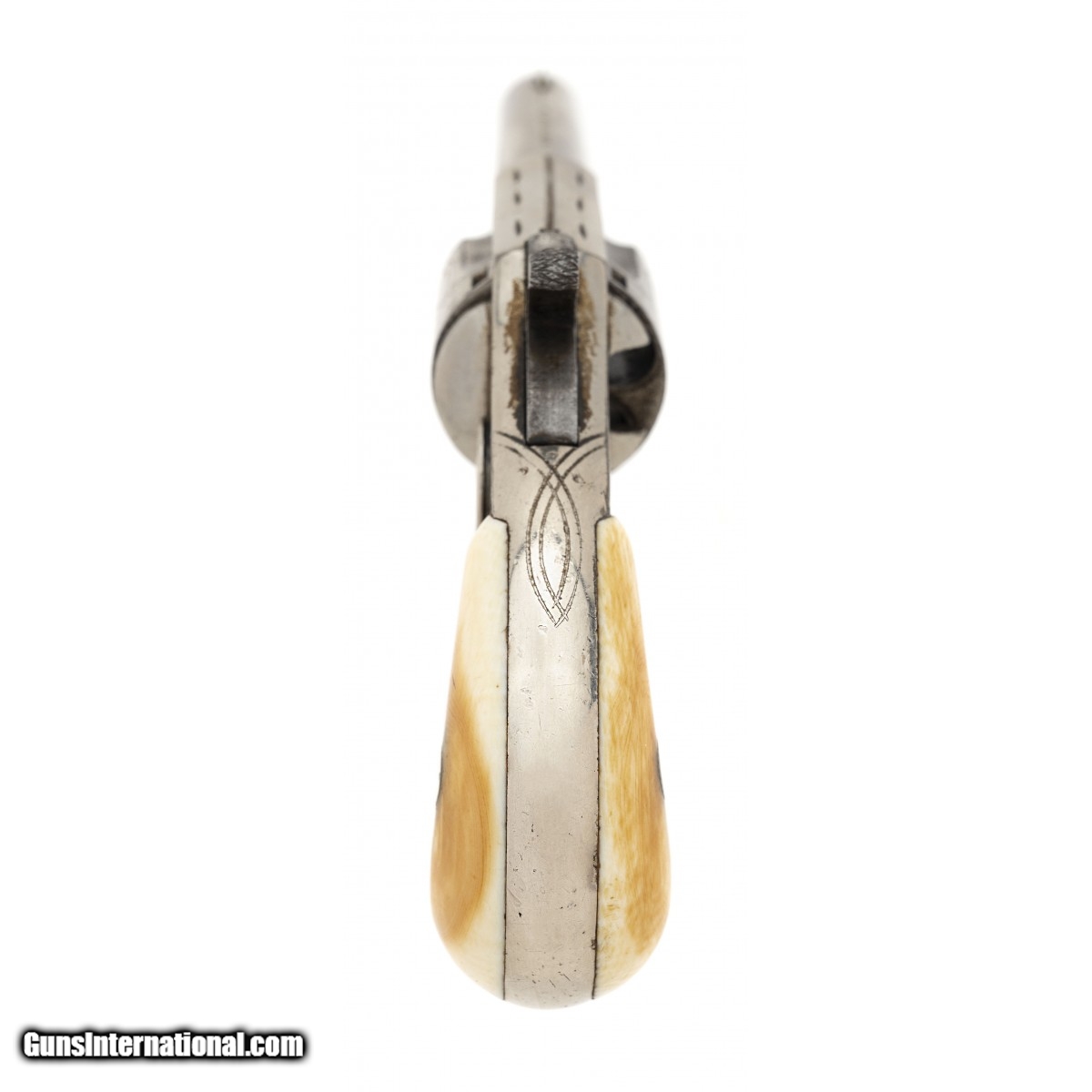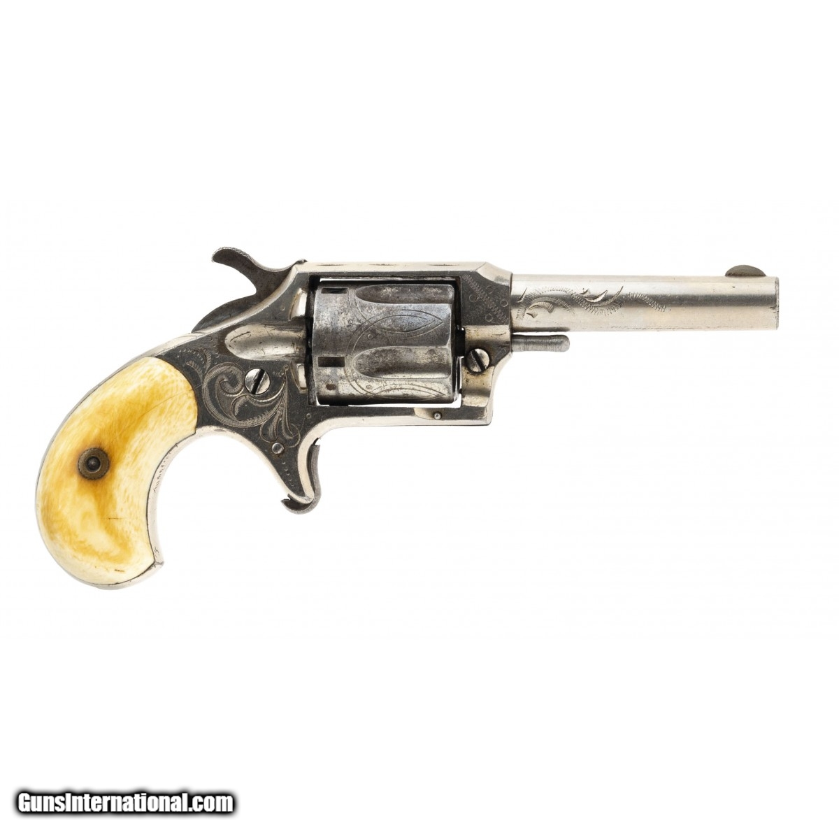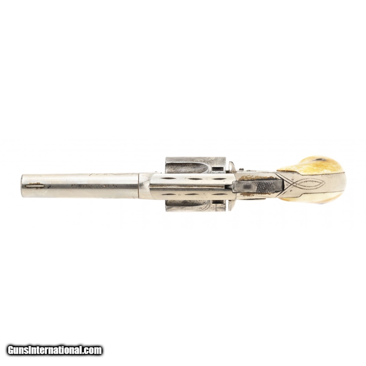 Description: " This 32 rimfire caliber unmarked Hopkins & Allen spur trigger fully scroll and dot engraved revolver has approx. 90% of its original nickel finish with much of the loss on the rear of the cylinder. The 2.75"" round barrel has a fine bore with strong rifling. The top of the barrel is marked RED JACKET. No 8. The composition grips are fine with no cracks or chips. With the exception that the trigger spring is broken, the action functions properly. This is a nice looking RED JACKET revolver. SOLD |