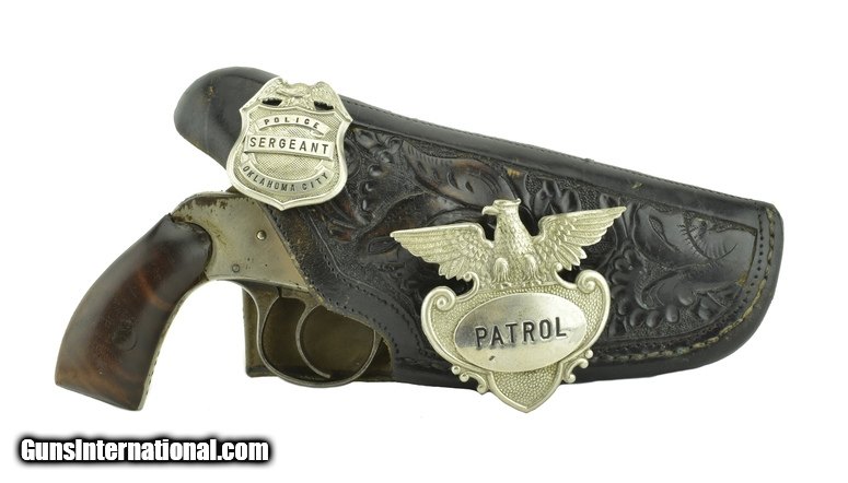 Hopkins & Allen Safety Police .38 S&W caliber revolver. Oklahoma City Police Detective revolver. Holster and badge with letter from the Detective’s Daughter. In the letter she states her father H.L. Bush. Was an Oklahoma City Police Detective in the 1930’s. Action works fine, Bore is very good and comes with a holster and his sergeants badge and his patrol cap badge from before he was made detective.